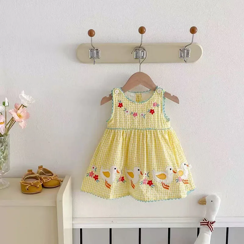 Vestido de bebé de 0 a 4T, sin mangas, tablero de ajedrez, bordado de animales, pato, conejito, Pastel, amarillo, rosa, bonito, delicado, informal, de verano, fácil de usar