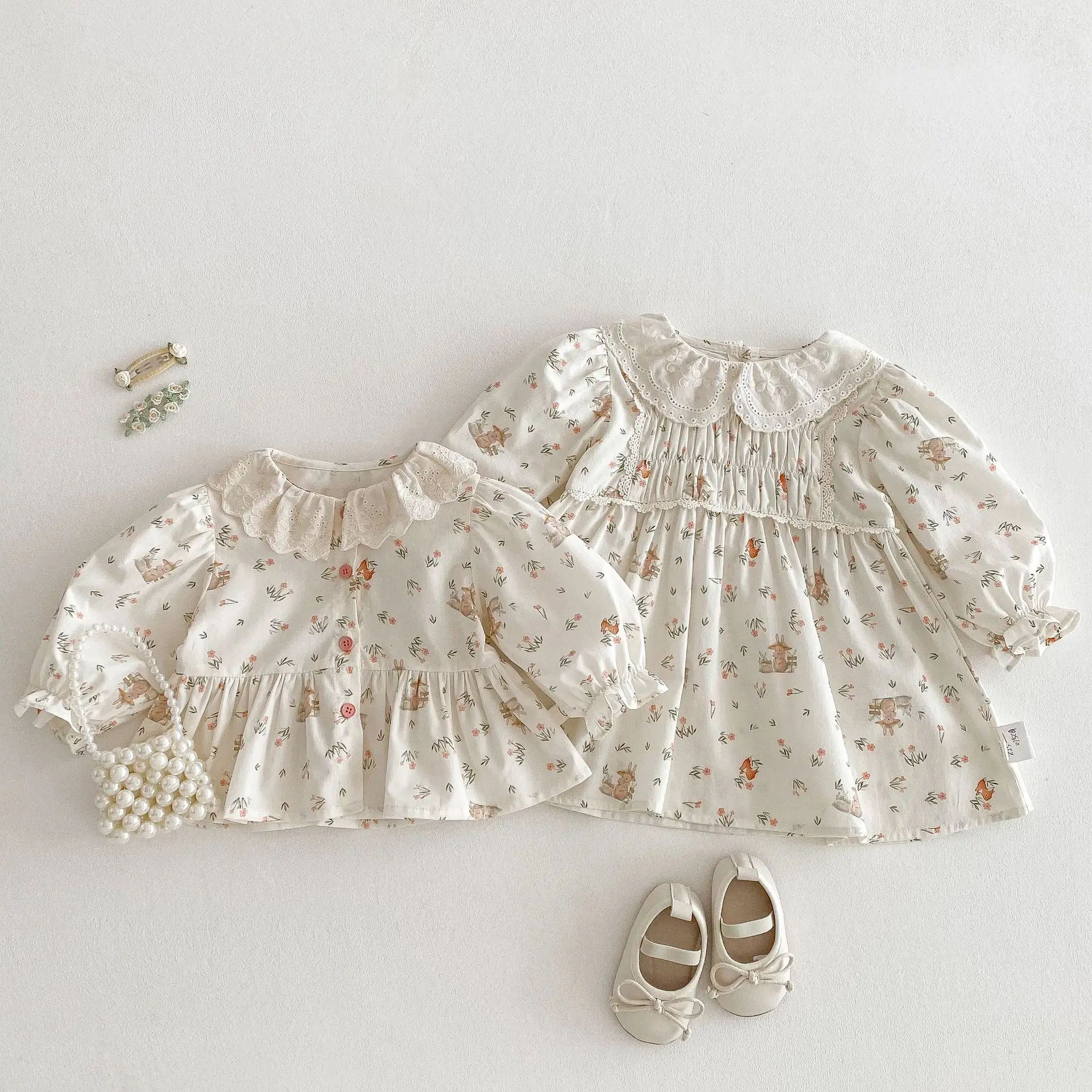 Comprar Vestido bonito para niña, novedad de primavera, vestido de princesa Floral de conejito coreano para bebé, ropa para hermanas, camisa con cuello Peter Pan, pantalones vaqueros con lazo
