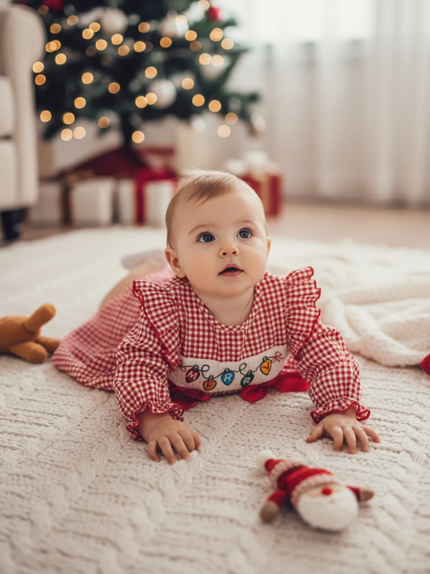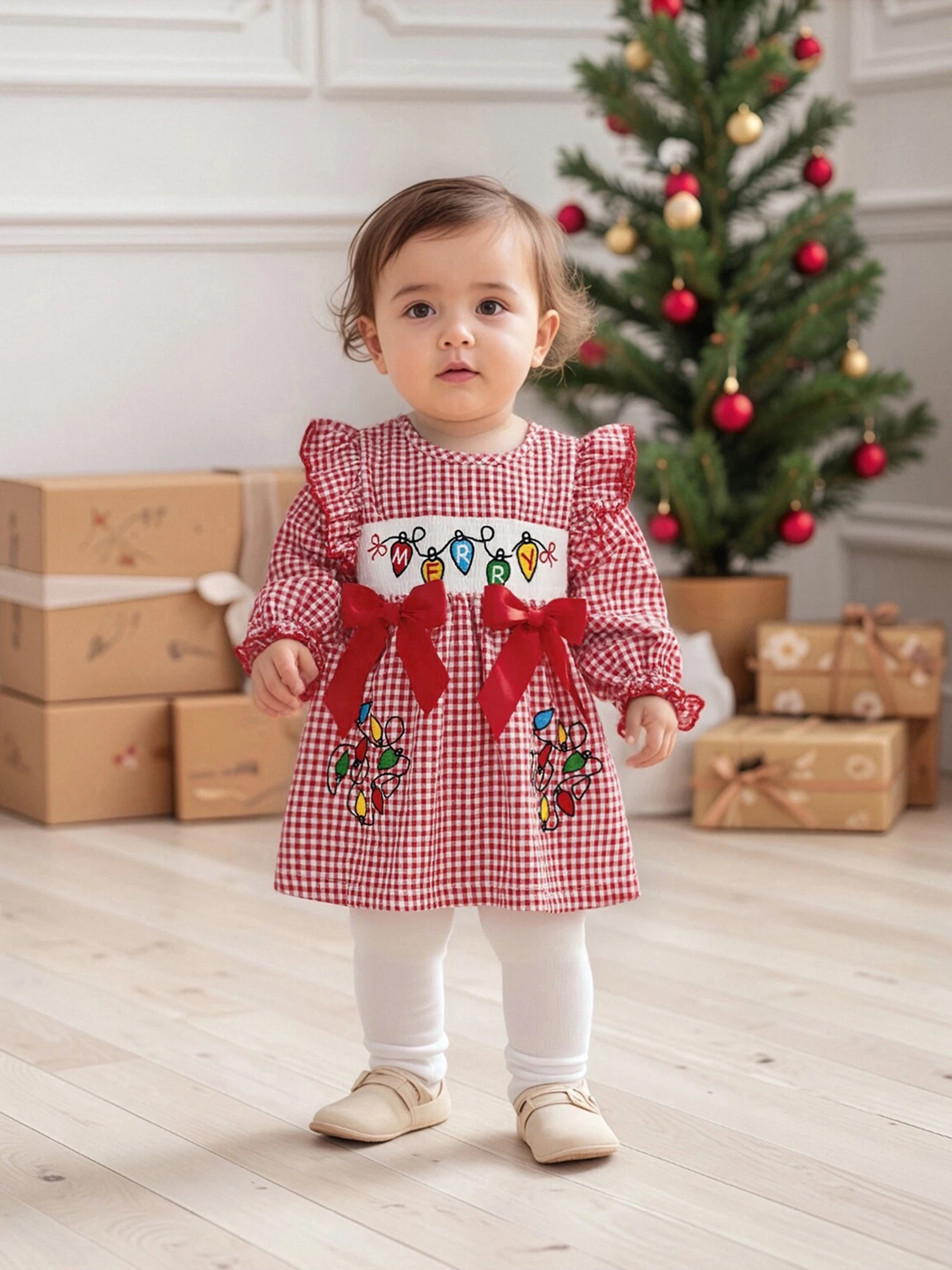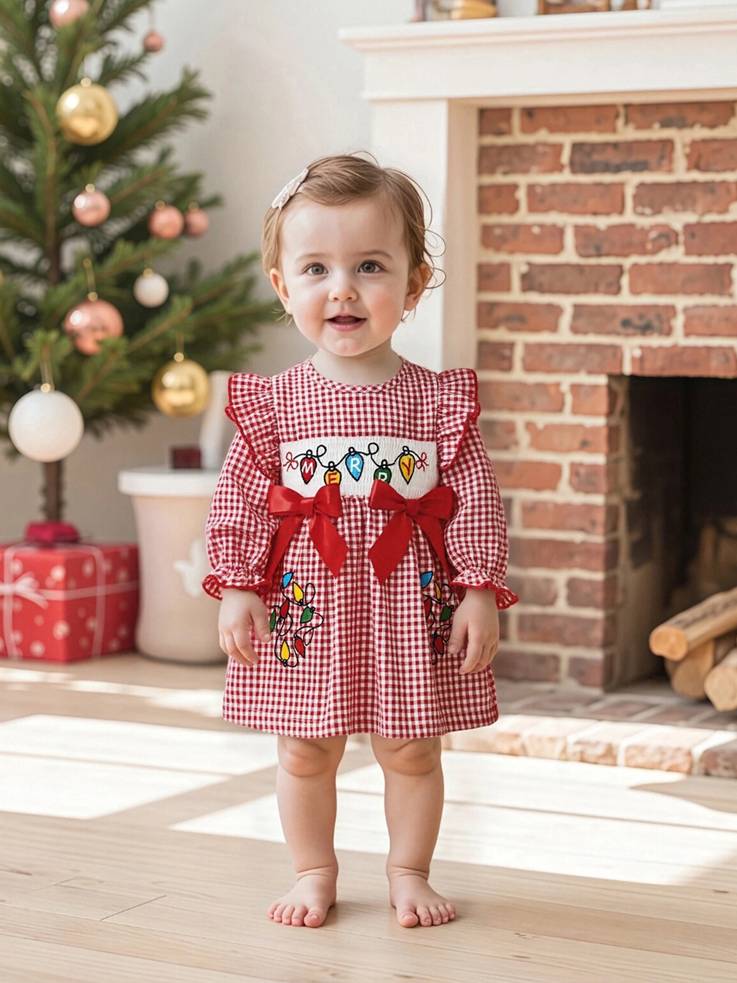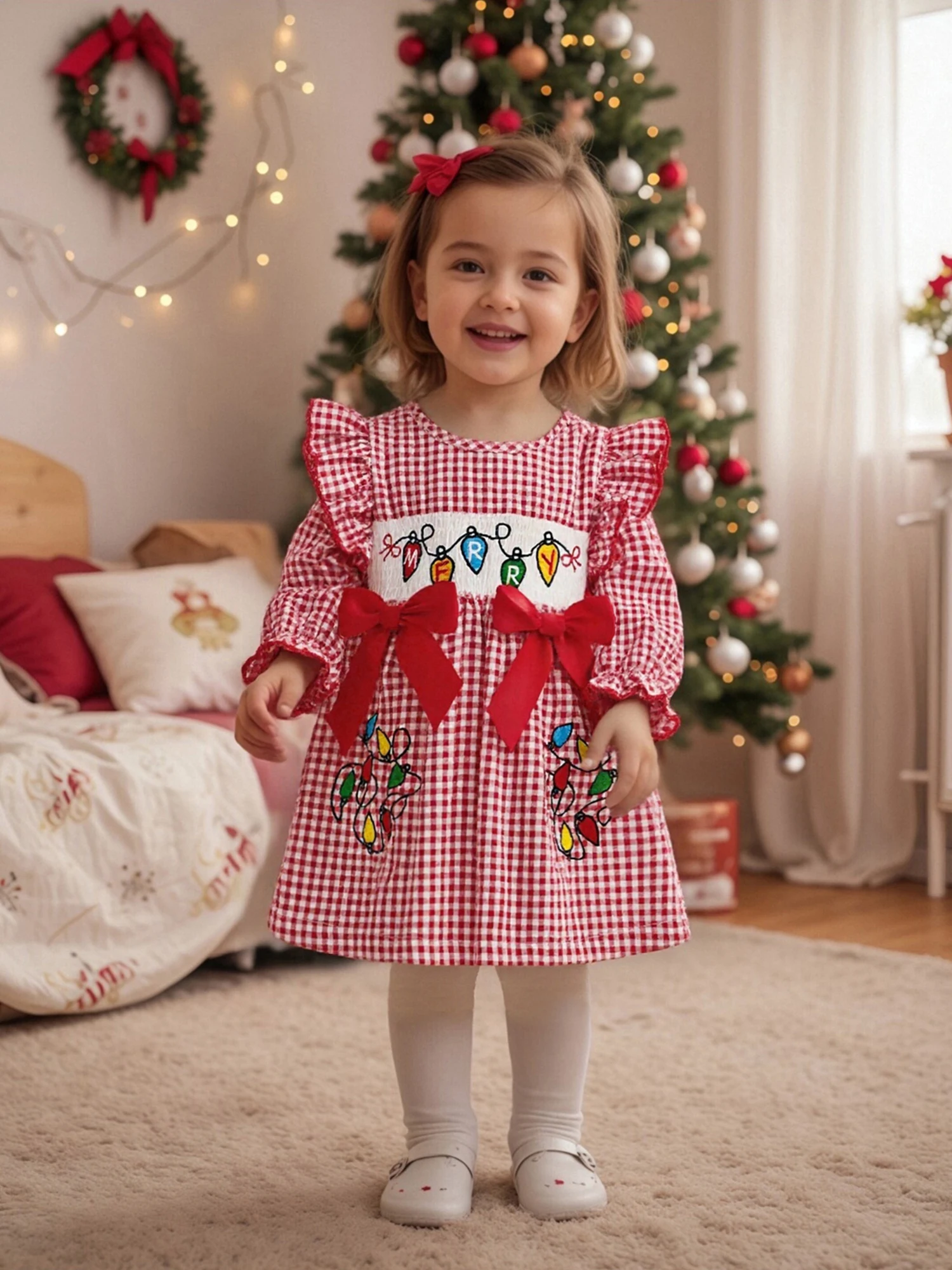 Vestido casual para niñas, manga larga, cuello redondo, bordado a cuadros, otoño, vestido de línea A, disfraz de Navidad