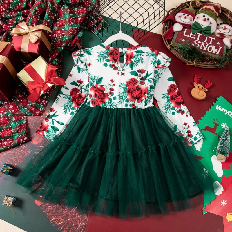 Vestido de fiesta de cumpleaños de Navidad para niñas pequeñas, vestido de princesa de malla de manga larga con estampado Floral para niños de 2 a 7 años