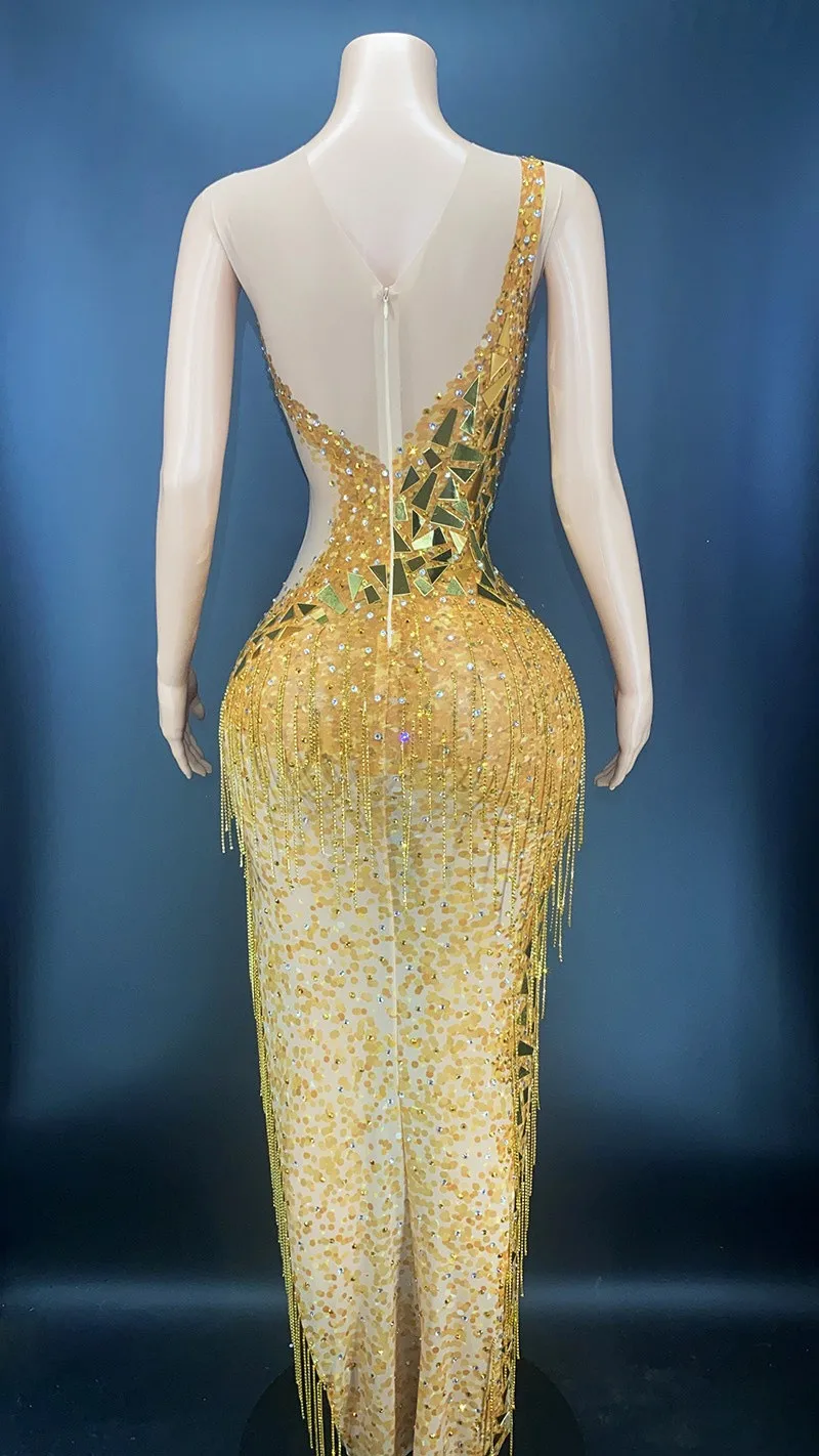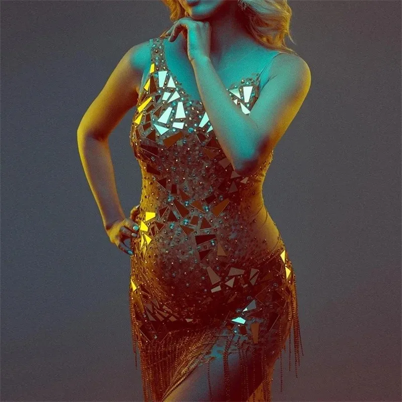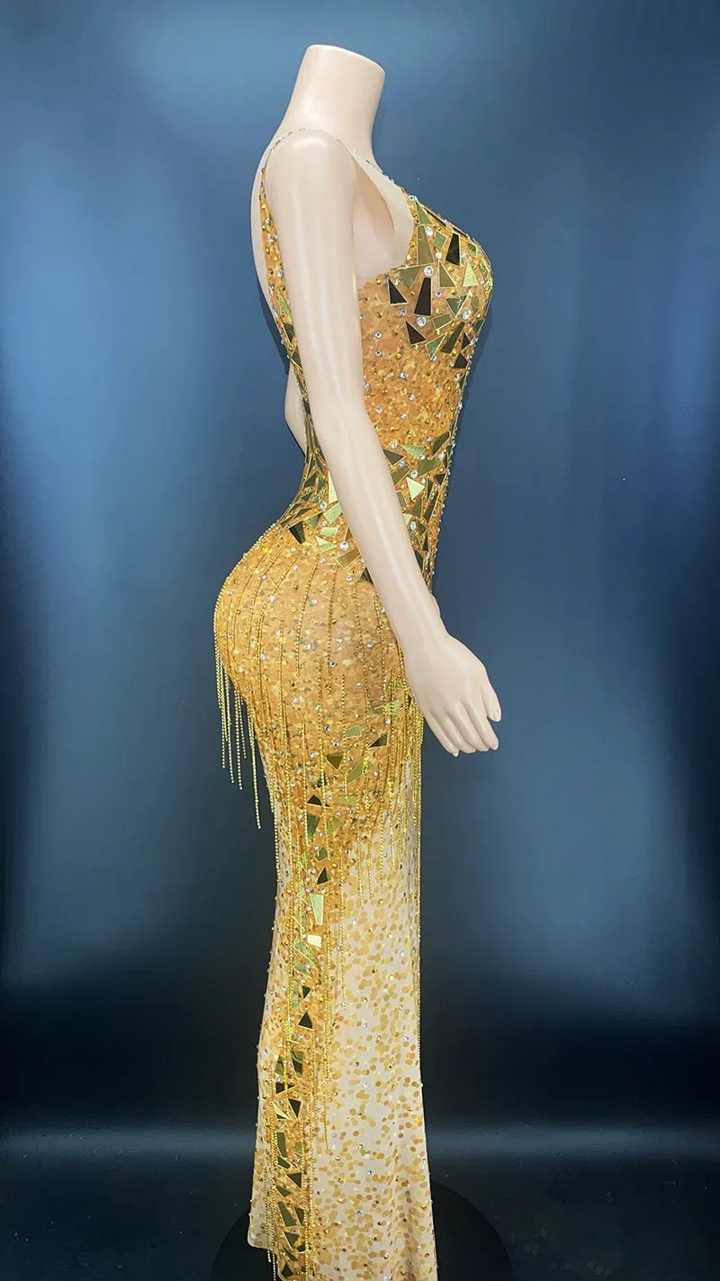 Vestido de fotografía de maternidad con borlas, Sexy, dorado, con diamantes de imitación, espejo, brillo, abertura lateral, accesorios de fotografía para mujer embarazada