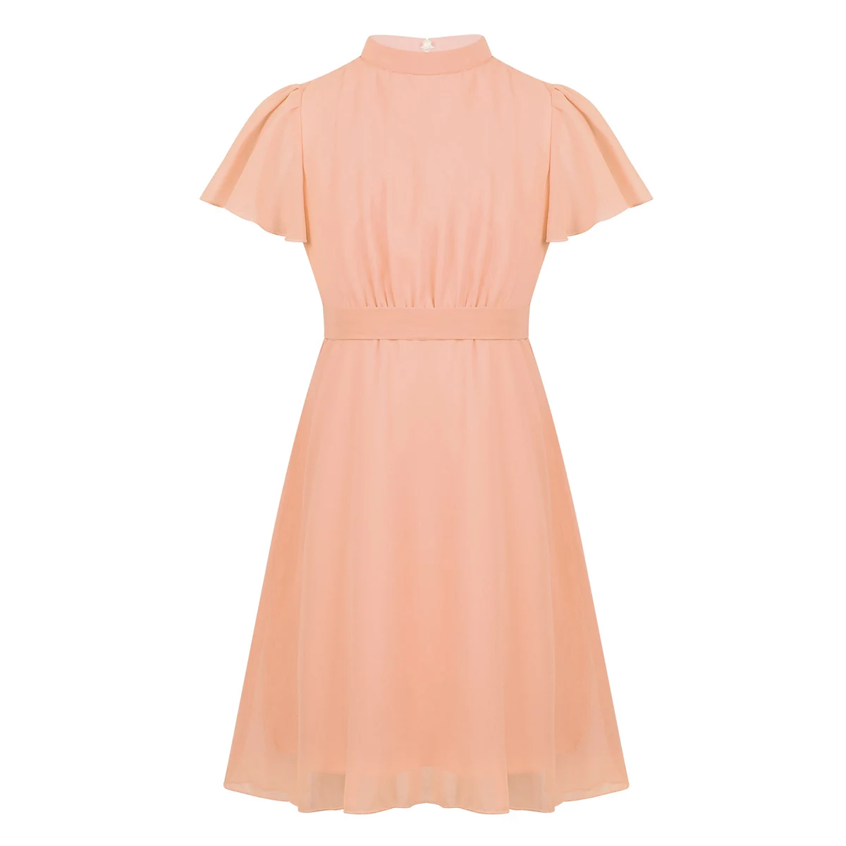 Mangas cortas con volantes, cuello redondo con cierre de botón. Corpiño superior con forro en la parte delantera. Diseño de cintura alta, lazos de faja en la espalda.