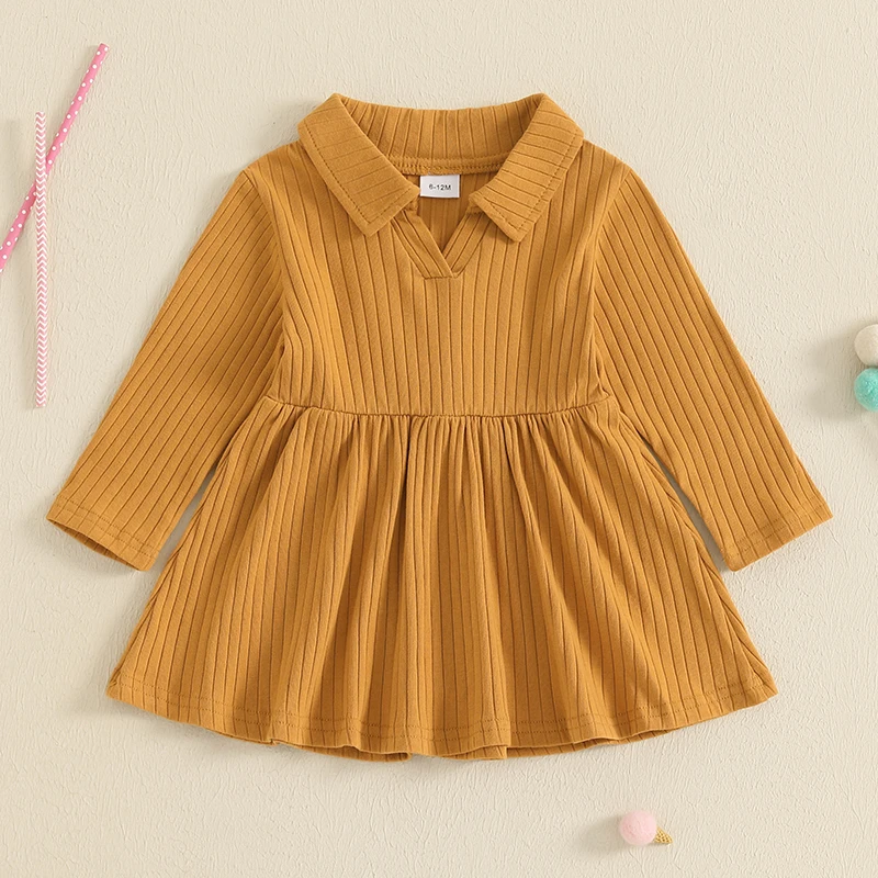 Comprar Vestido informal de otoño para niñas de 1 a 4 años, manga larga, cuello de solapa, Color sólido, acanalado, línea A