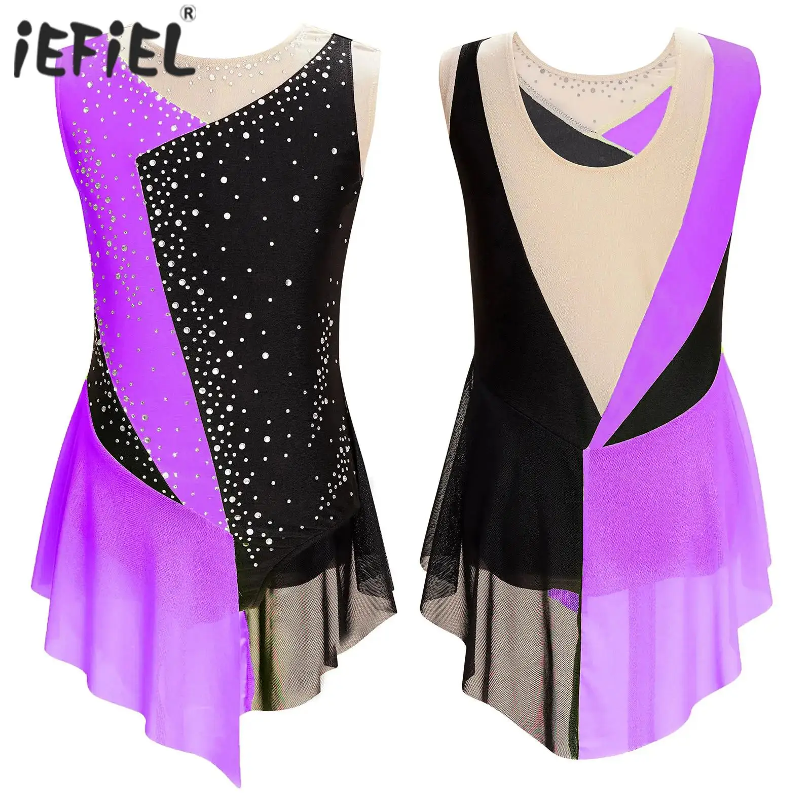Comprar Vestido de leotardo de Ballet para niñas, body sin mangas de malla transparente con diamantes de imitación para baile lírico, gimnasia, entrenamiento, patinaje artístico