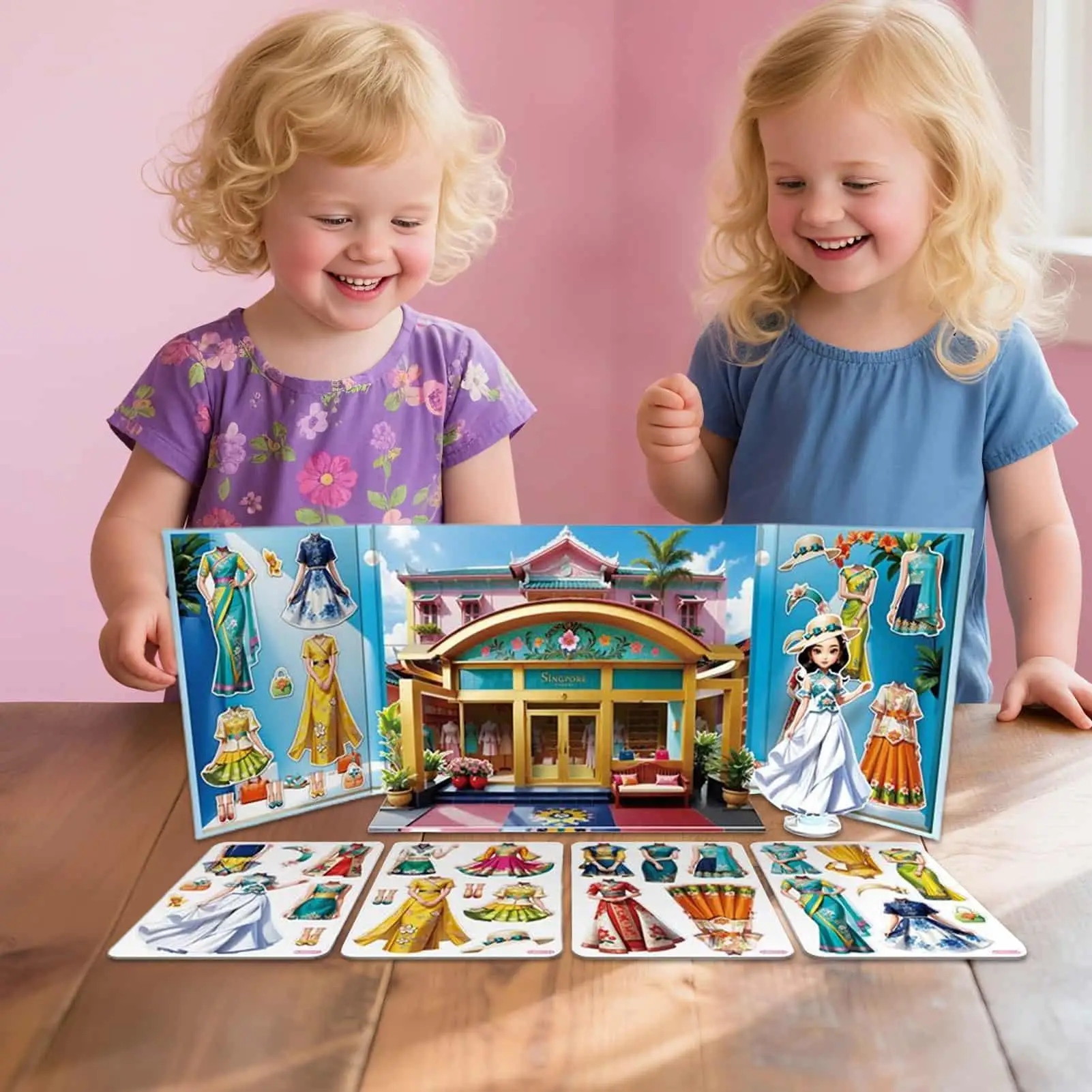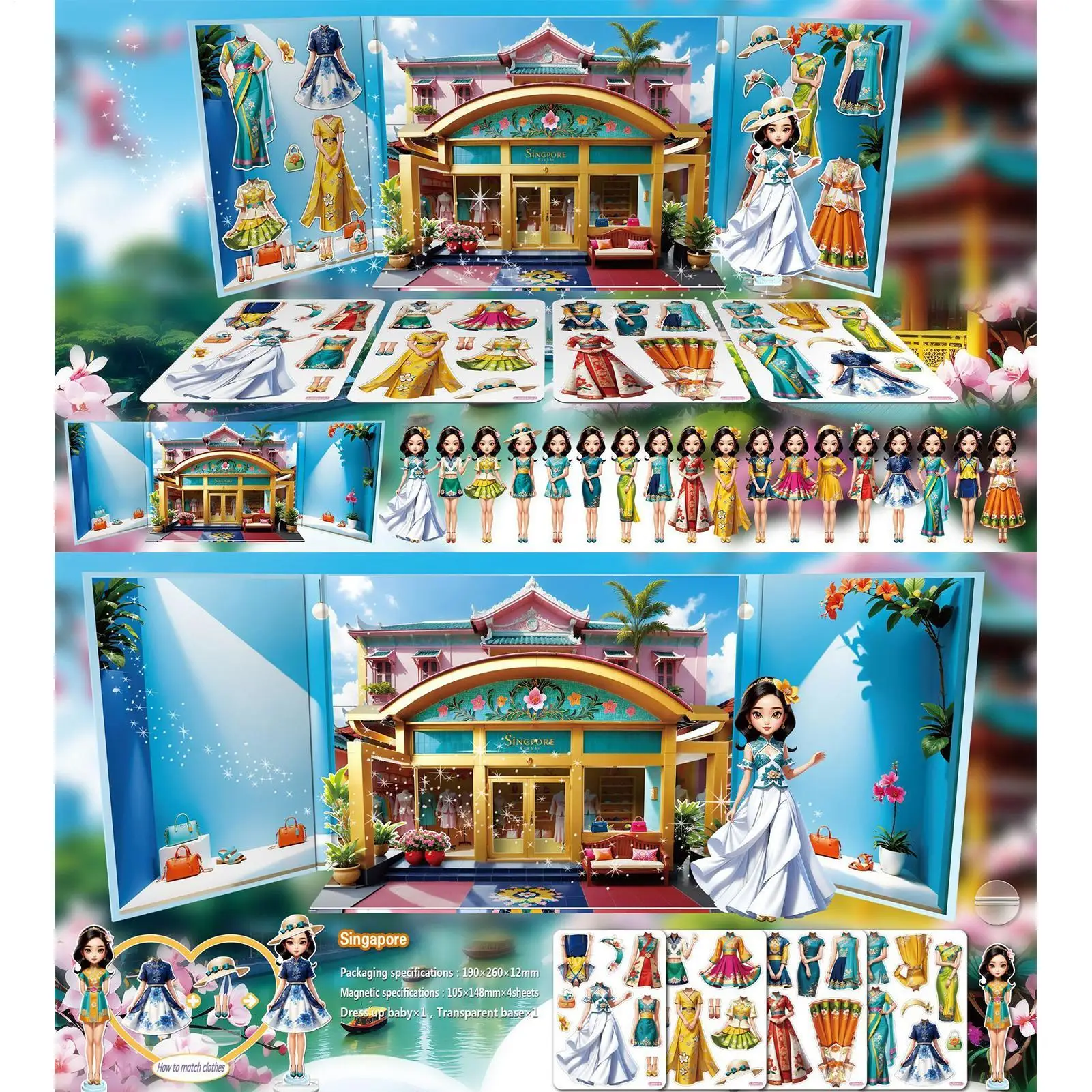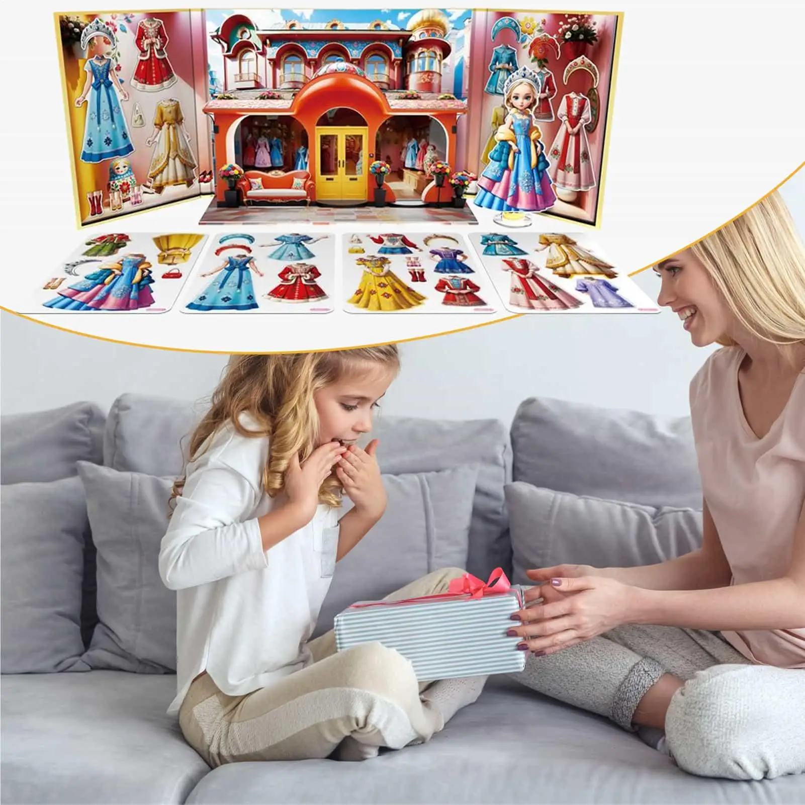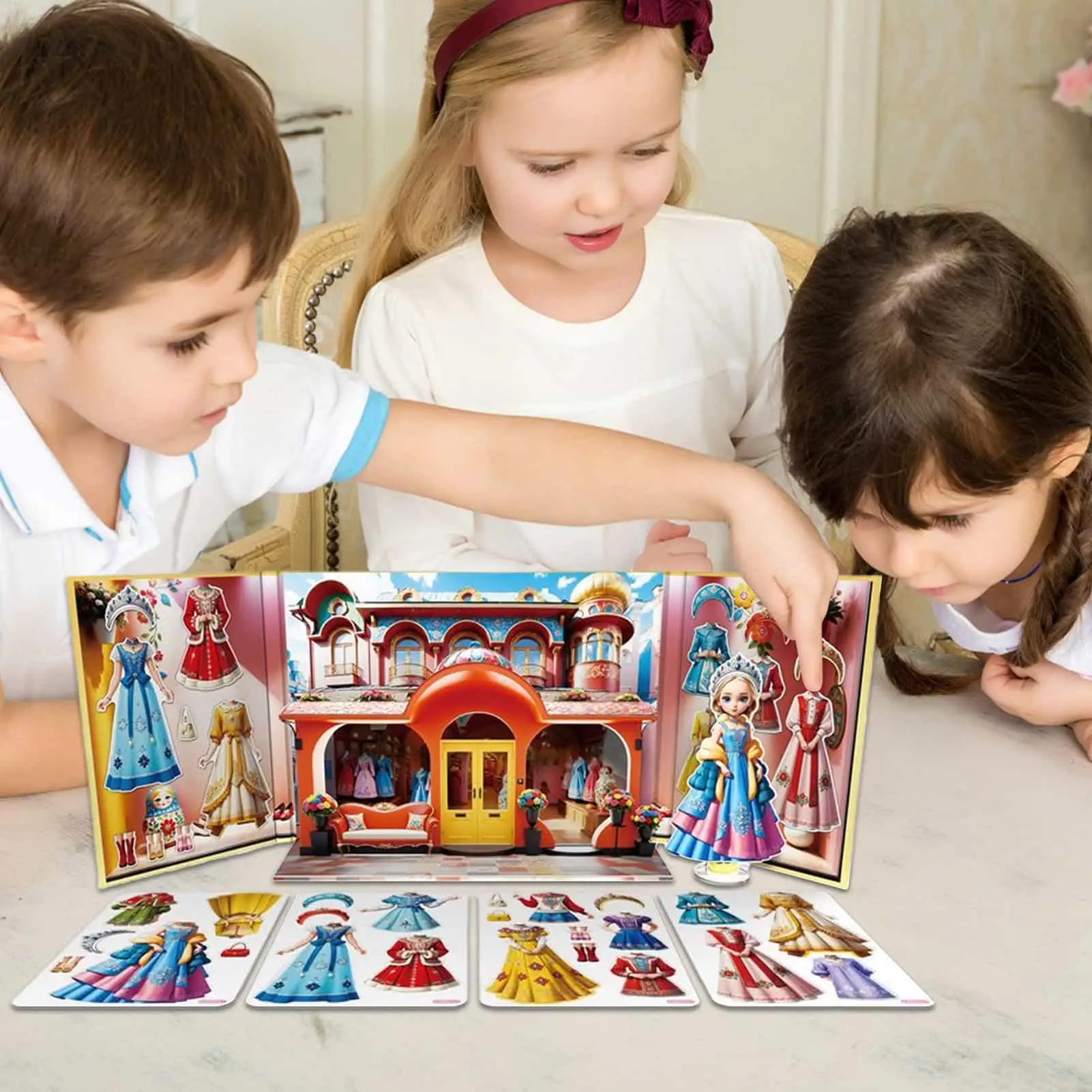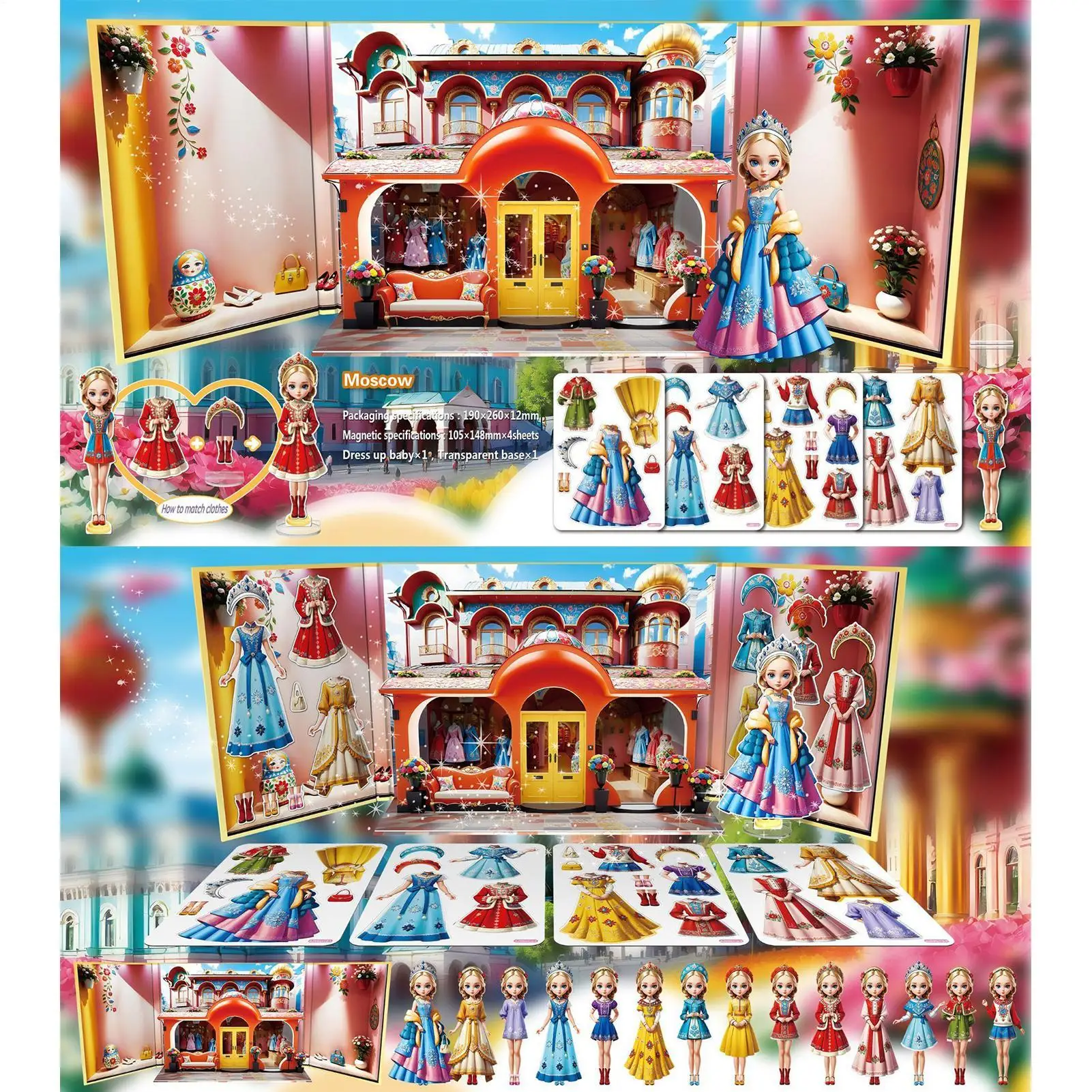 1. Experiencia de juego atractiva: los juegos de disfraces magnéticos con pegatinas de fondo 3D inspiran el juego de simulación creativo, fomentando escenarios de juegos de rol de princesas y al mismo tiempo sirven como juguetes de viaje portátiles para niños.