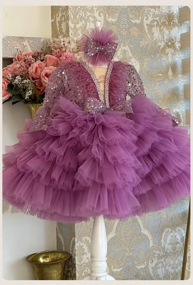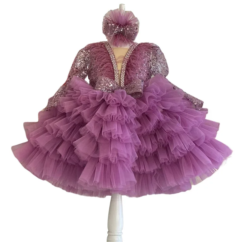 Comprar Vestido de manga larga con cuello en V, vestido de gasa con lentejuelas, desfile de moda para niñas en T, venta al por mayor de disfraces de actuación