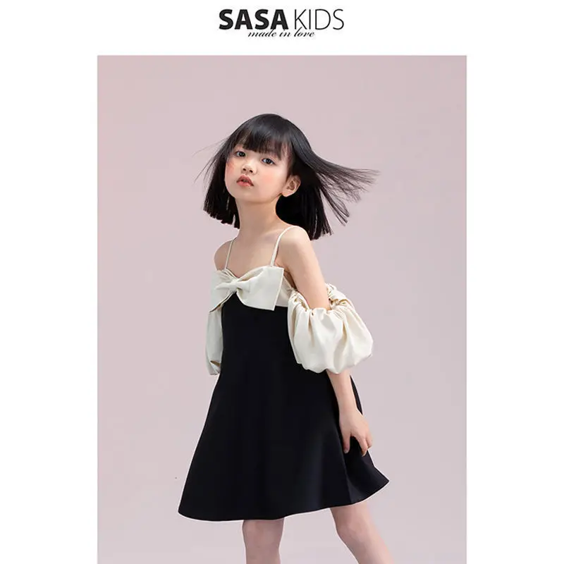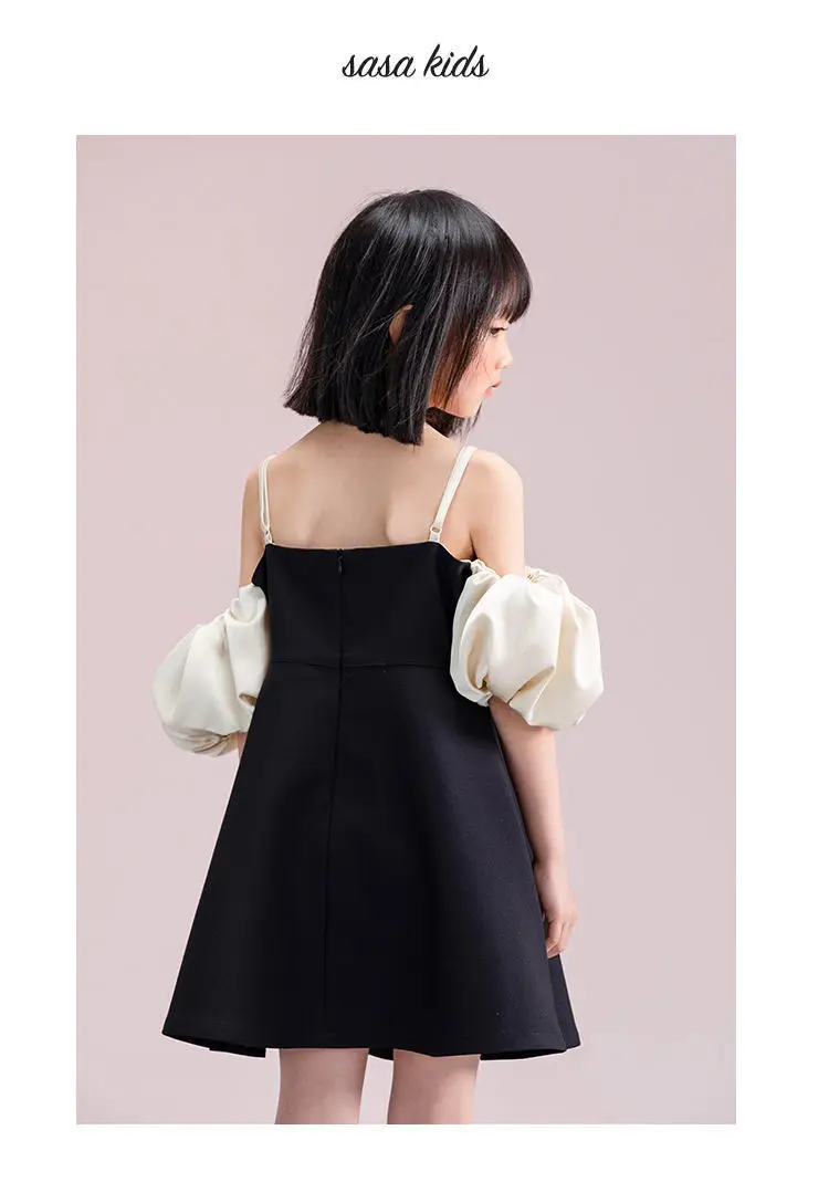 Comprar Vestido negro elegante con lazo y hombros descubiertos para niña, mangas abullonadas, Espalda descubierta, línea A, fiesta de cumpleaños