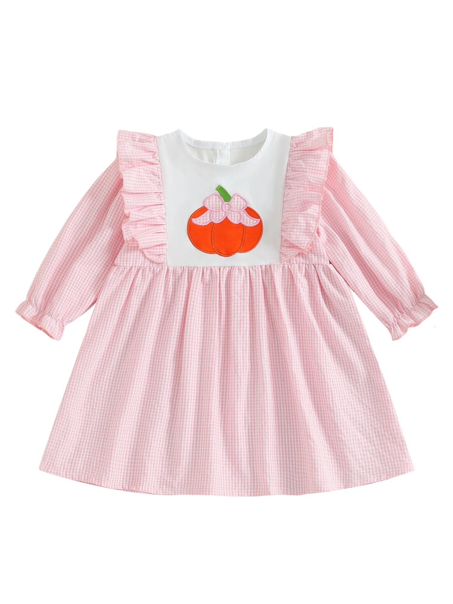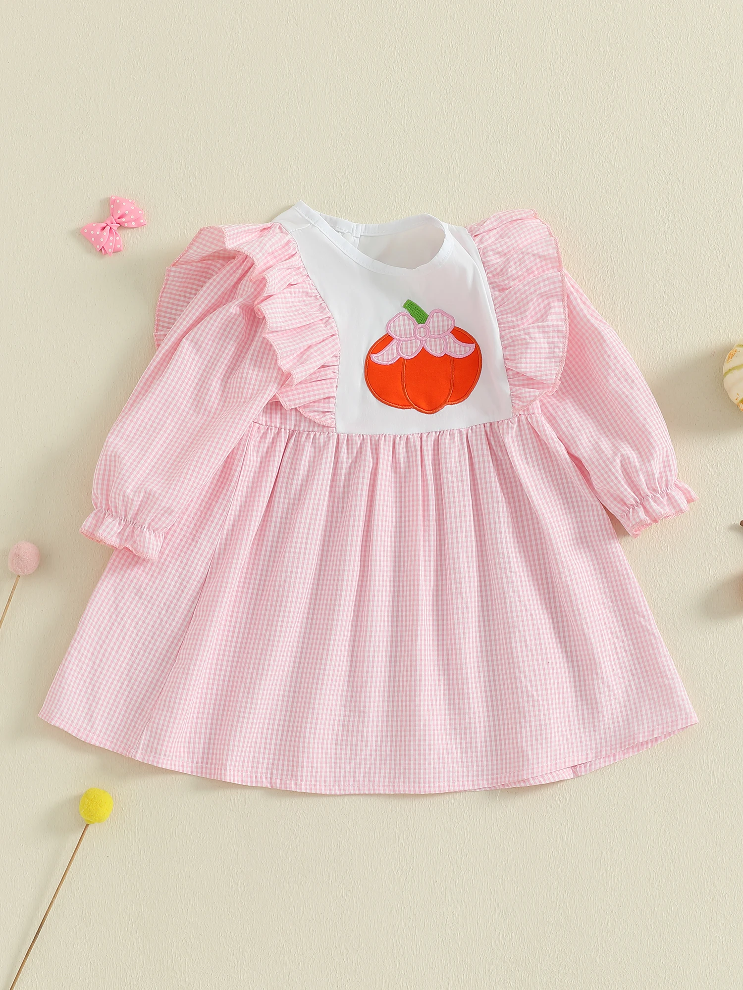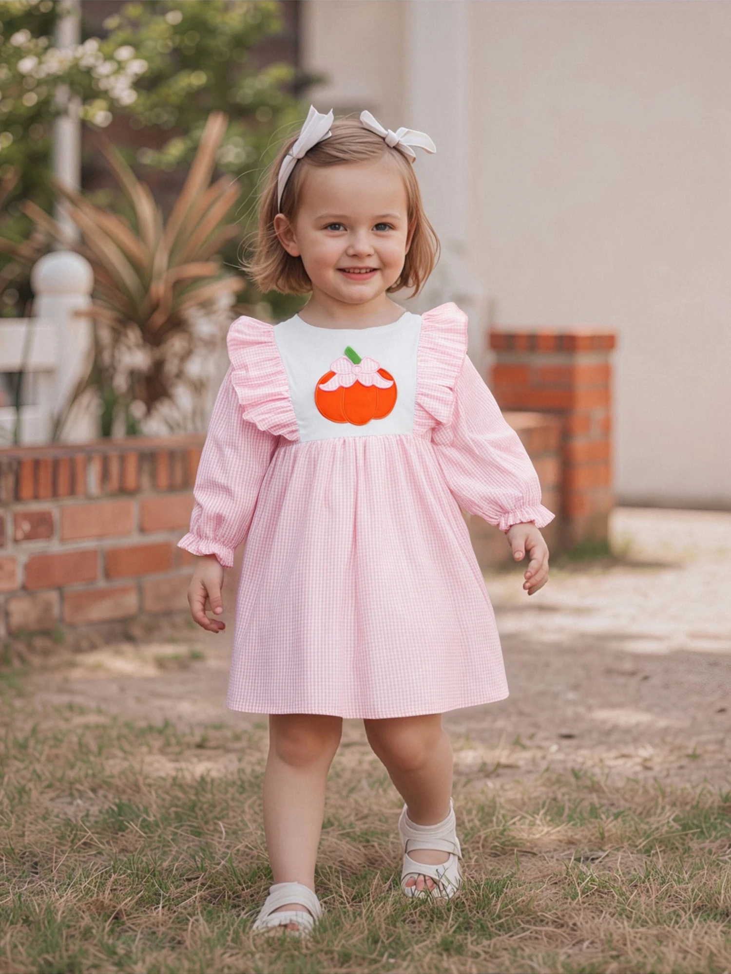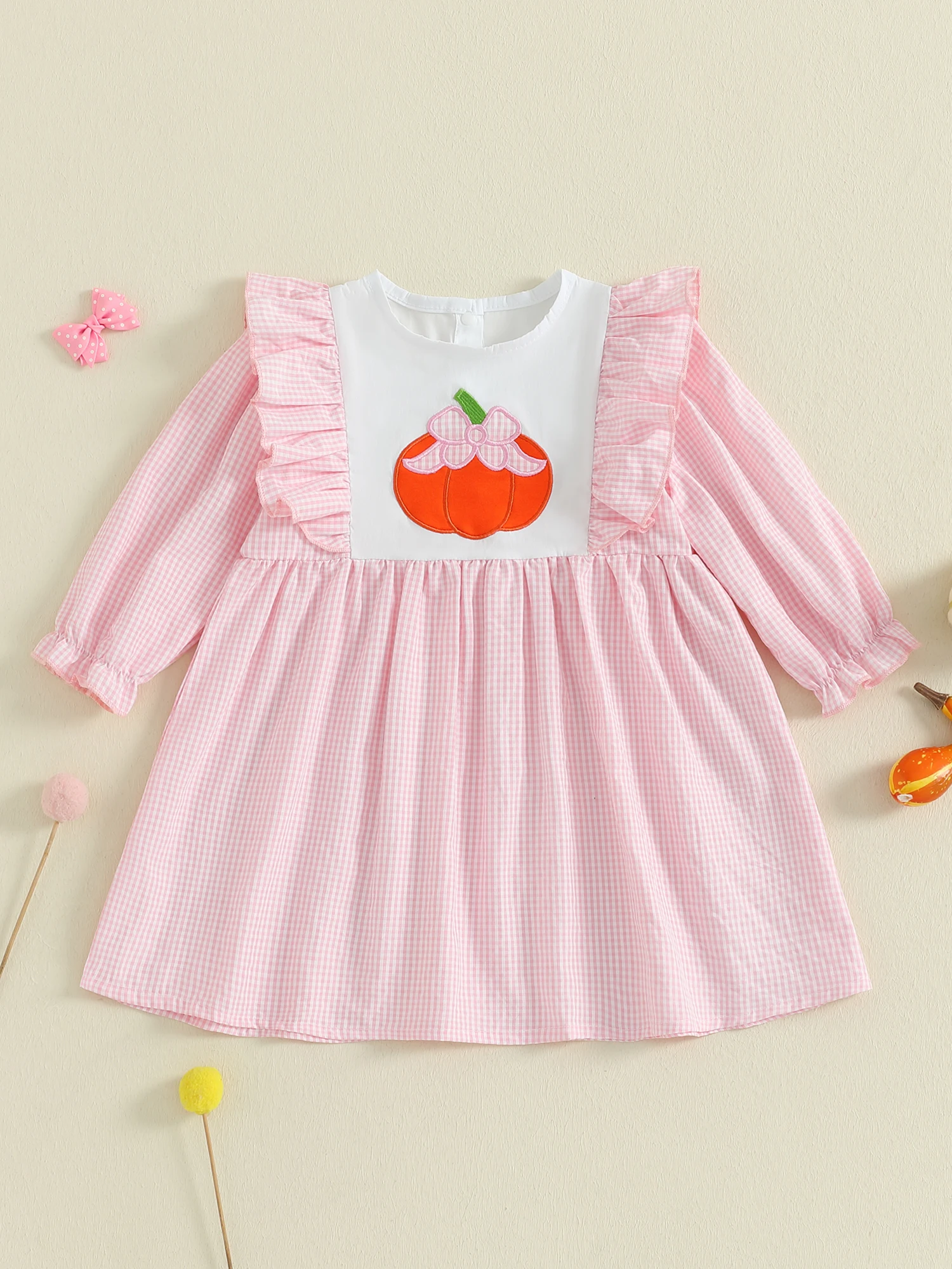 Vestido de otoño para niñas, manga larga, cuello redondo, lazo, bordado de calabaza, traje de Halloween para niños pequeños