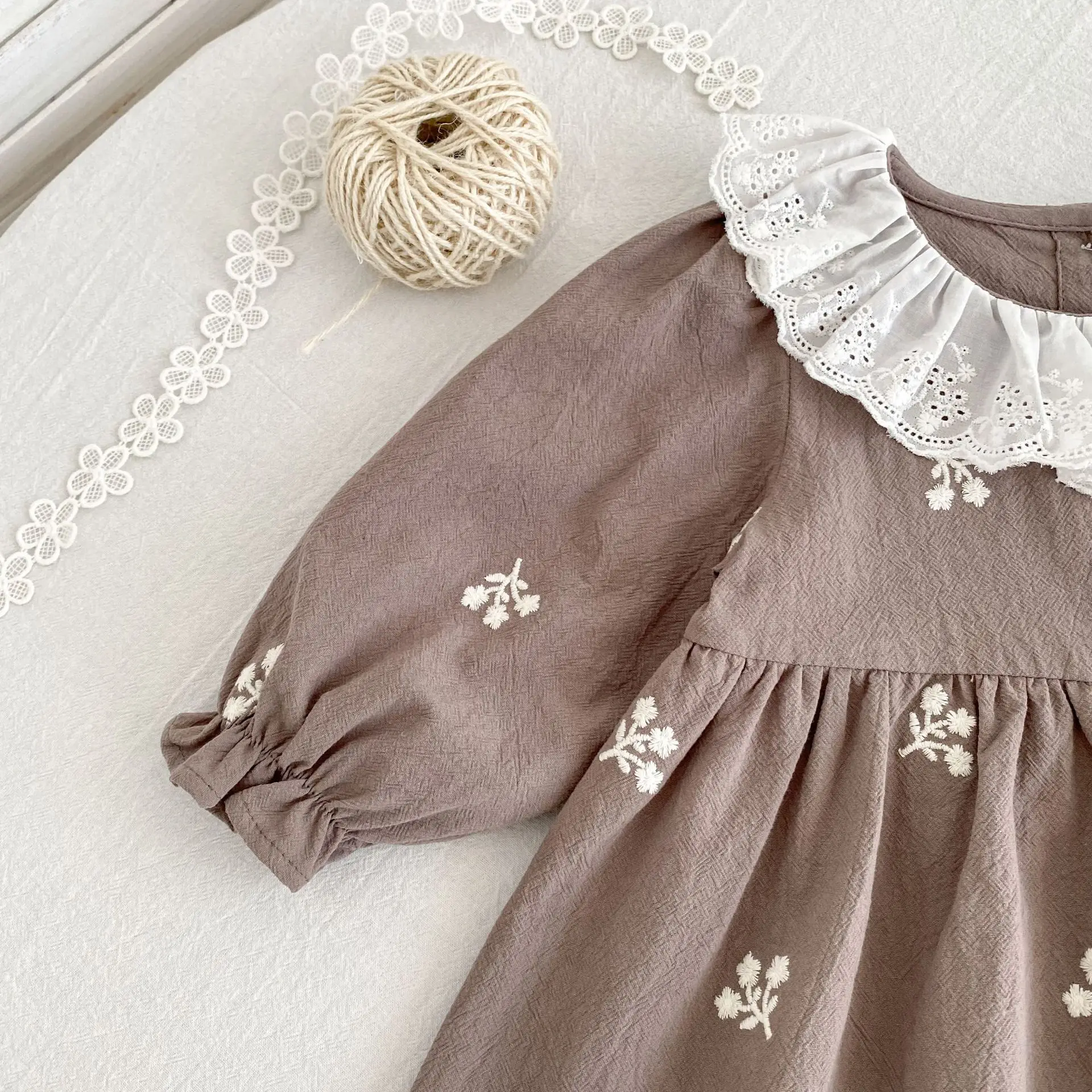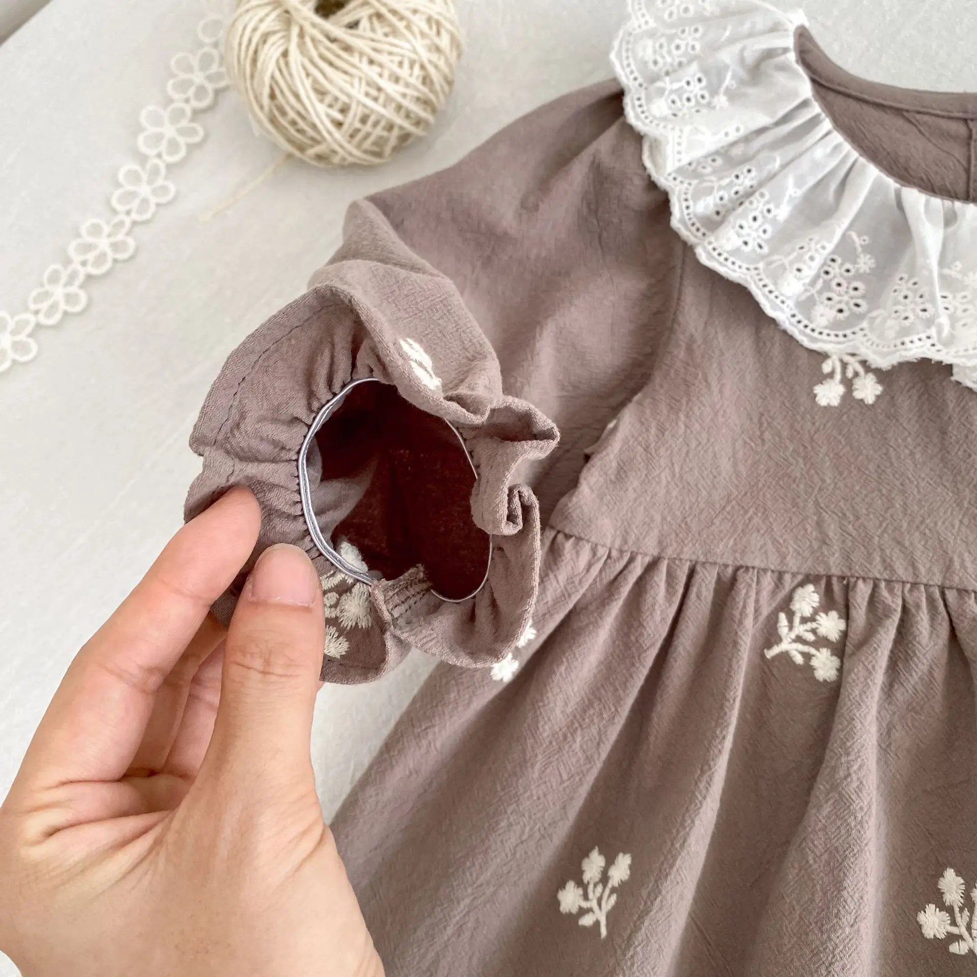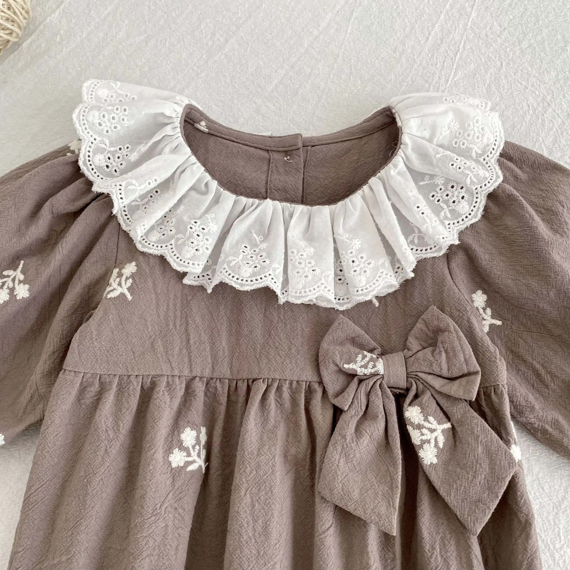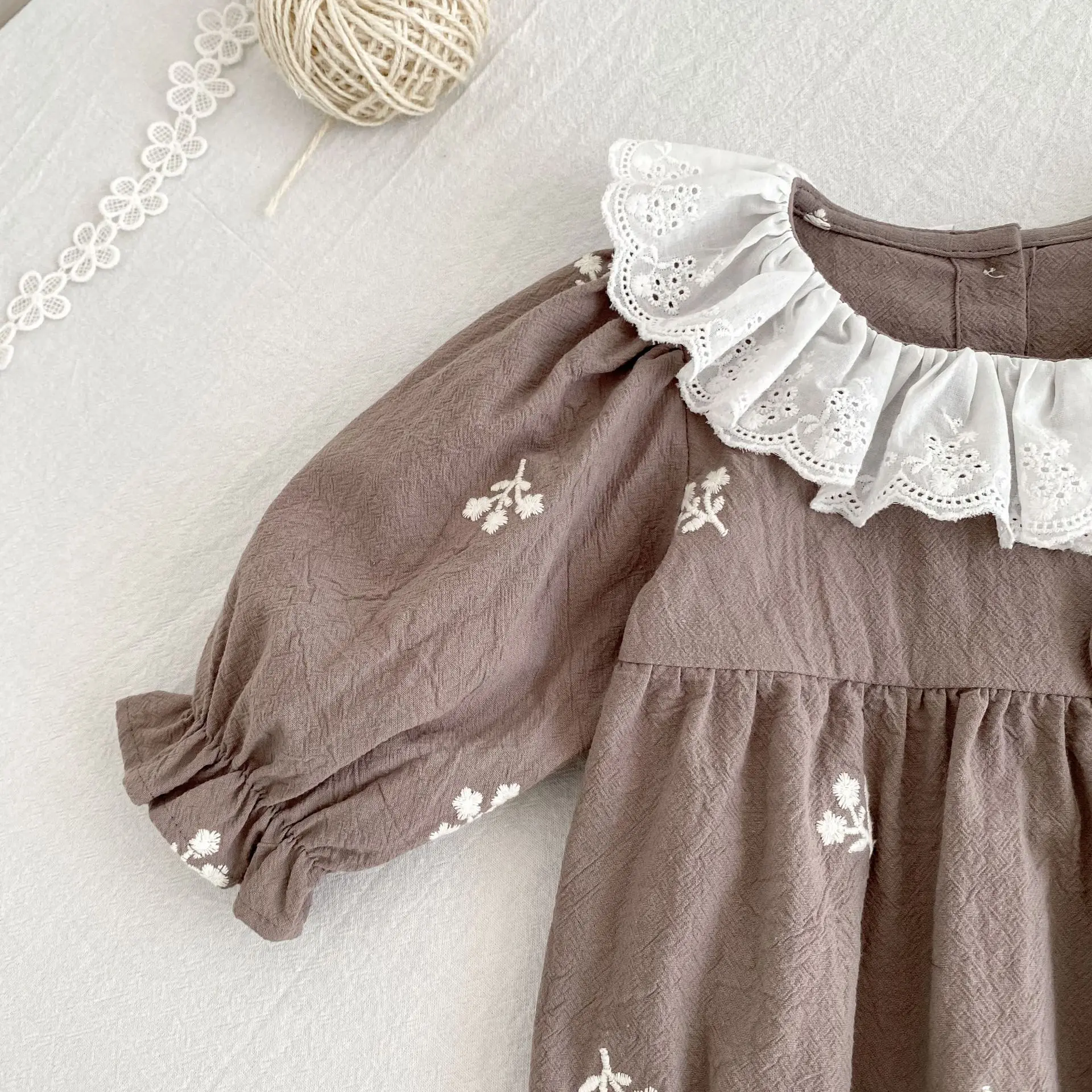 Vestido de primavera y otoño para niñas de estilo coreano: mameluco de manga larga, cuello de encaje y bordado de moda, ¡suave para la piel para niños pequeños!
