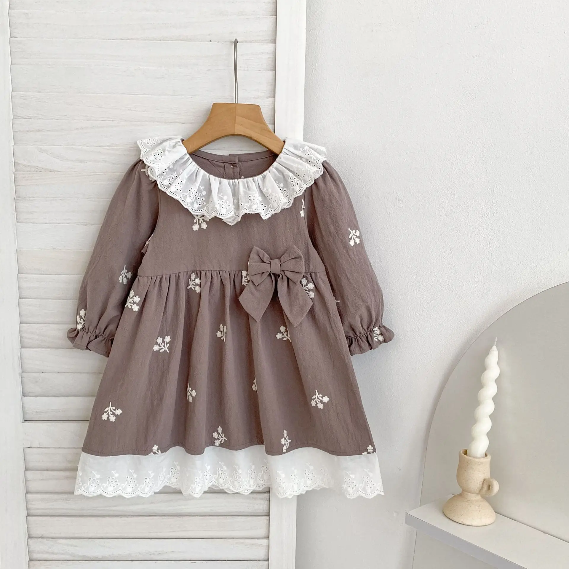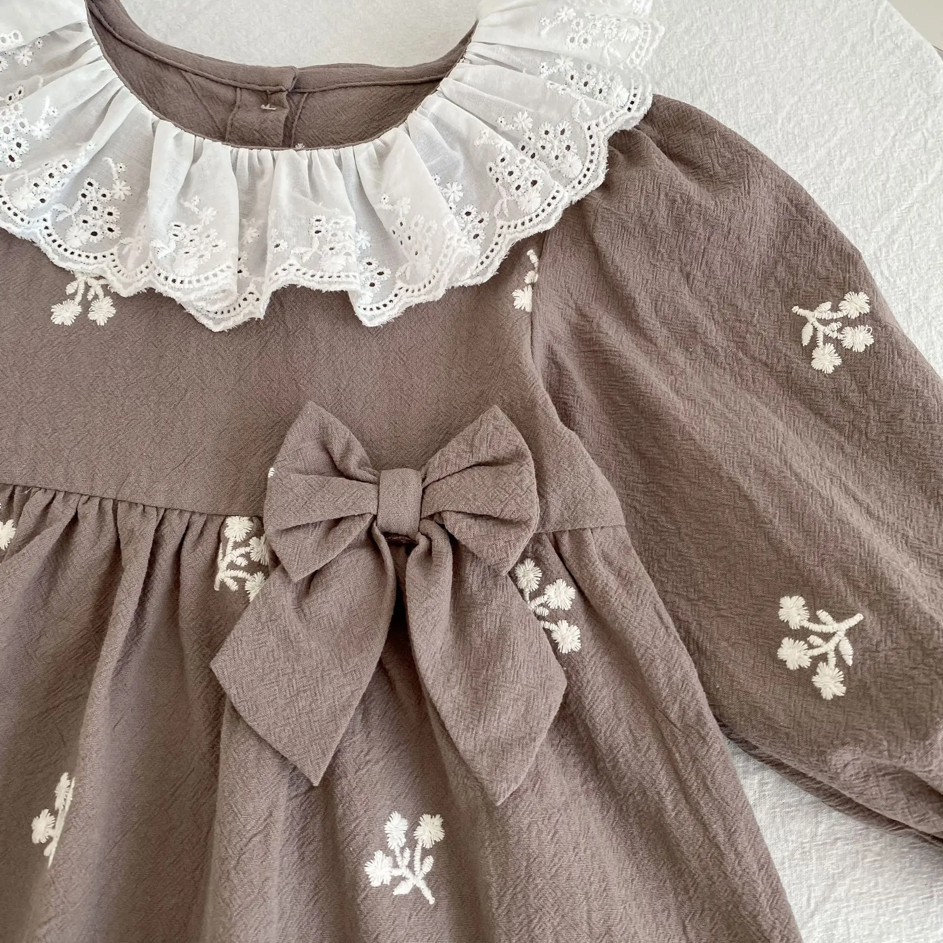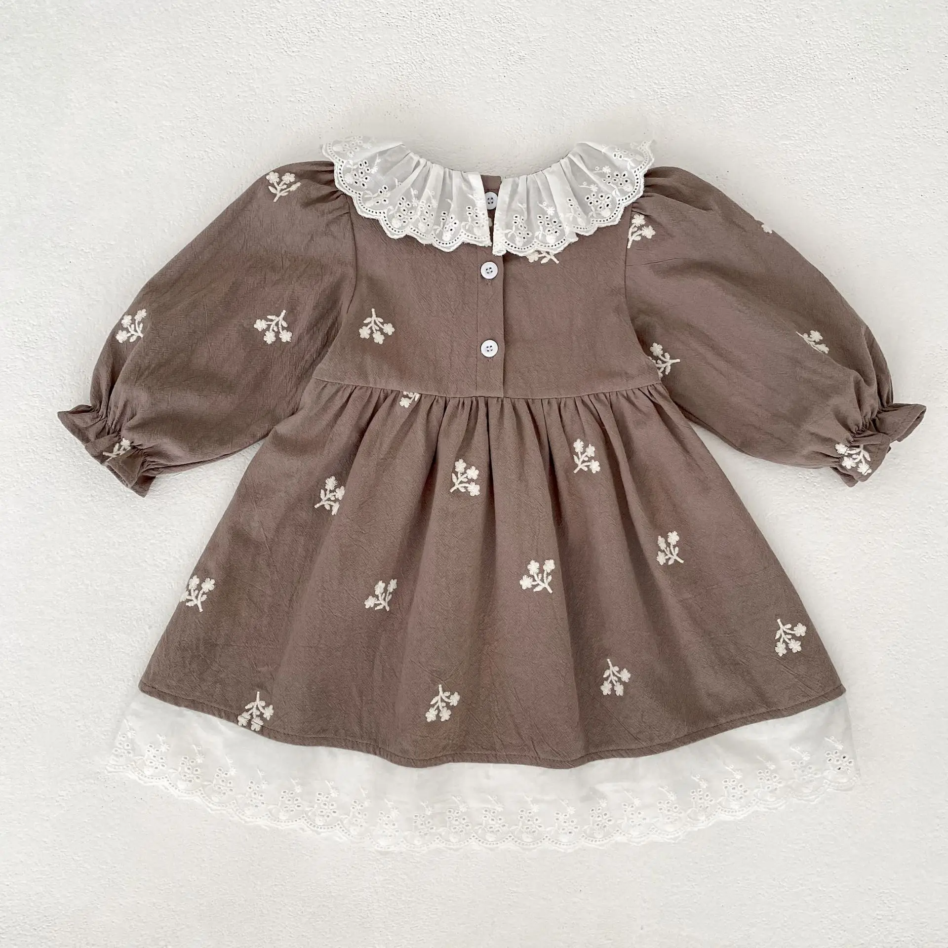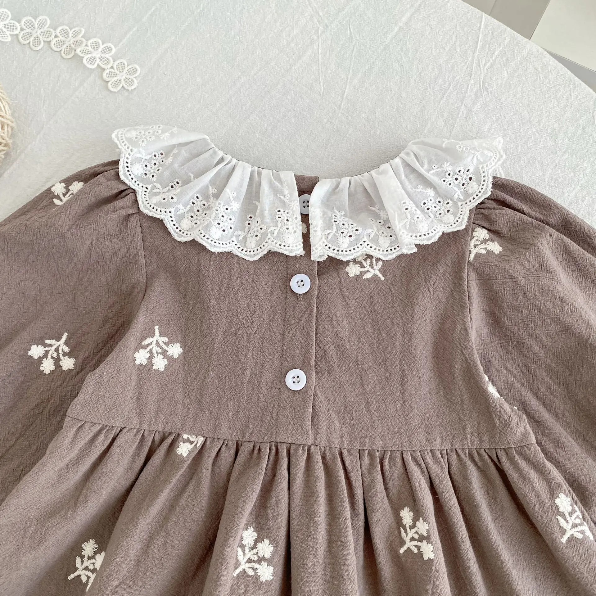 Vestido de primavera y otoño para niñas de estilo coreano: mameluco de manga larga, cuello de encaje y bordado de moda, ¡suave para la piel para niños pequeños!