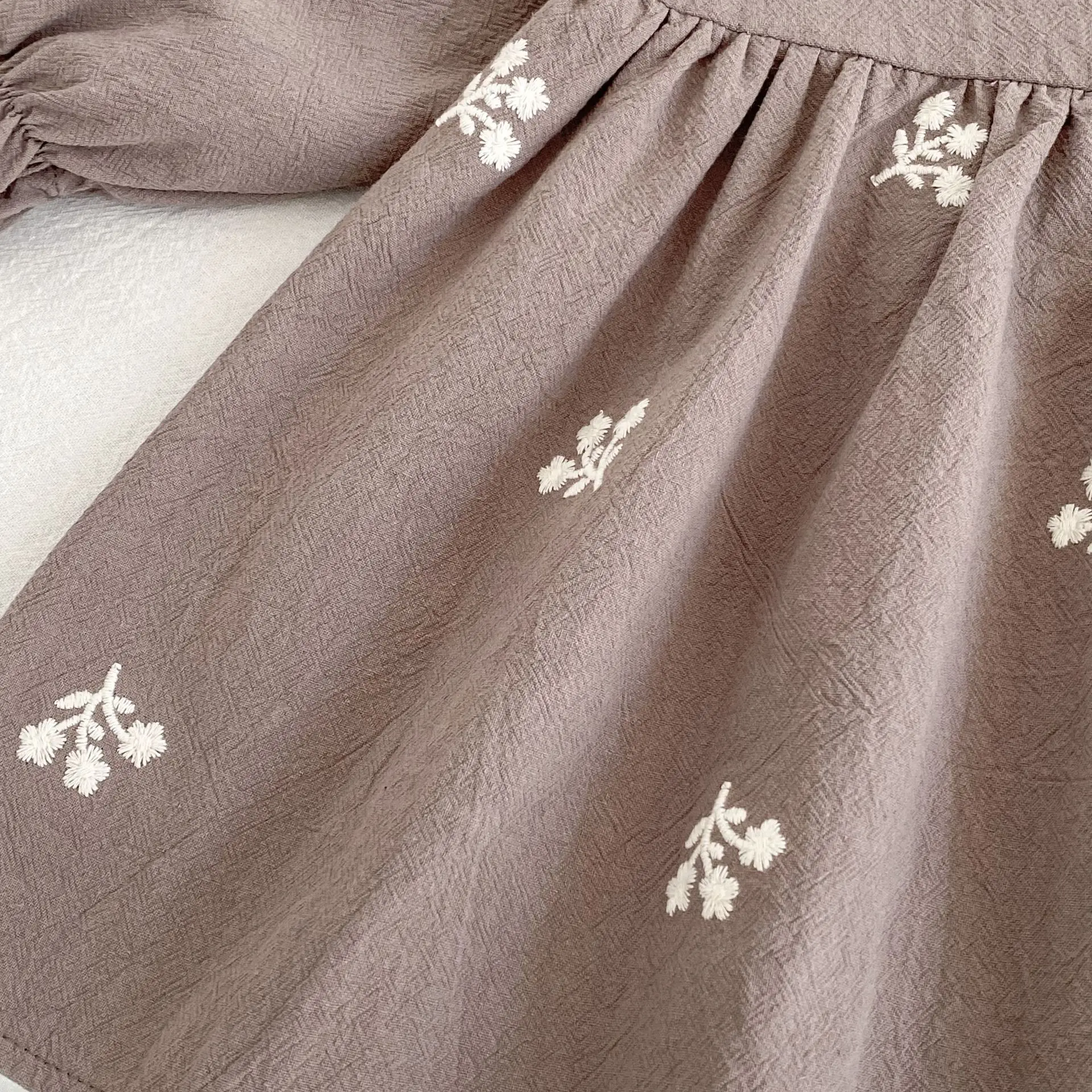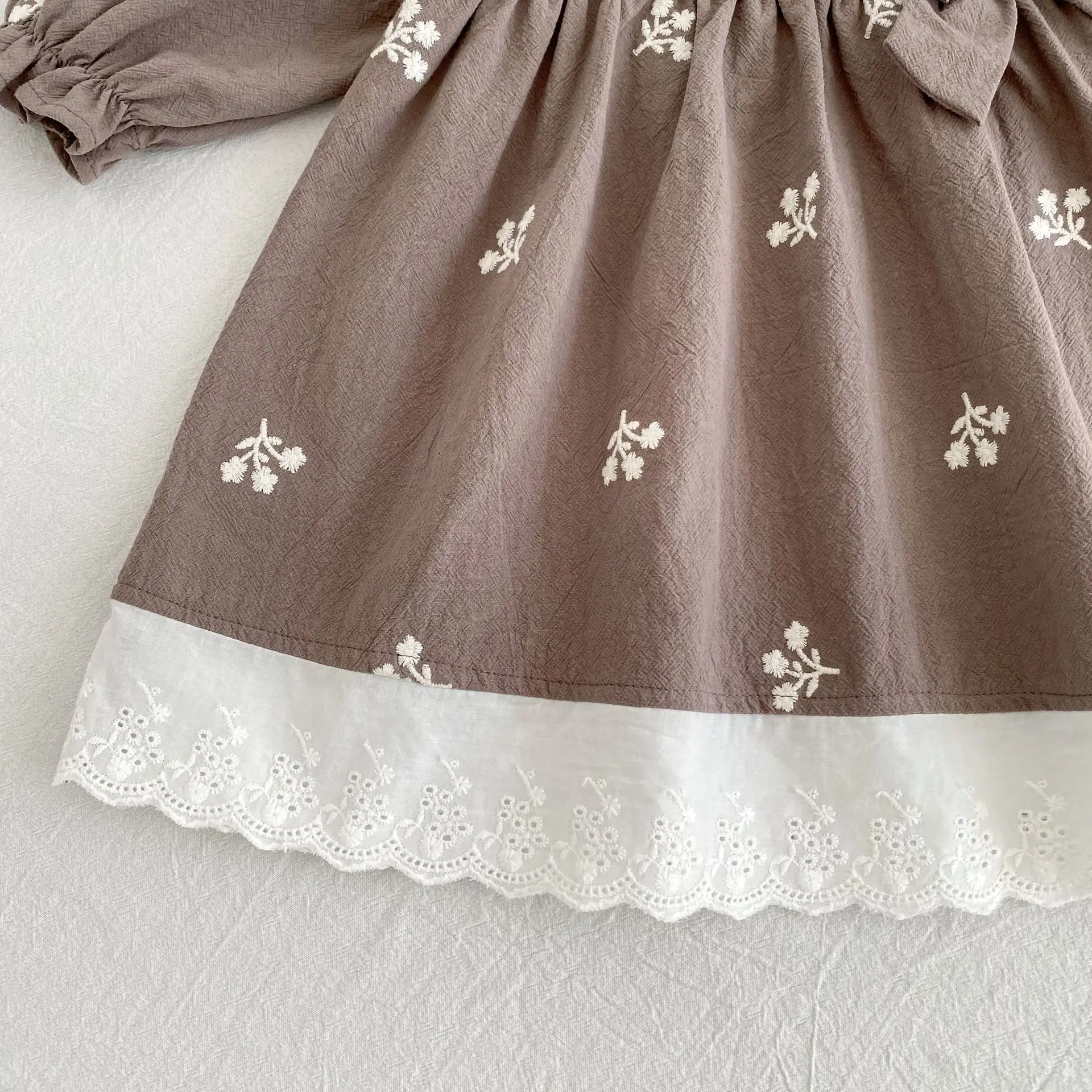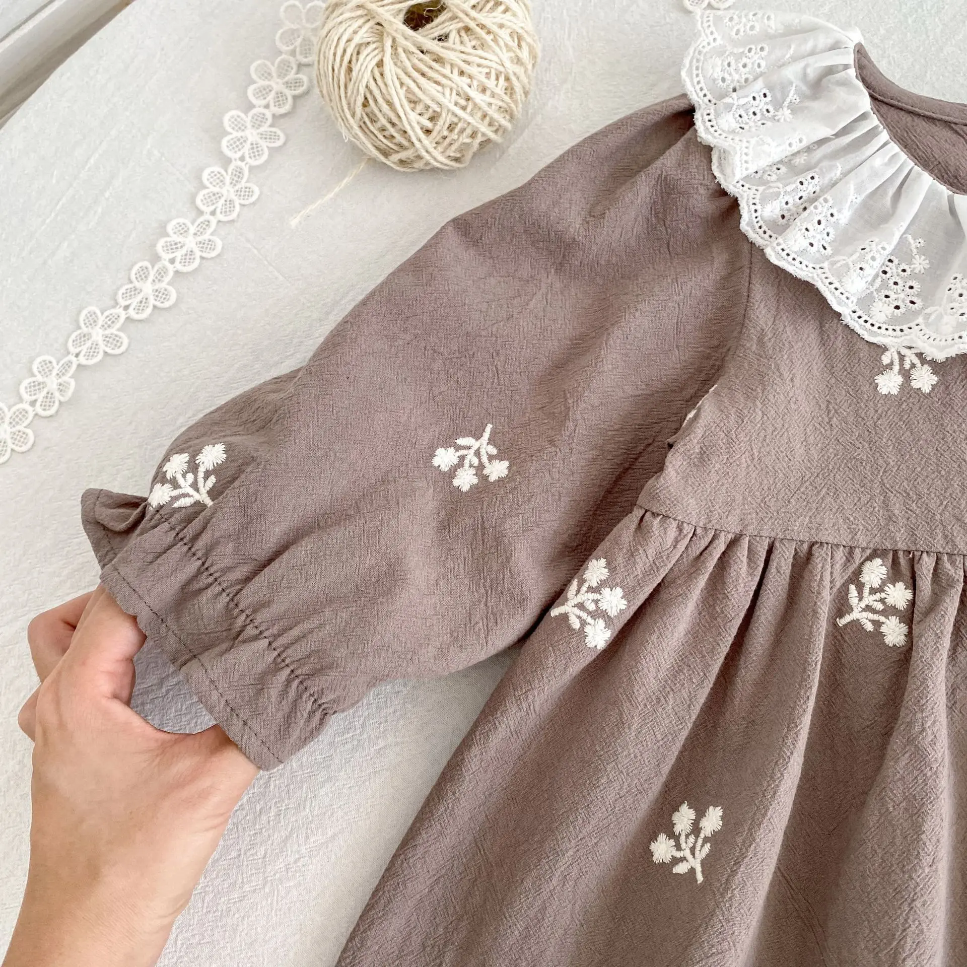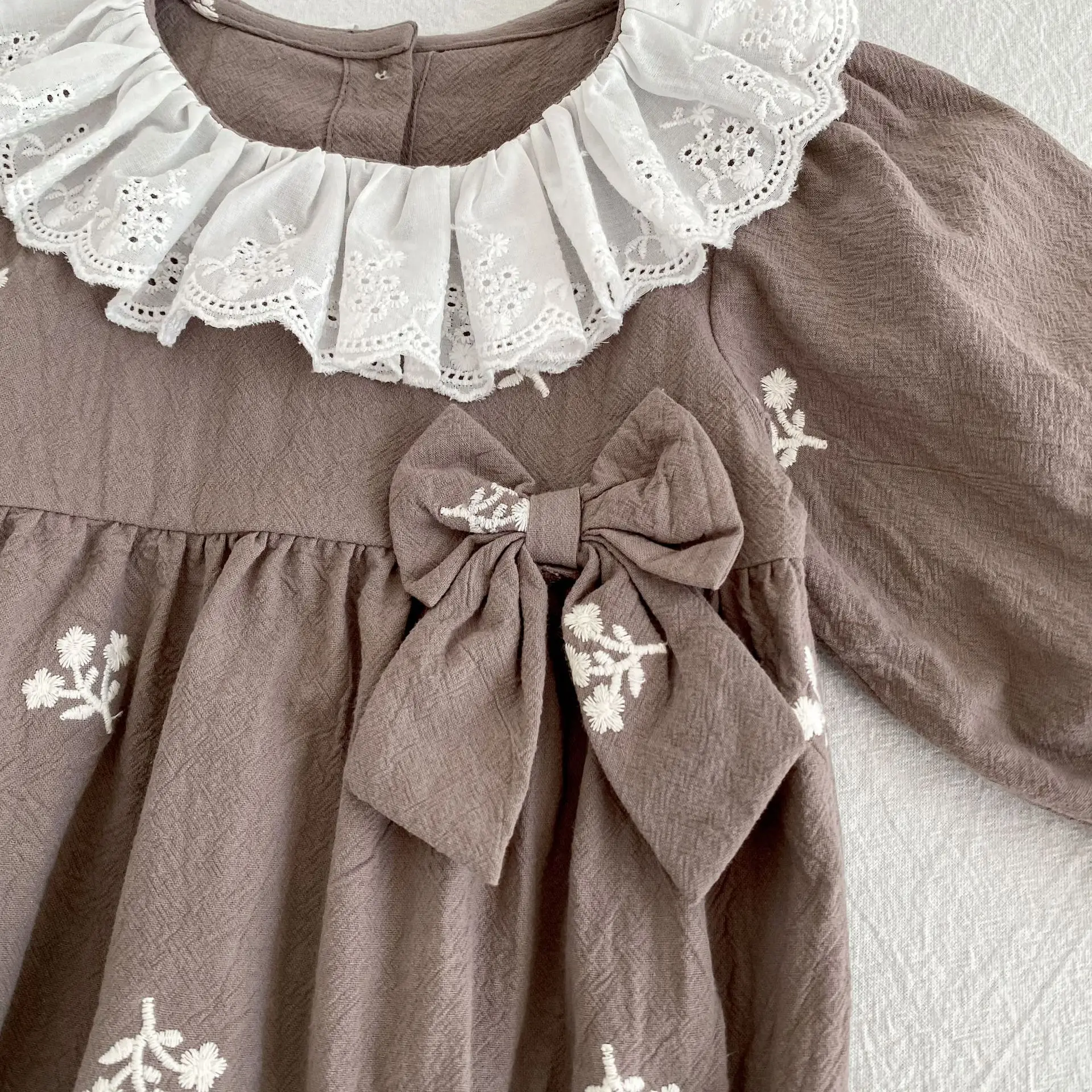 Vestido de primavera y otoño para niñas de estilo coreano: mameluco de manga larga, cuello de encaje y bordado de moda, ¡suave para la piel para niños pequeños!