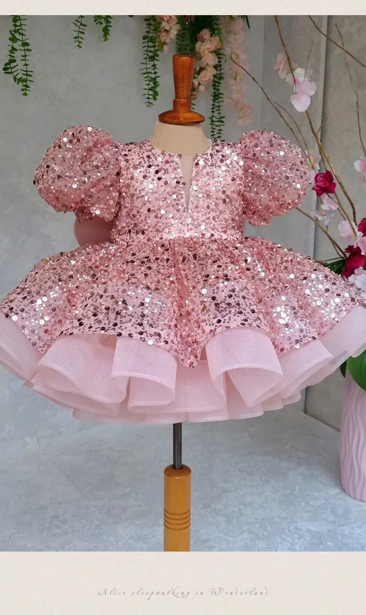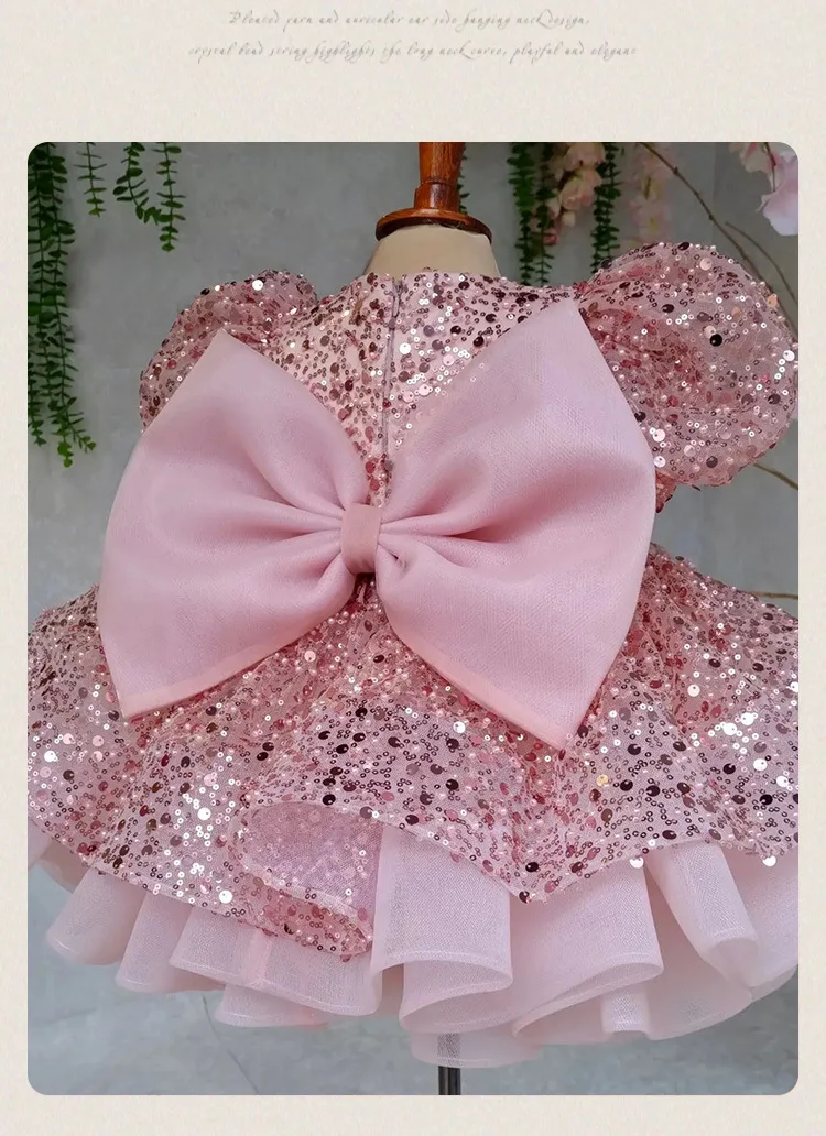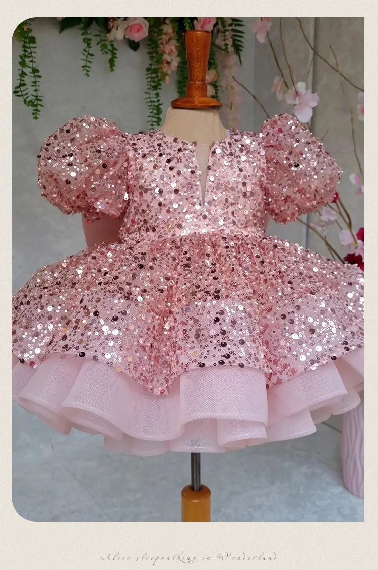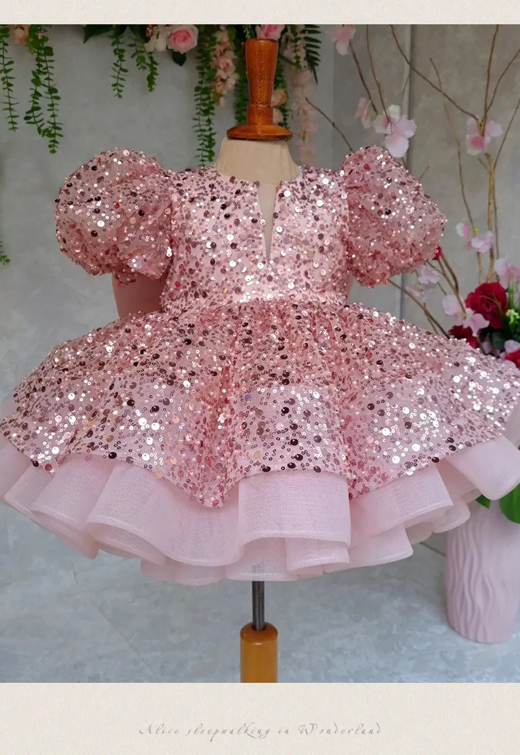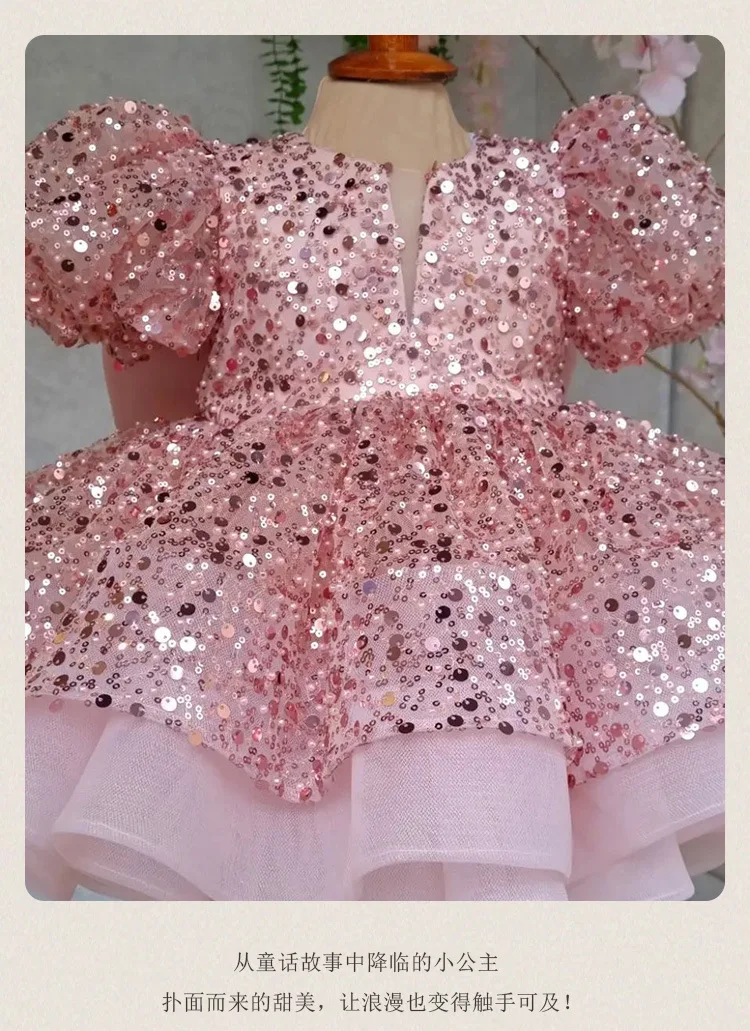 Vestido de princesa de lentejuelas rosas para niñas pequeñas, tutú de manga de burbuja de estilo europeo para desfile de moda, vestidos infantiles para niñas pequeñas
