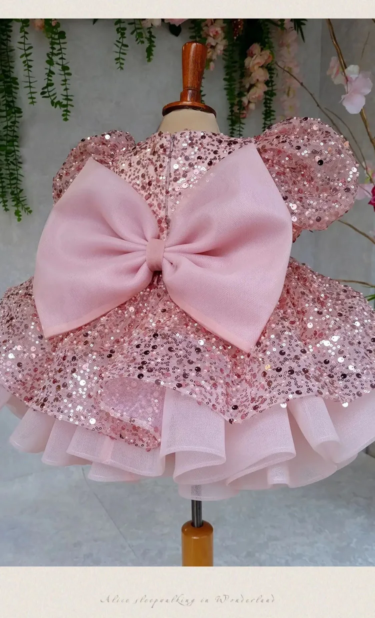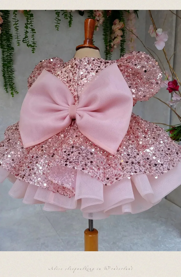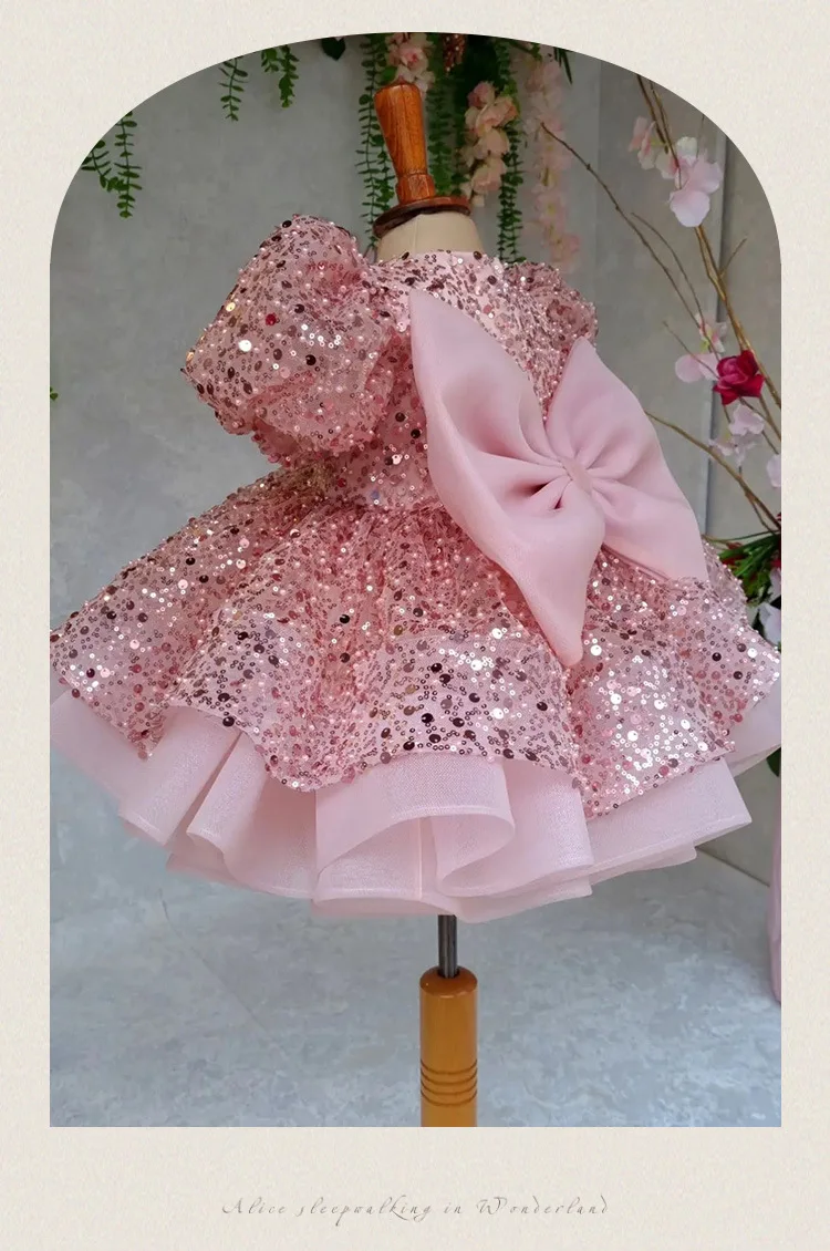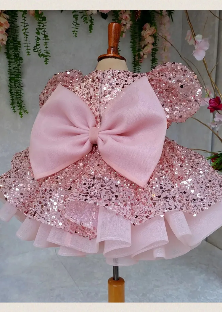 Vestido de princesa de lentejuelas rosas para niñas pequeñas, tutú de manga de burbuja de estilo europeo para desfile de moda, vestidos infantiles para niñas pequeñas