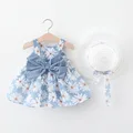 2pcs Summer Baby Girls Beach Princess Dress Cute Bow Flowers Sleeveless Cotton Toddler Dresses+Sunhat Newborn Clothing Set