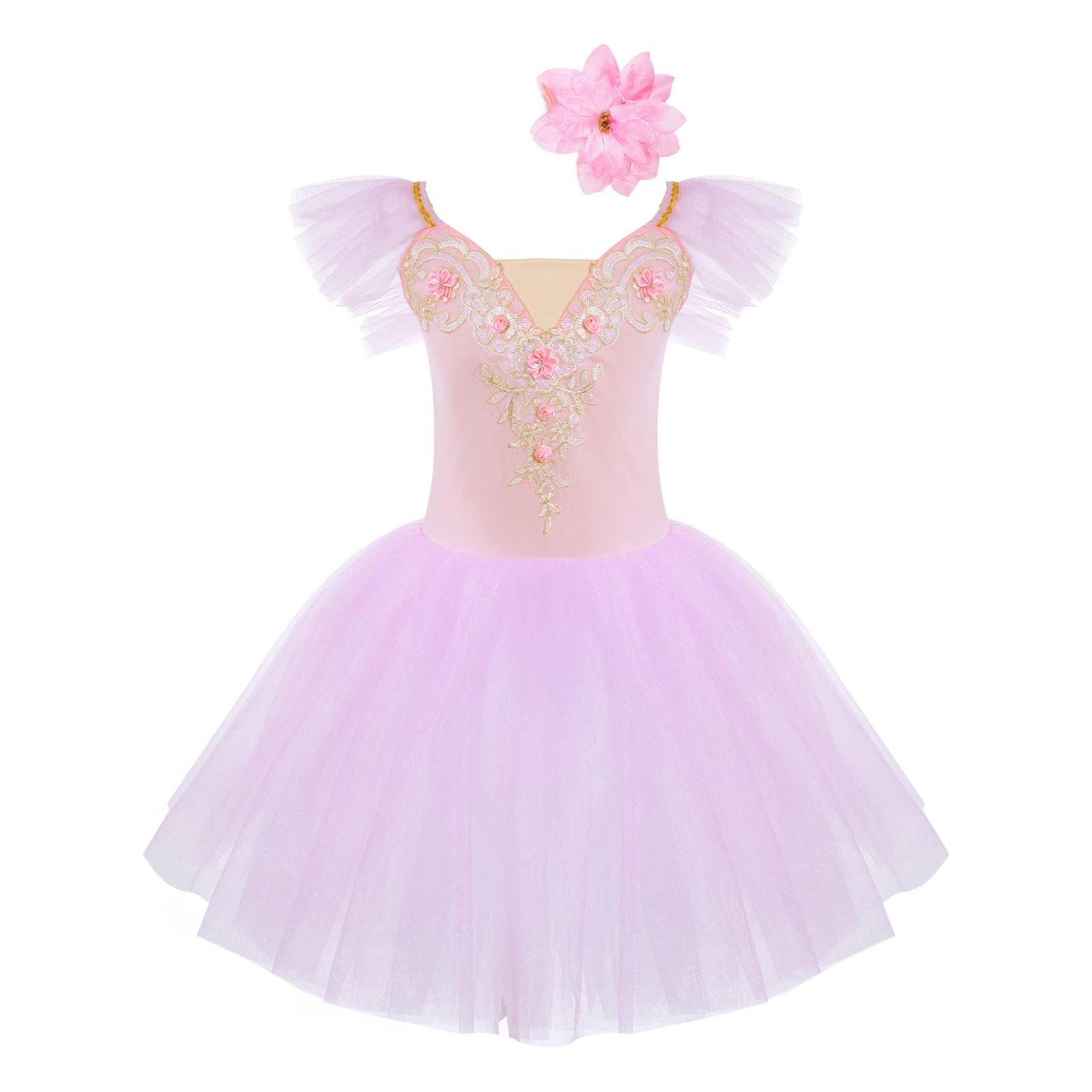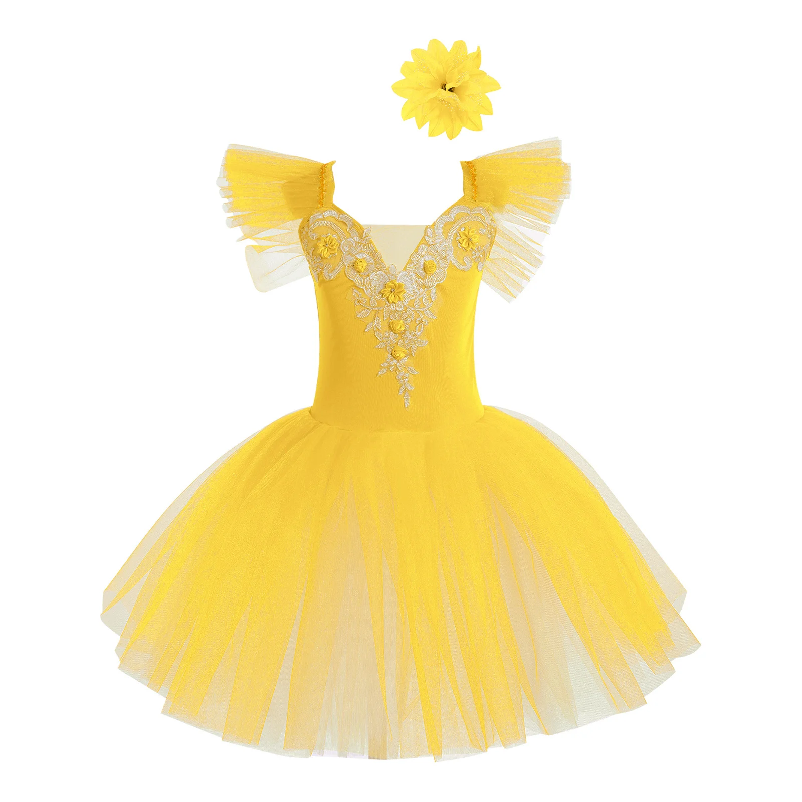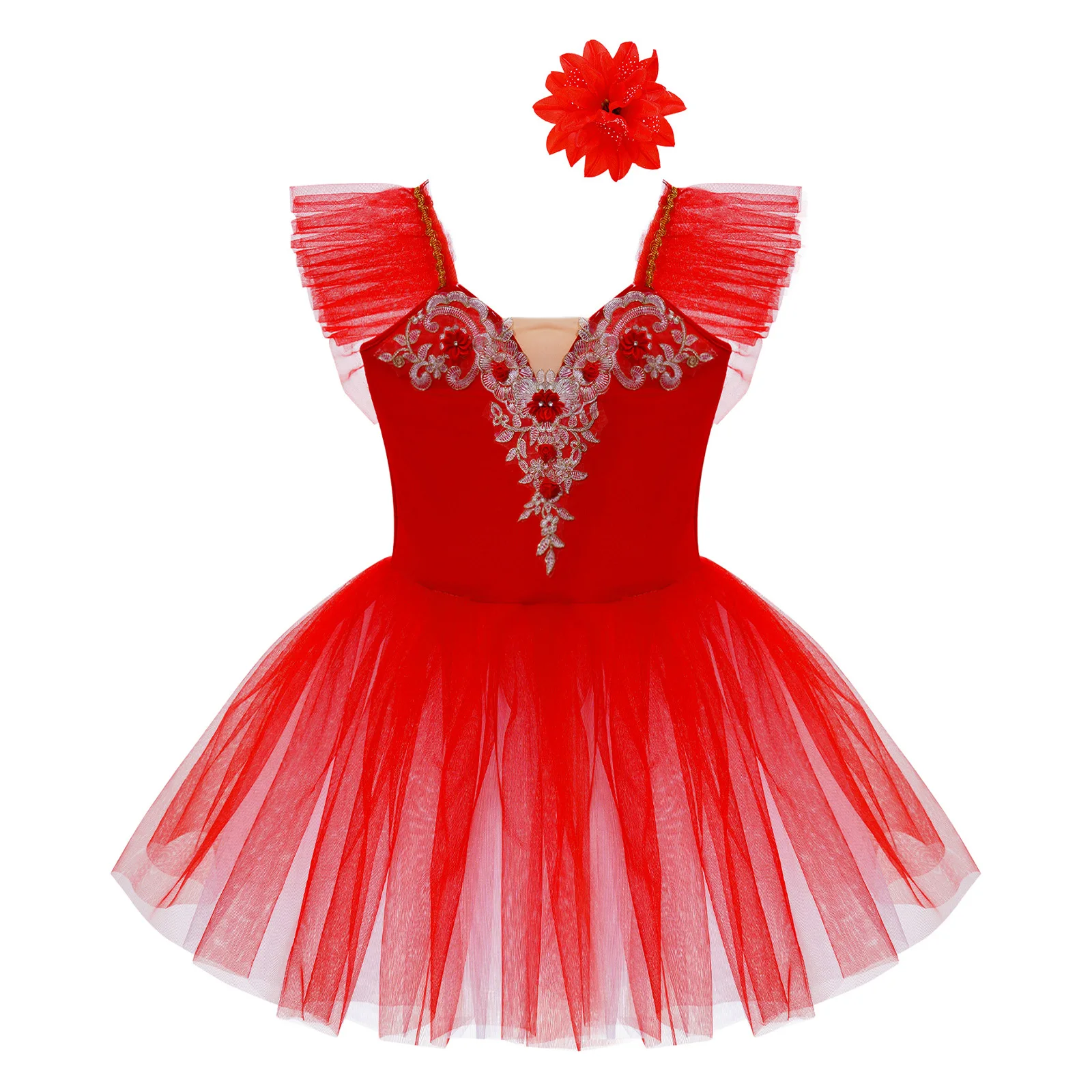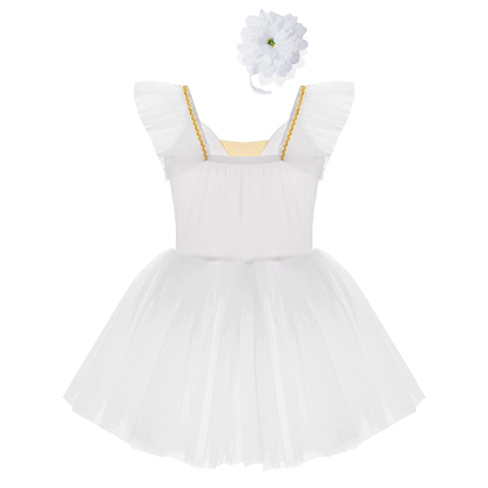 Vestido de baile exterior de malla de tutú de tres capas, calzoncillos en el interior, a juego con un exquisito tocado de flores.