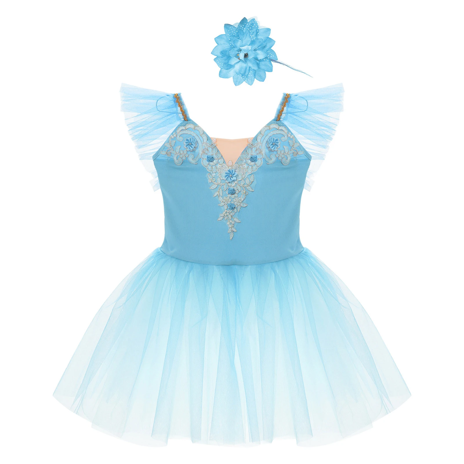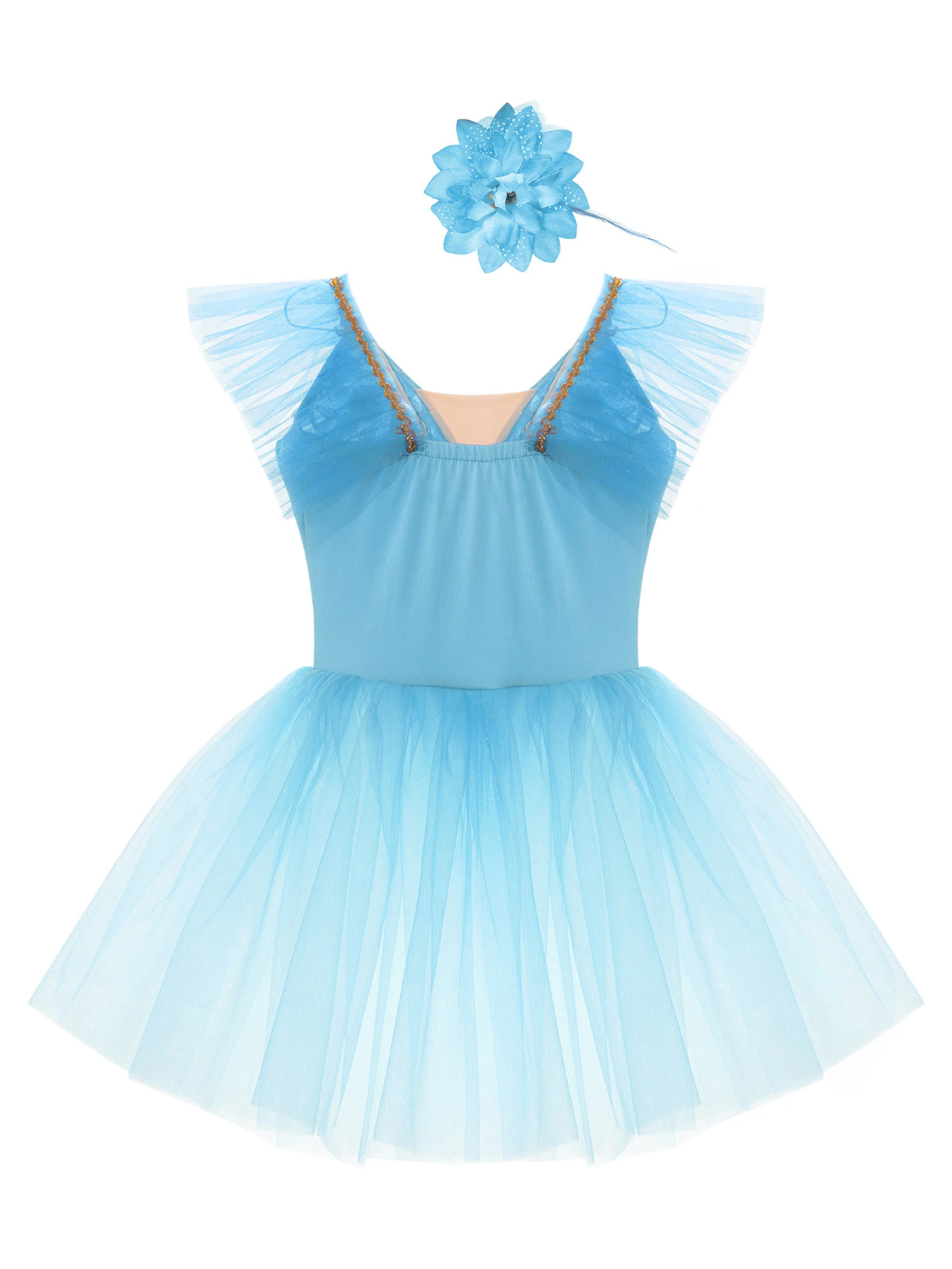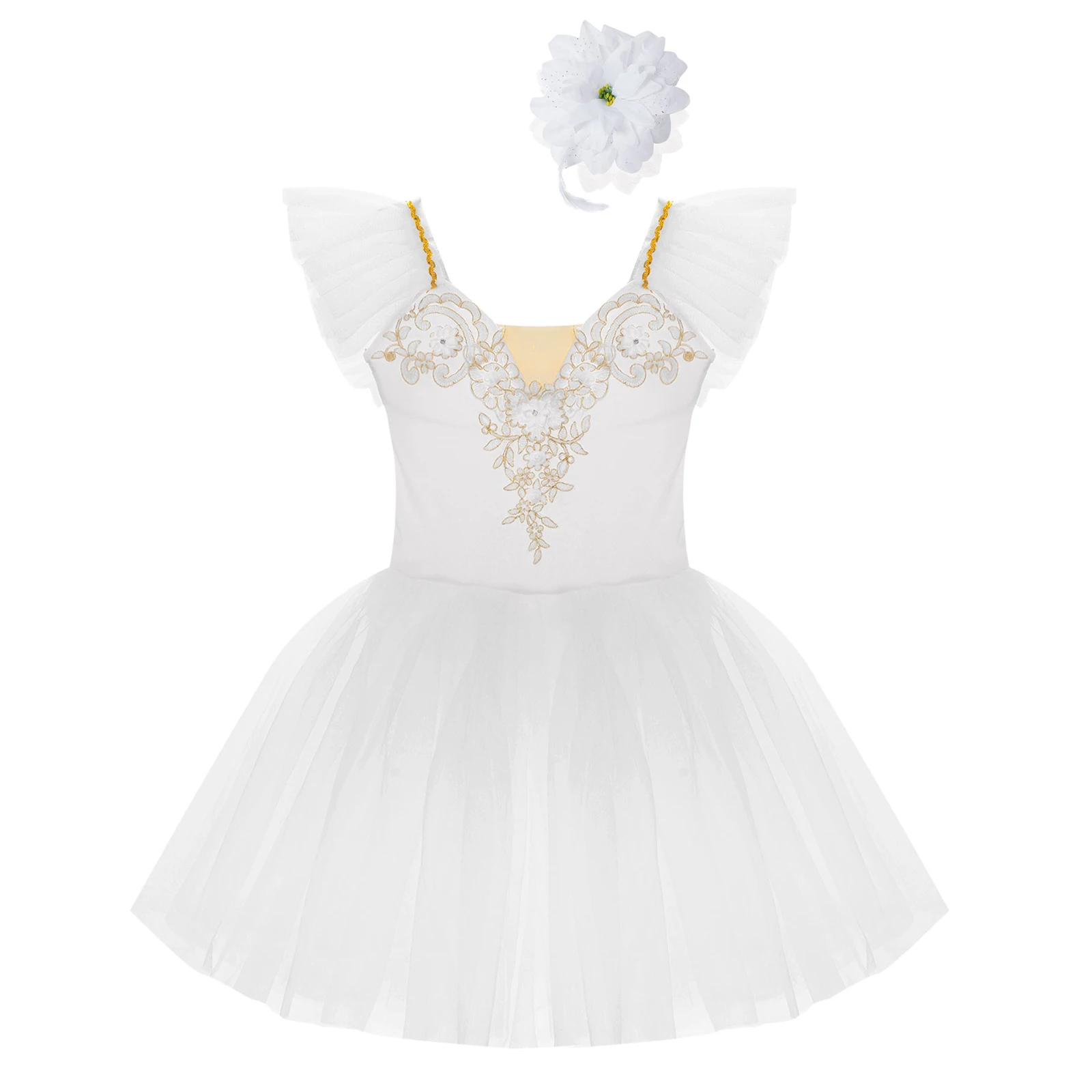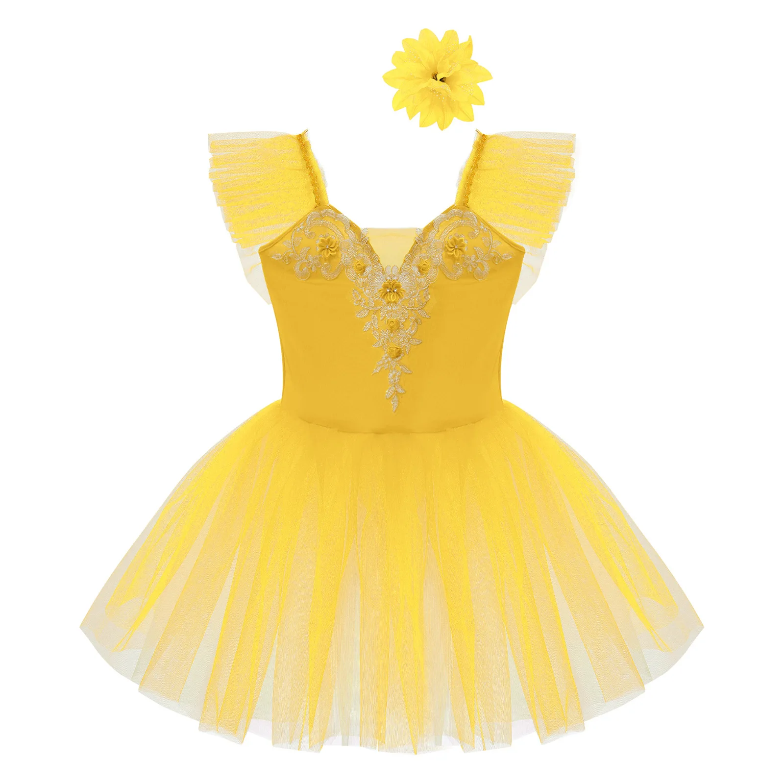 Vestido de baile exterior de malla de tutú de tres capas, calzoncillos en el interior, a juego con un exquisito tocado de flores.