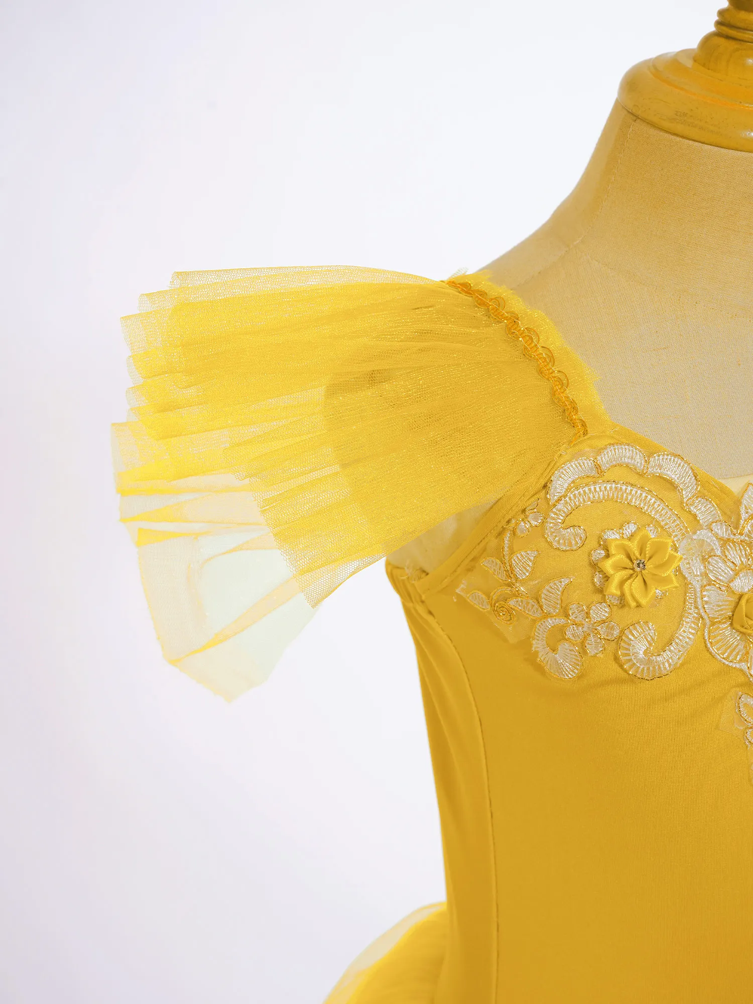 Manga voladora y tirantes finos ajustables, decoración de encaje, flores y pedrería brillante.