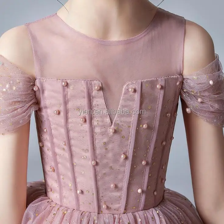 1. Rosa elegante fuera del hombro moda más nuevos vestidos de las niñas con lentejuelas sin espalda vestido hinchado moda más nuevos vestidos de las niñas