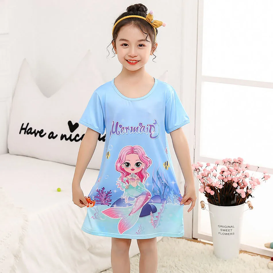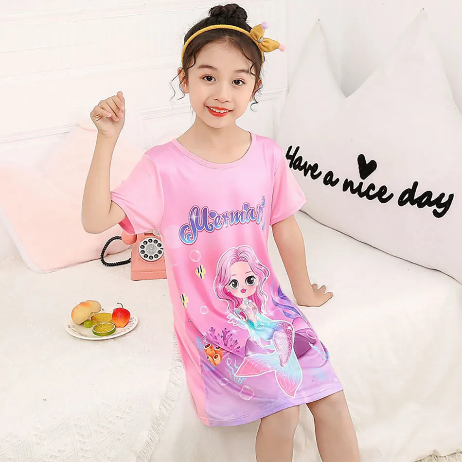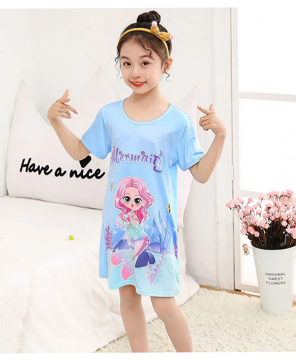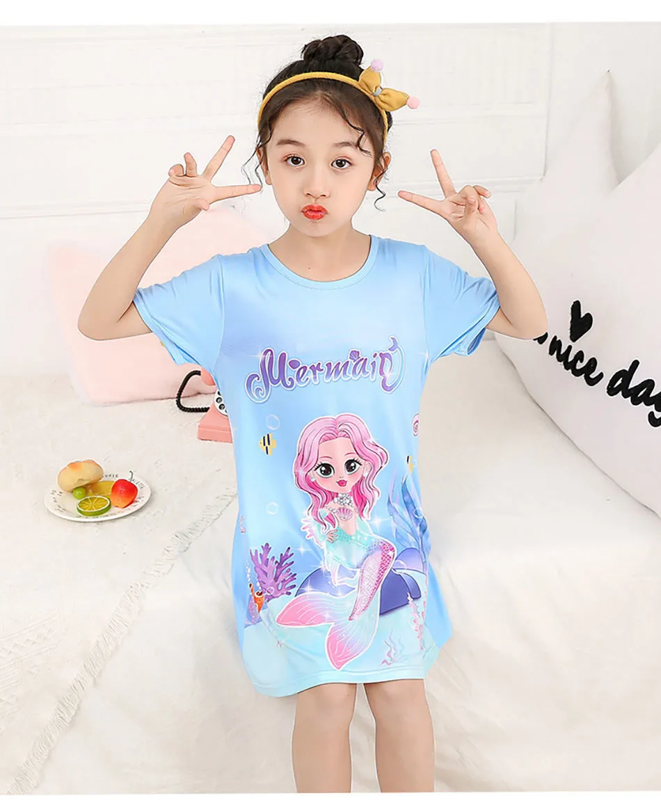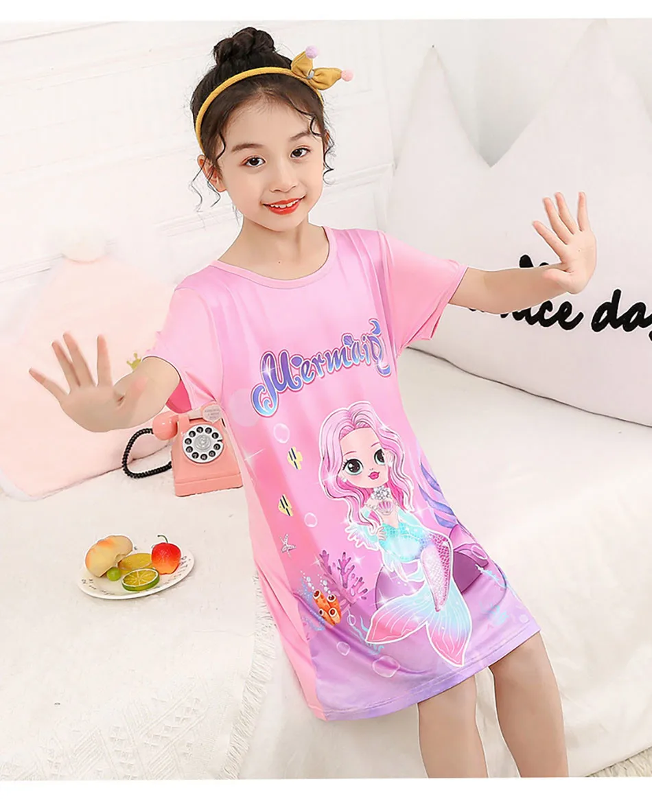 Nombre: Vestido de sirena para niñas, vestido de princesa de verano de manga corta, transpirable, estampado de dibujos animados, camisón de seda suave para niñas, ropa de dormir para niños
