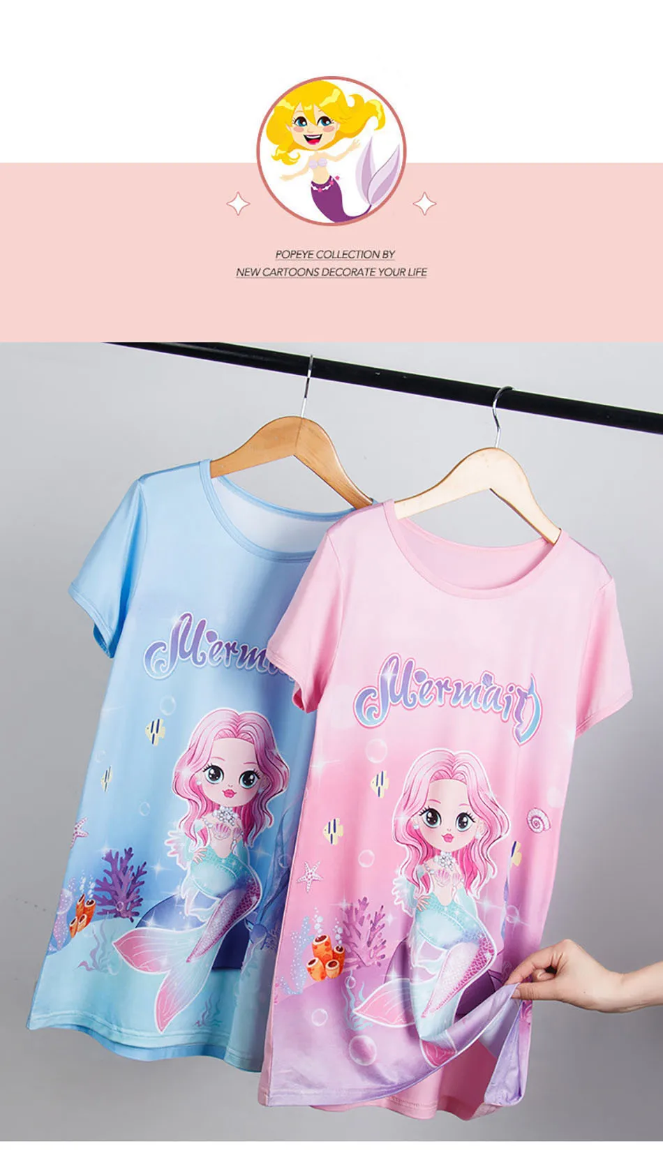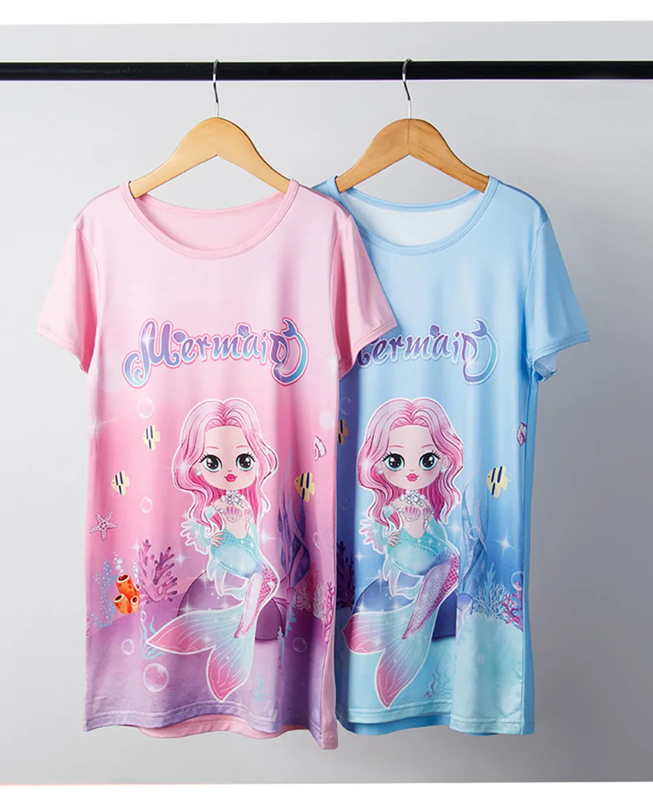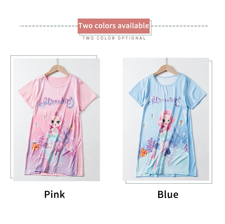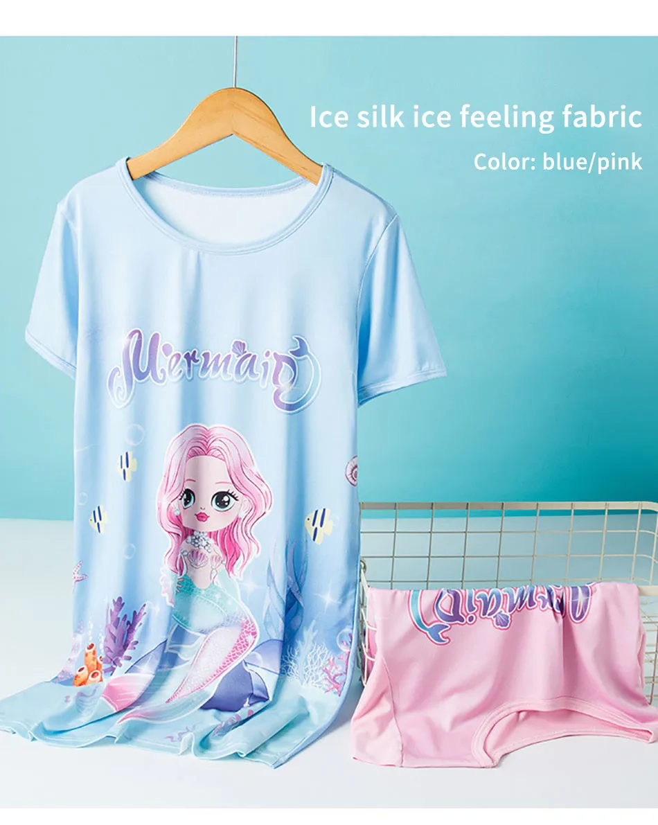 Nombre: Vestido de sirena para niñas, vestido de princesa de verano de manga corta, transpirable, estampado de dibujos animados, camisón de seda suave para niñas, ropa de dormir para niños