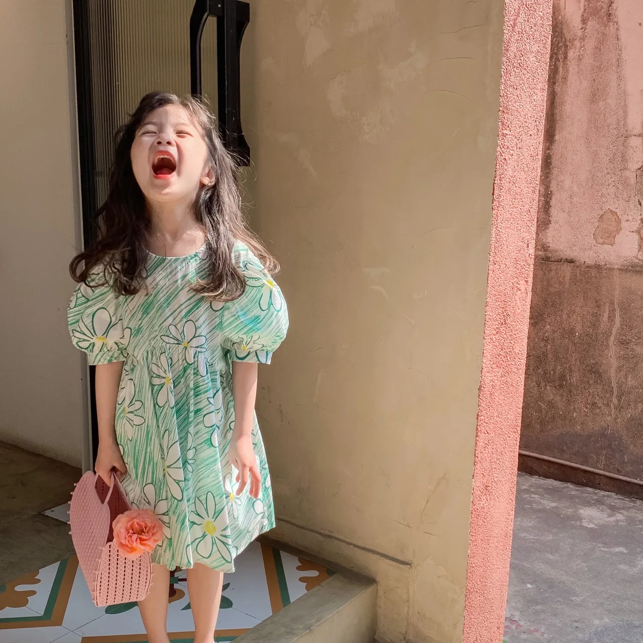 Comprar Vestido suelto de girasol verde para niñas, versión coreana de falda de moda para niños pequeños y medianos, novedad de verano 2022