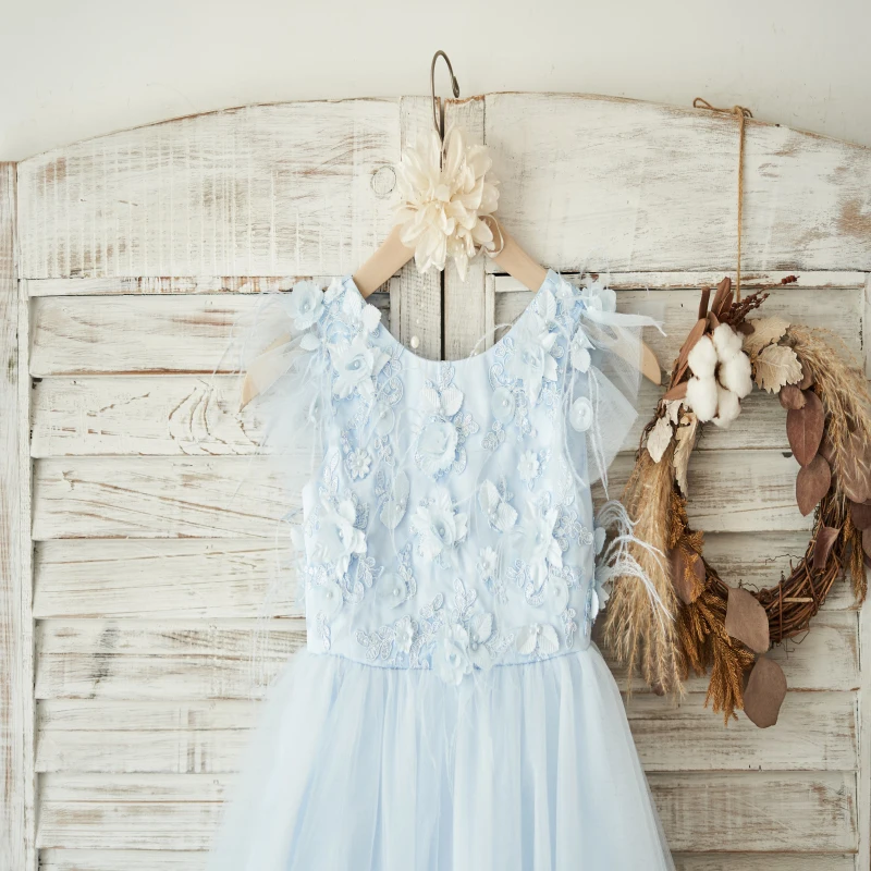 Estilo Vestido de niña de flores de boda de tul de encaje de plumas Tejido Encaje/tul/pluma Tamaño 2T-12T Personalización Sin MOQ/tamaño personalizado/color personalizado/diseño personalizado disponible