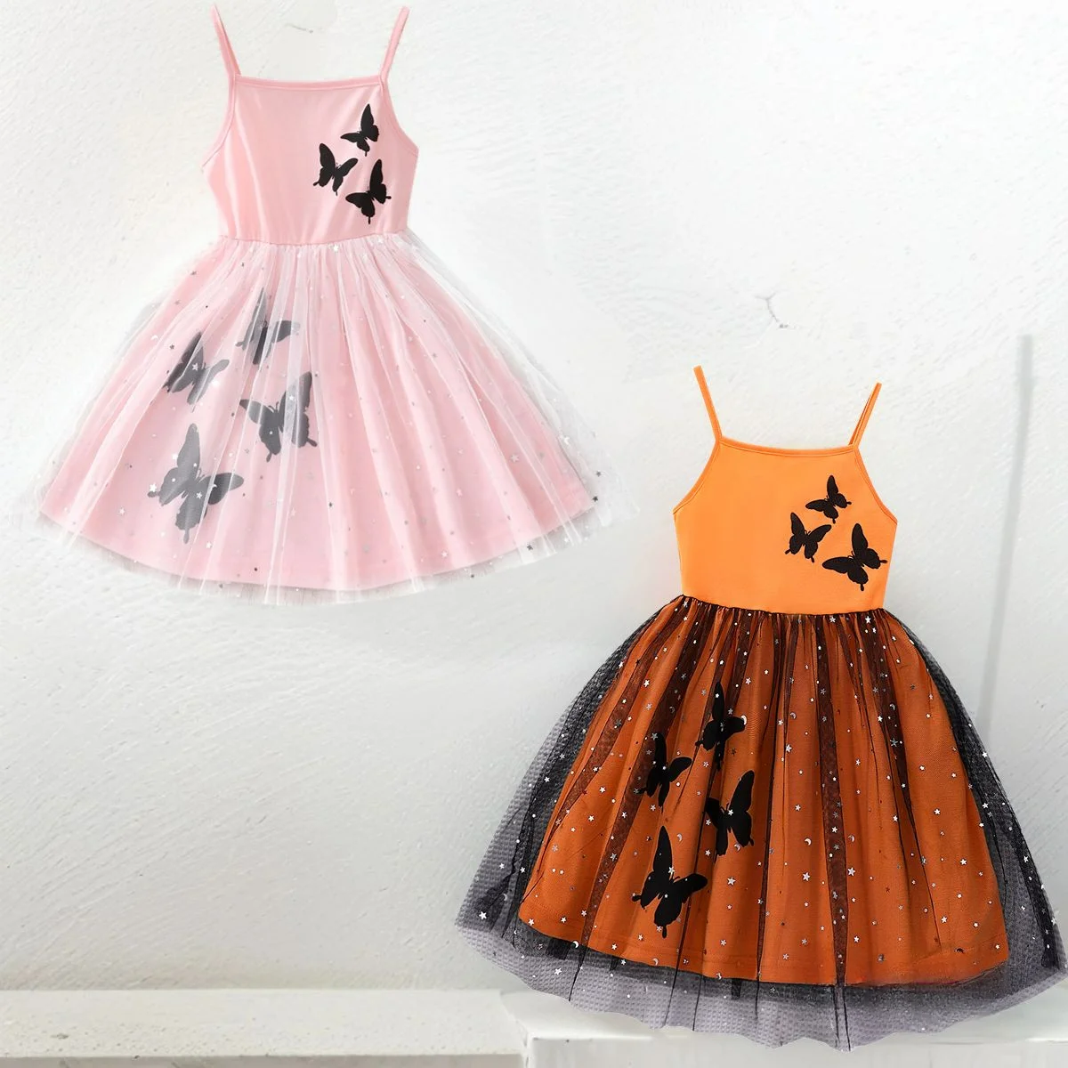 Comprar Vestido de verano de Halloween para niñas, ropa sin mangas con tirantes, gasa, mariposa, naranja, informal, suave y cómodo