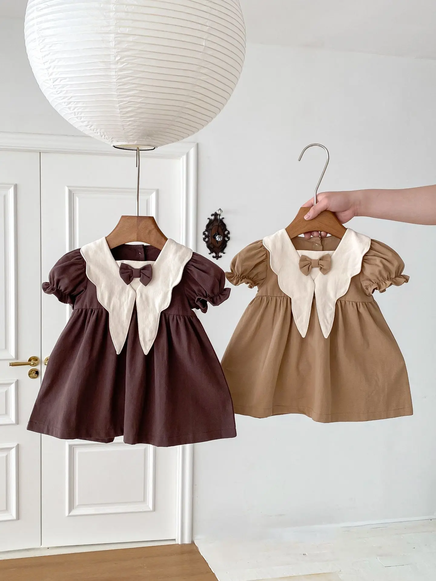 Comprar Vestido de verano con lazo para niñas pequeñas, bonito vestido de línea A con cuello Peter Pan, bloque de Color, novedad de 2024