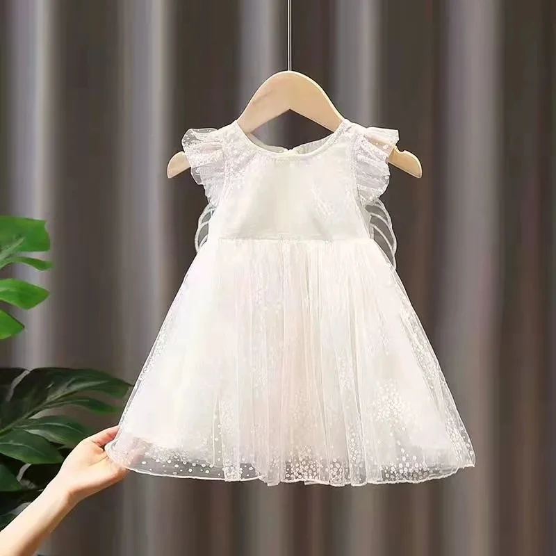 Comprar Vestidos de encaje con alas de mariposa para niña, bonito vestido de princesa con lentejuelas, vestido esponjoso blanco liso de verano para niña