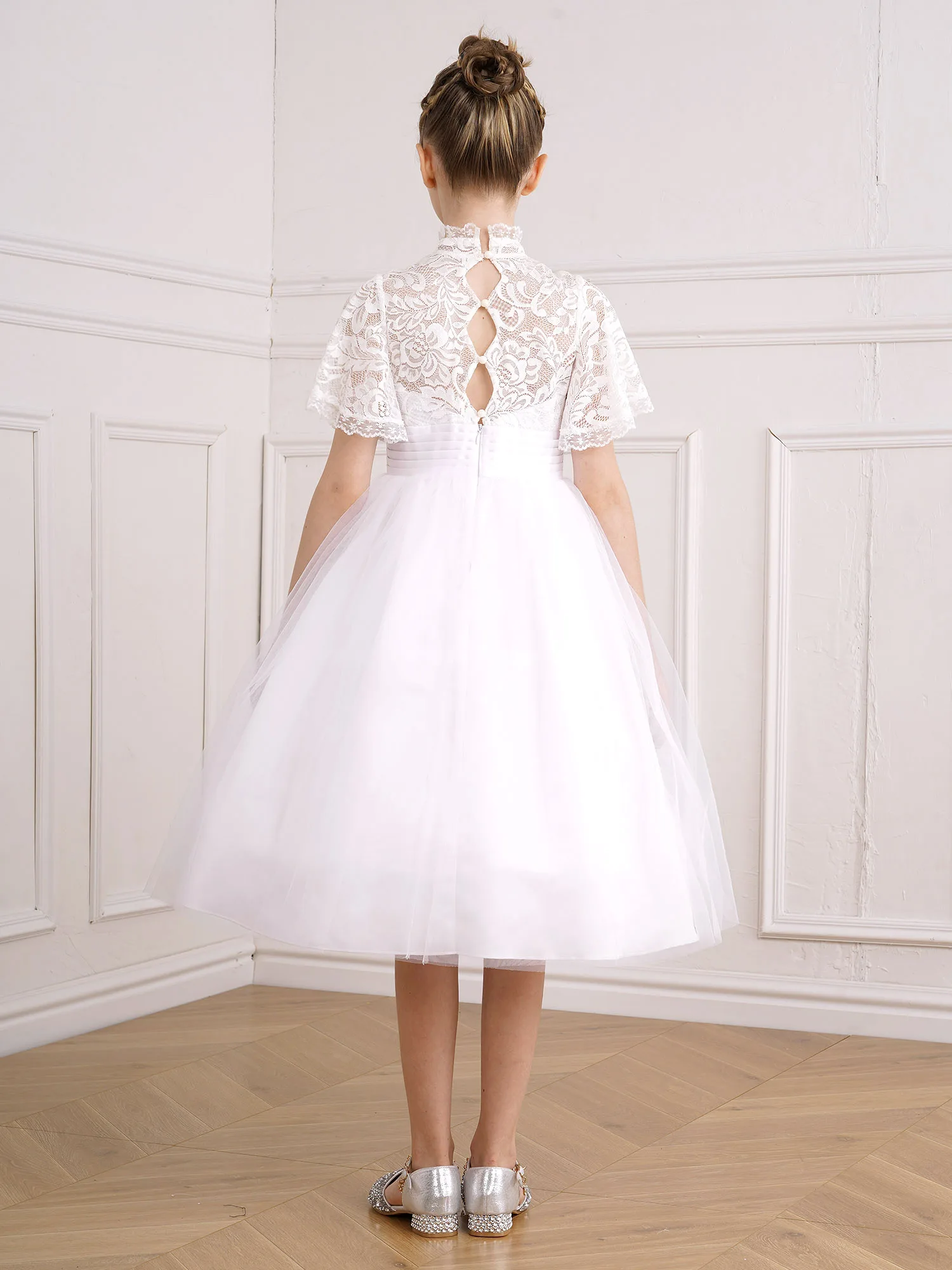 Diseñado con corpiño de encaje y dobladillo de tul, cuello alto, manga corta acampanada, cintura plisada de satén, dobladillo de 5 capas, botón trasero y cierre de cremallera.