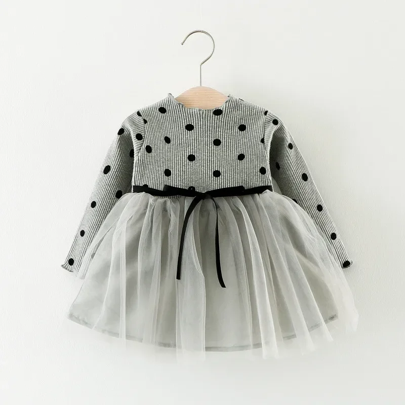 Comprar Vestidos de niña negro blanco rosa malla Casual niñas pequeñas estampado de puntos vestido de manga larga niños vestido veraniego de princesa ropa