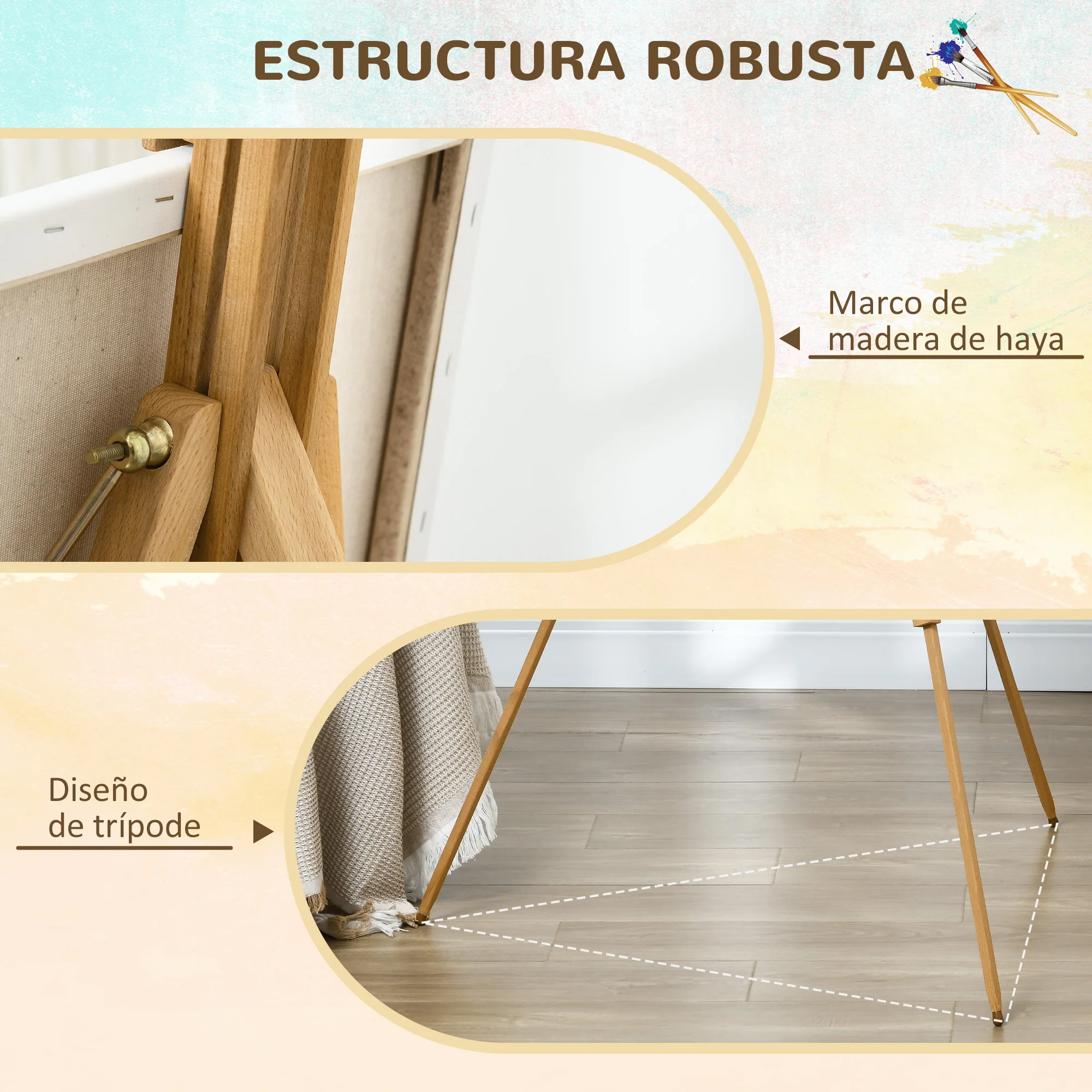 Fabricado en madera de haya, este caballete para pintar de Vinsetto no solo ofrece un soporte resistente y estable gracias a su diseño de trípode, sino que también se adapta a tus necesidades. Con su altura ajustable, puedes pintar cómodamente tanto de pie como sentado, lo que te permite mantener una postura adecuada y reducir la fatiga. Además, su diseño plegable lo hace fácil de transportar y almacenar, lo que lo convierte en una herramienta indispensable para cualquier artista.