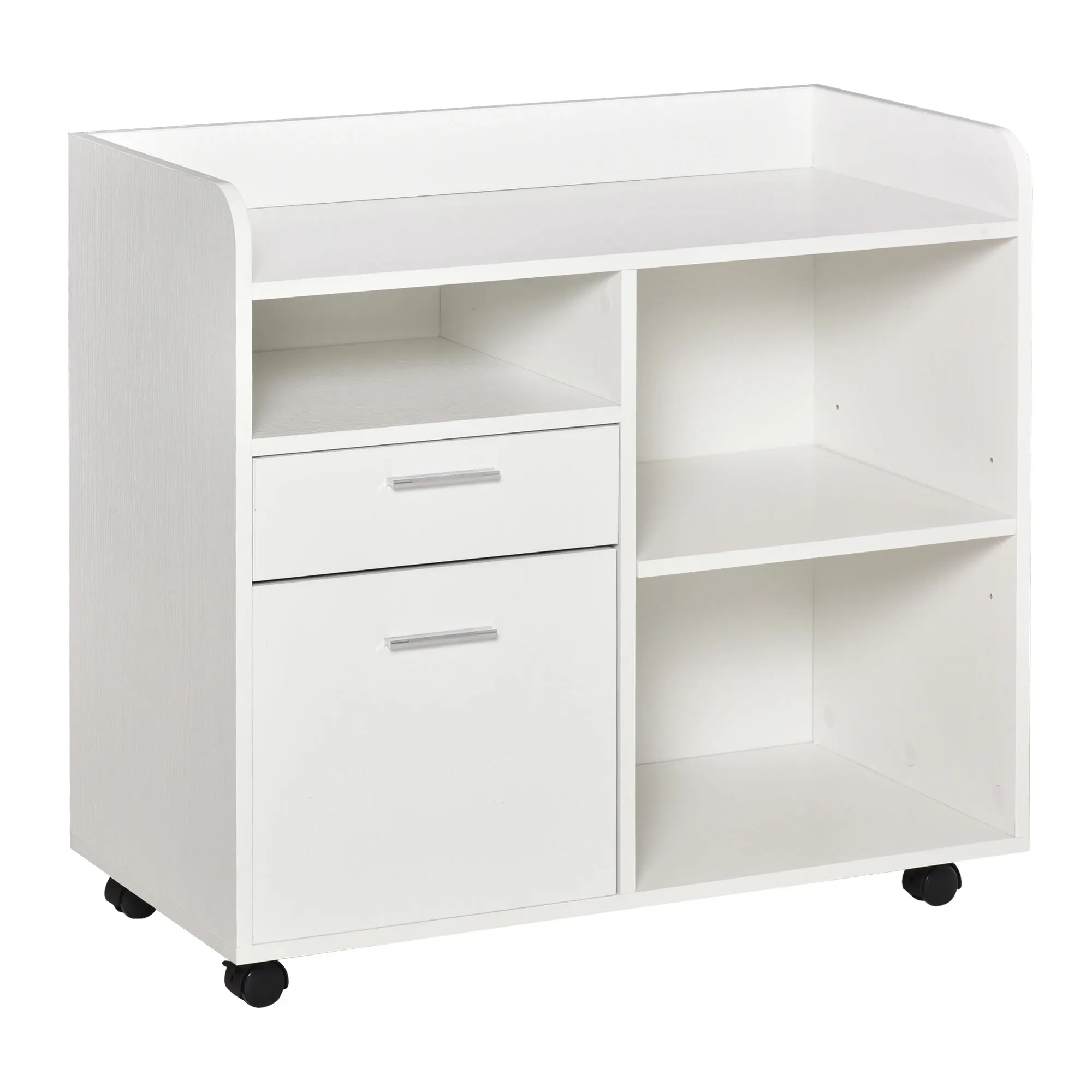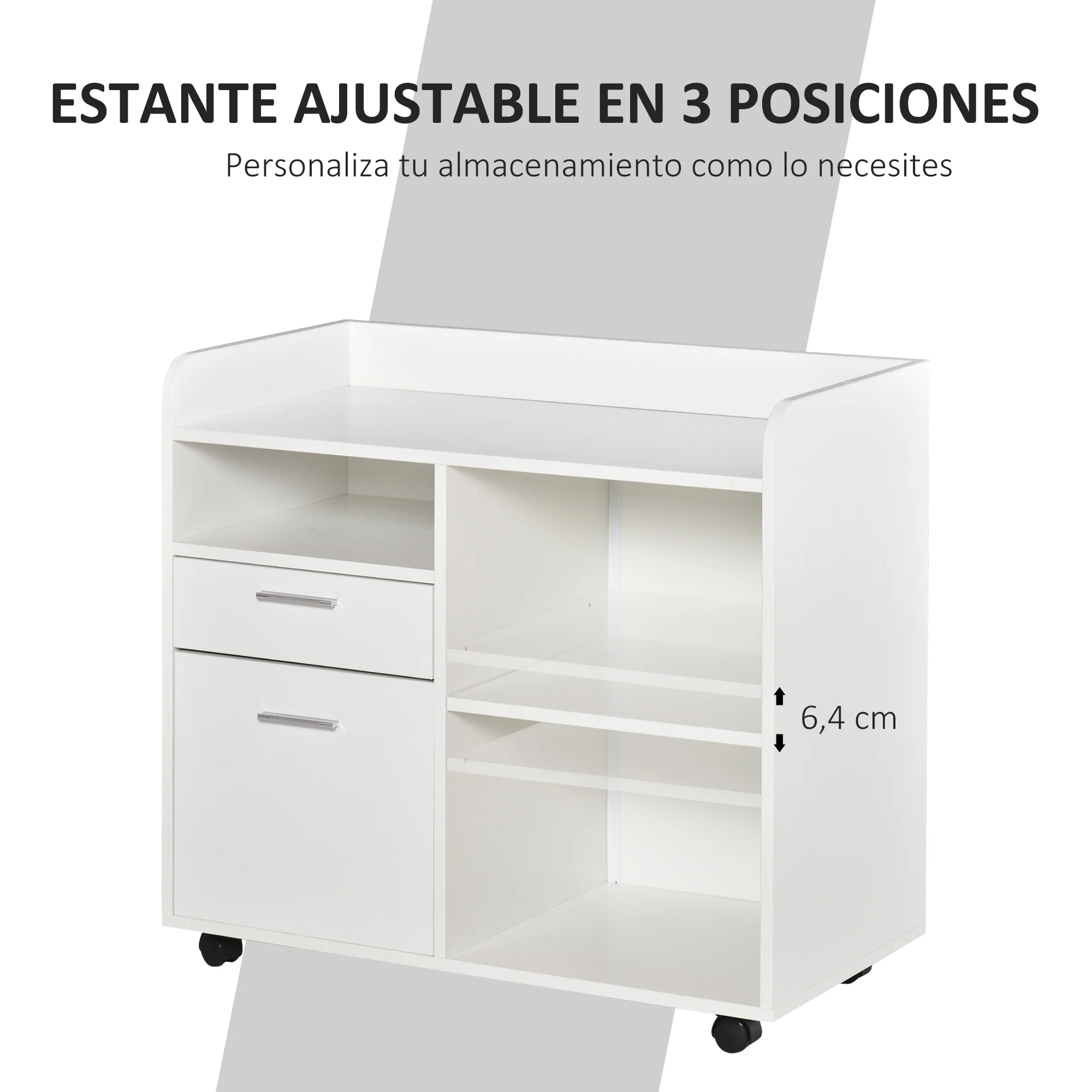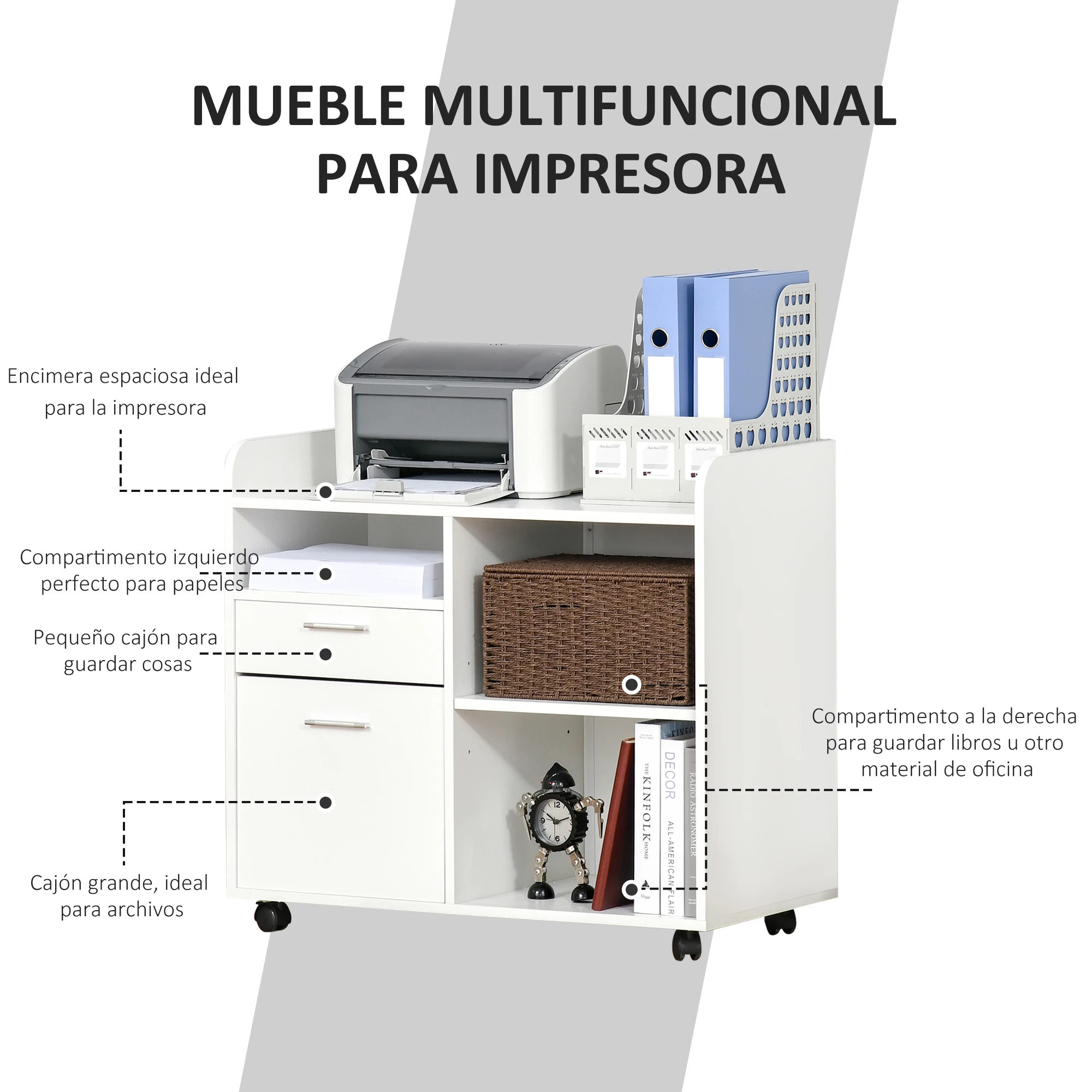 ¿En la oficina no tienes espacio para poner las impresoras? ¿Los archivos siempre están desordenados? Esta cajonera con ruedas de Vinsetto te ayudará a organizar toda la oficina. Tiene espacio suficiente para colocar la impresora u otras máquinas de oficina en la encimera. Movilidad total gracias a sus 4 ruedas 360º.