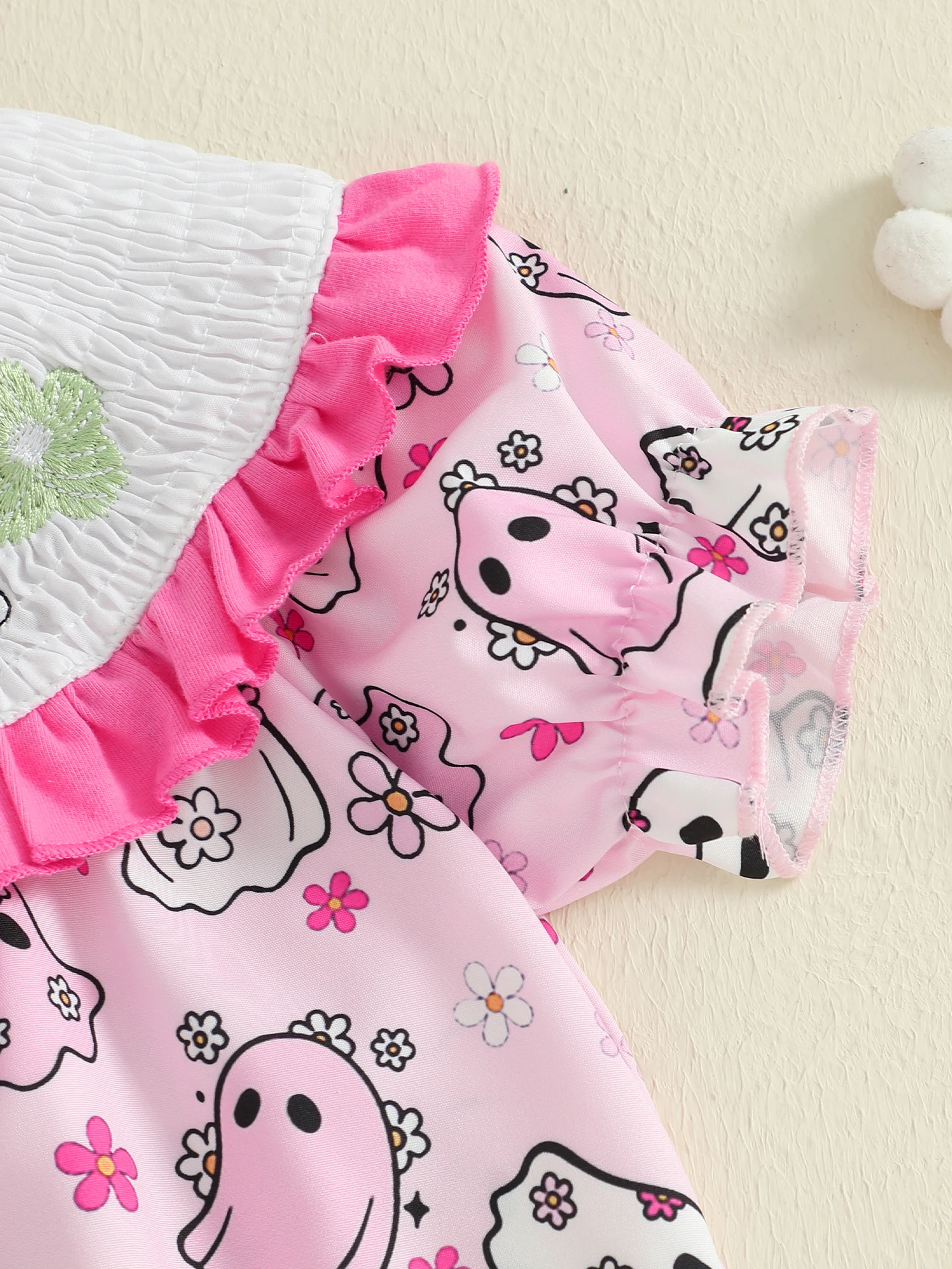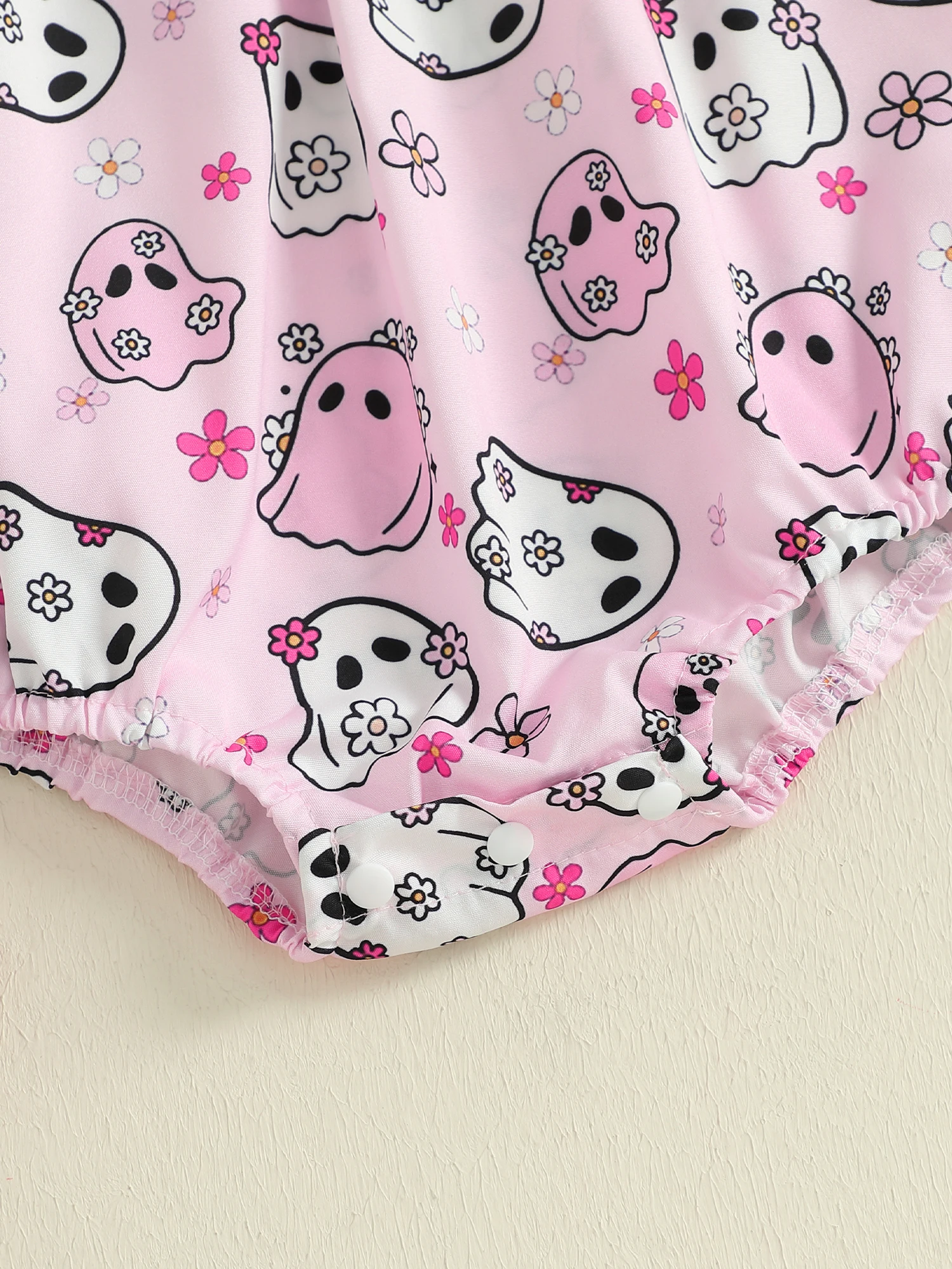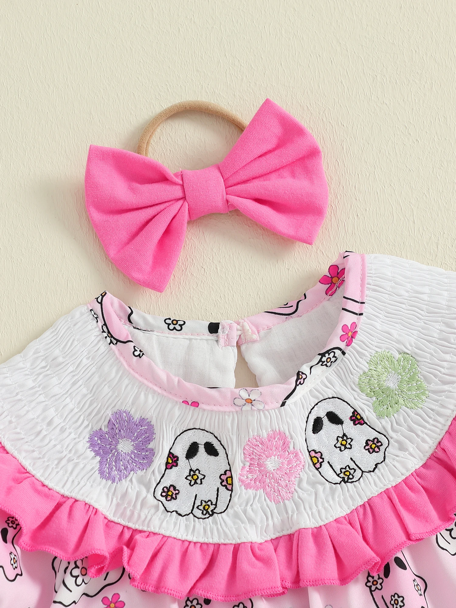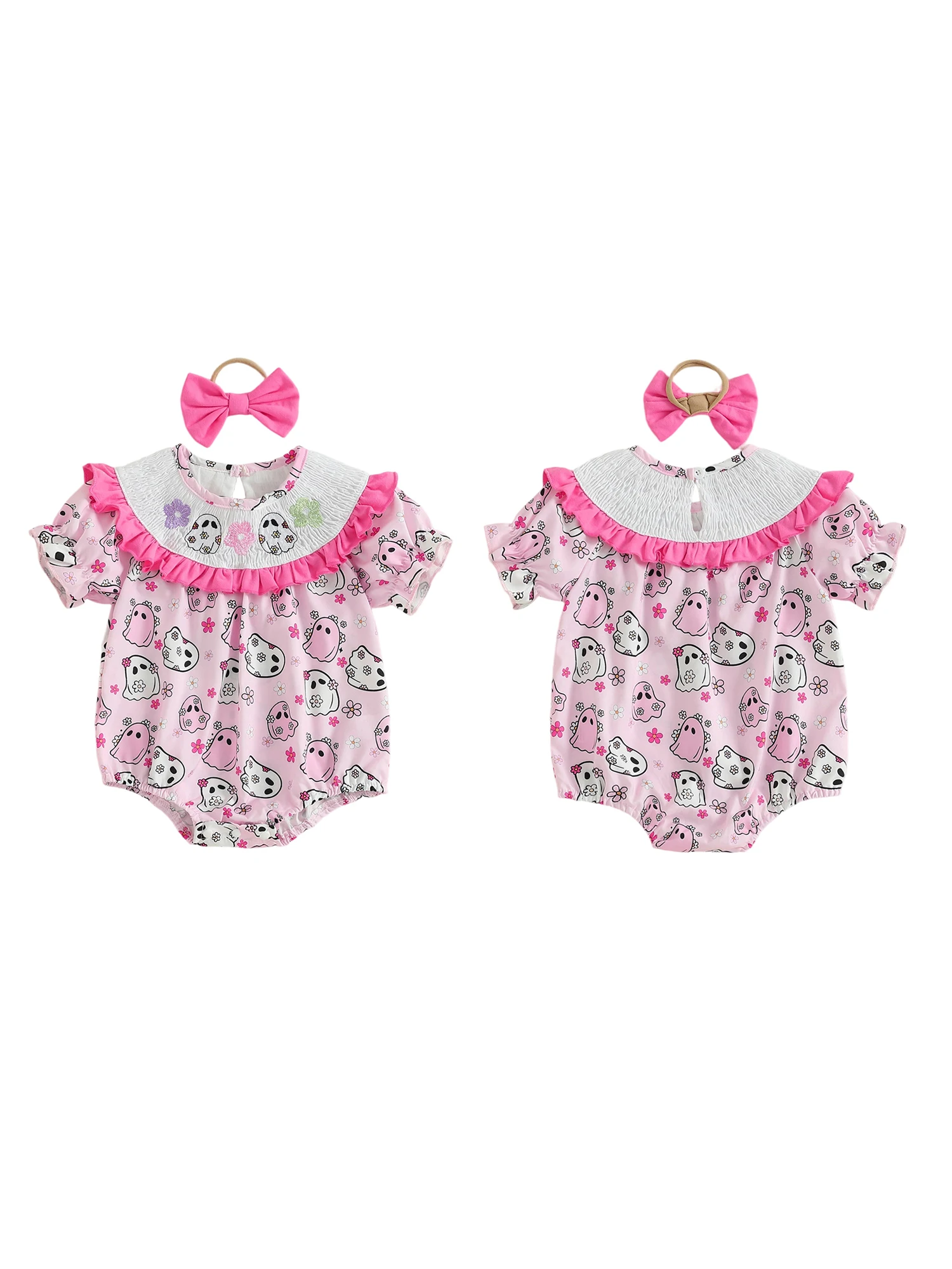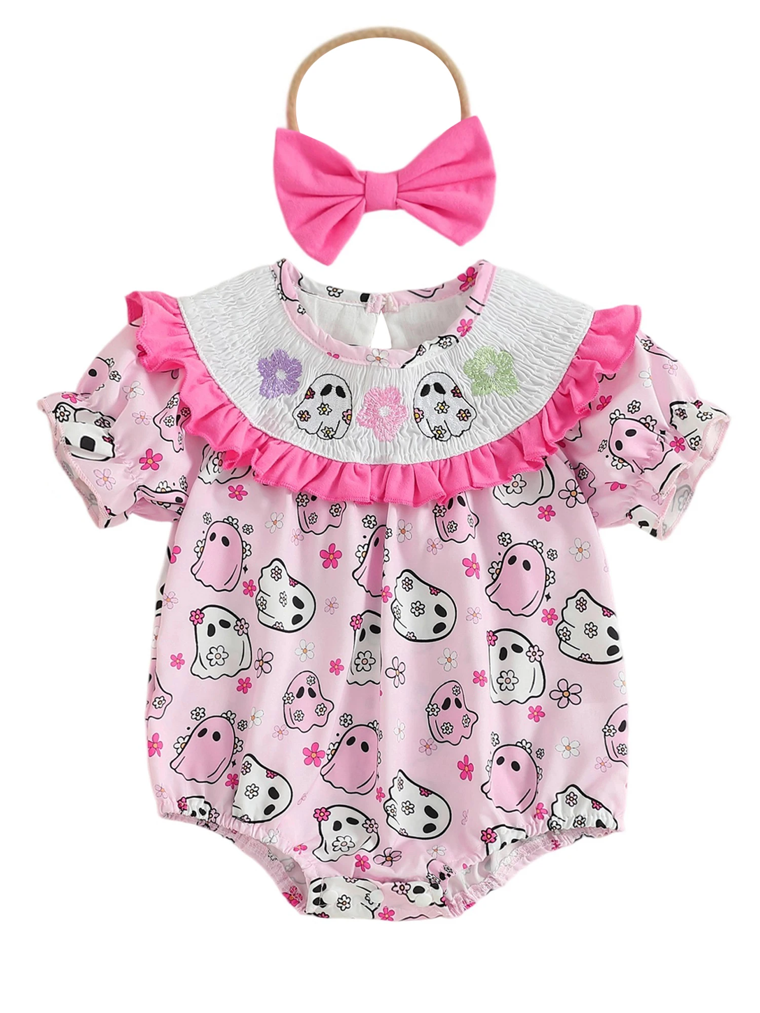 Traje para niña recién nacida, mameluco de manga corta con cuello redondo y estampado de fantasma con lazo, diadema, ropa de Halloween