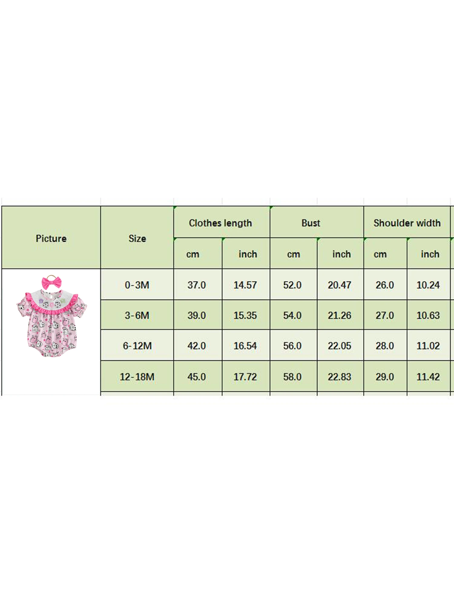 Tabla de tallas Tamaño (cm) 0-3M Longitud: 37 Busto: 52 Hombro: 26 Edad sugerida: 0-3 meses 3-6M Longitud: 39 Busto: 54 Hombro: 27 Edad sugerida: 3-6 meses 6-12M Longitud: 42 Busto: 56 Hombro: 28 Edad sugerida: 6-12 meses 12-18M Longitud: 45 Busto: 58 Hombro: 29 Edad sugerida: 12-18 meses