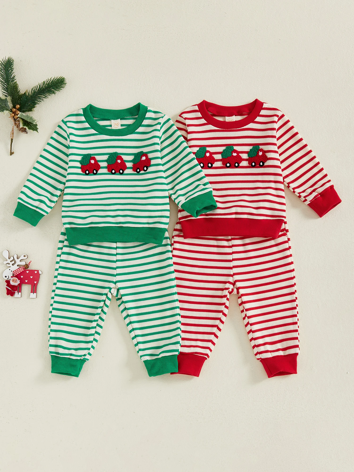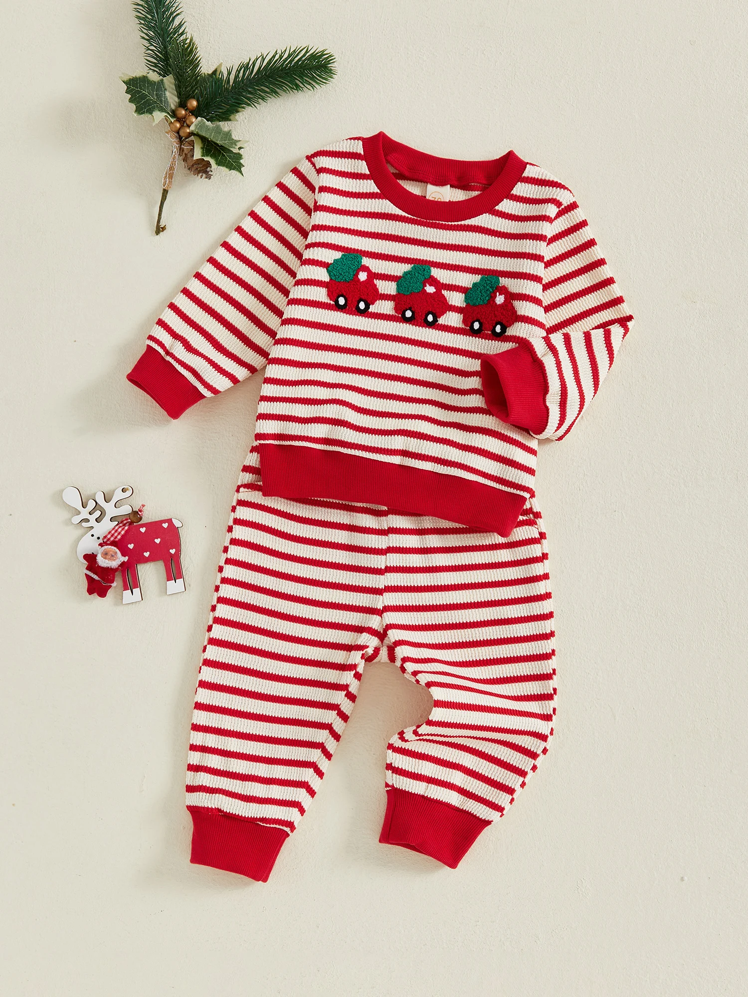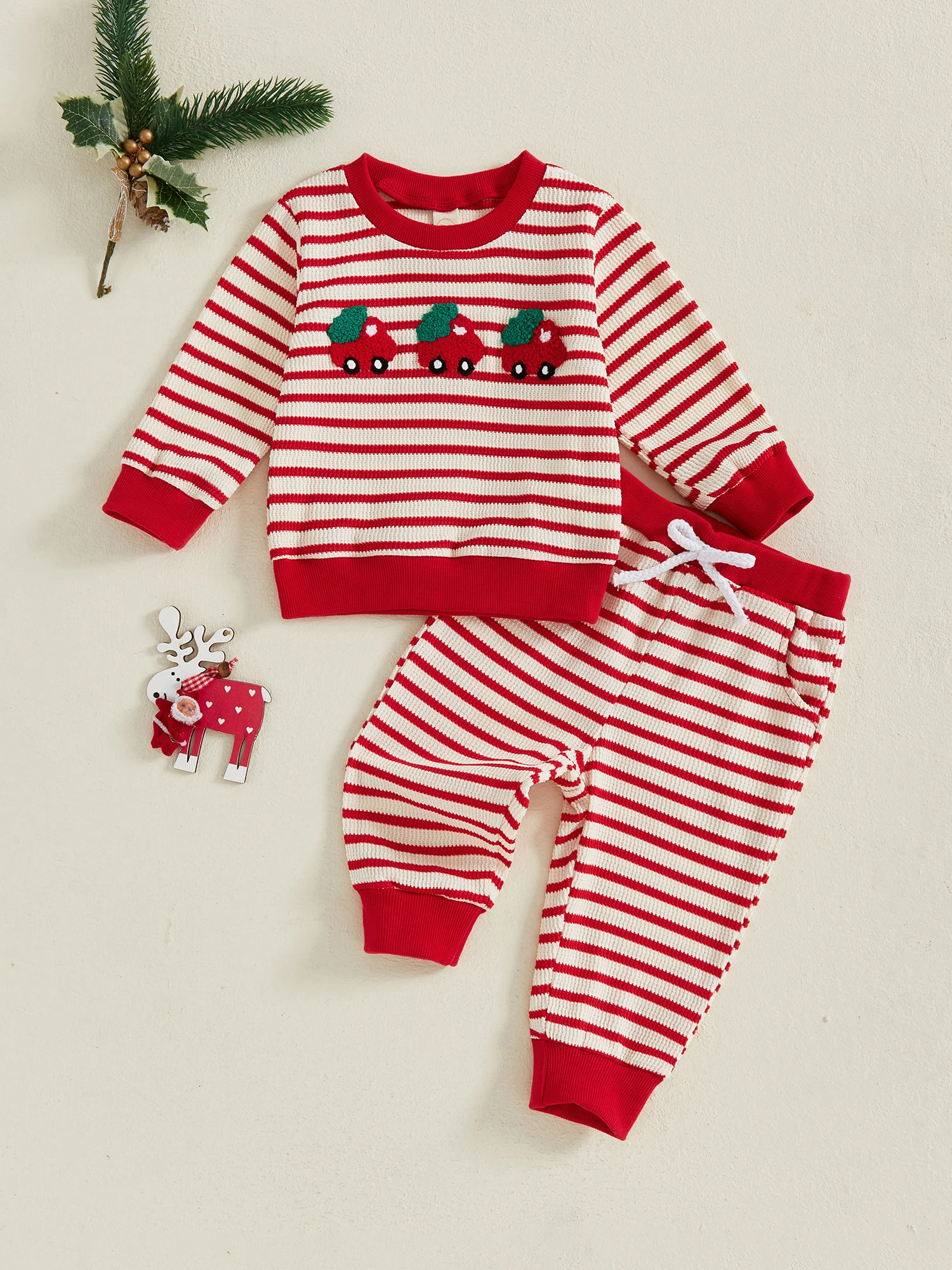 Conjunto de 2 piezas para bebé, suéter y pantalones de manga larga con cuello redondo y rayas bordadas en coche