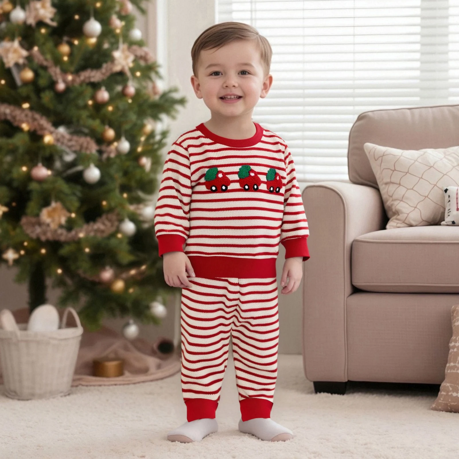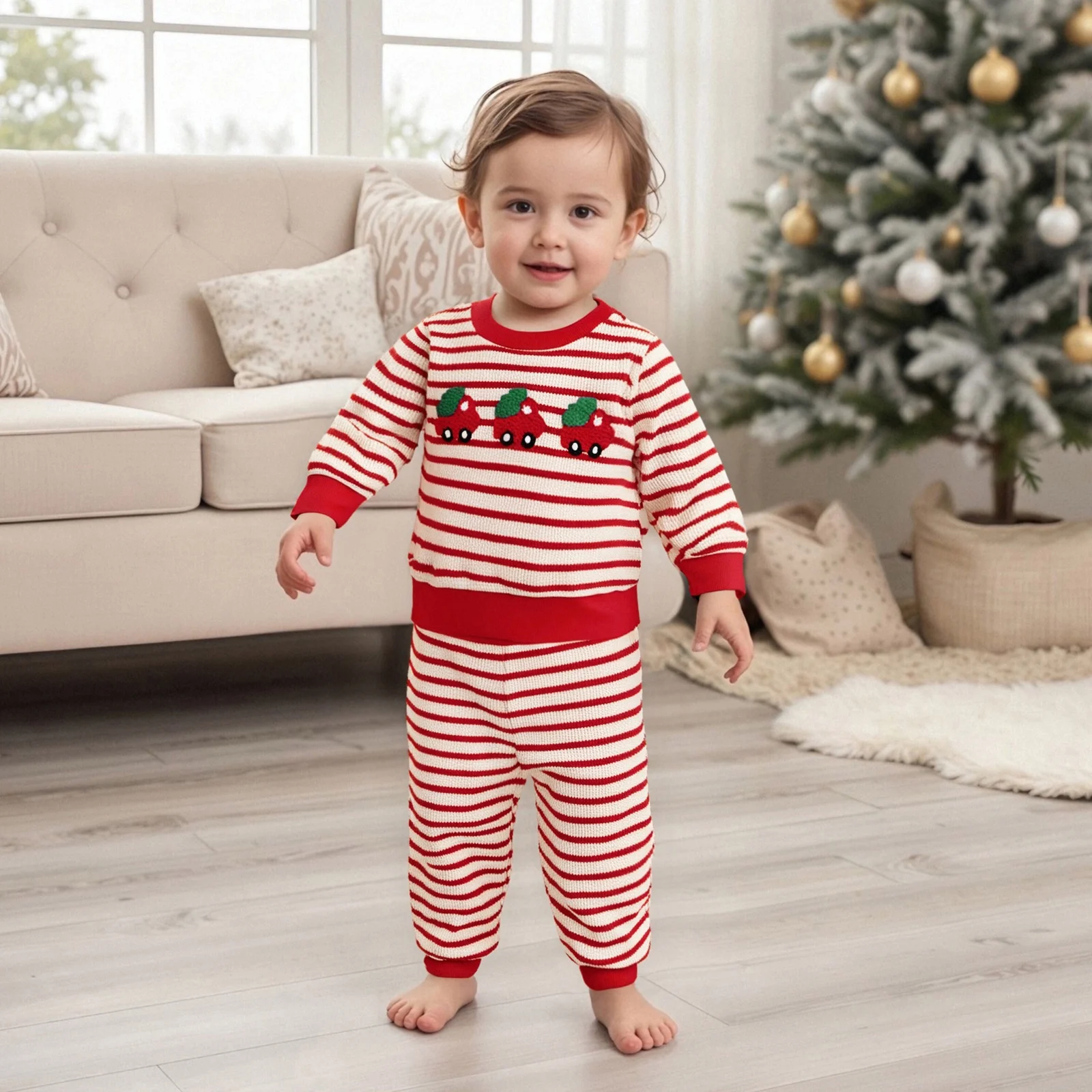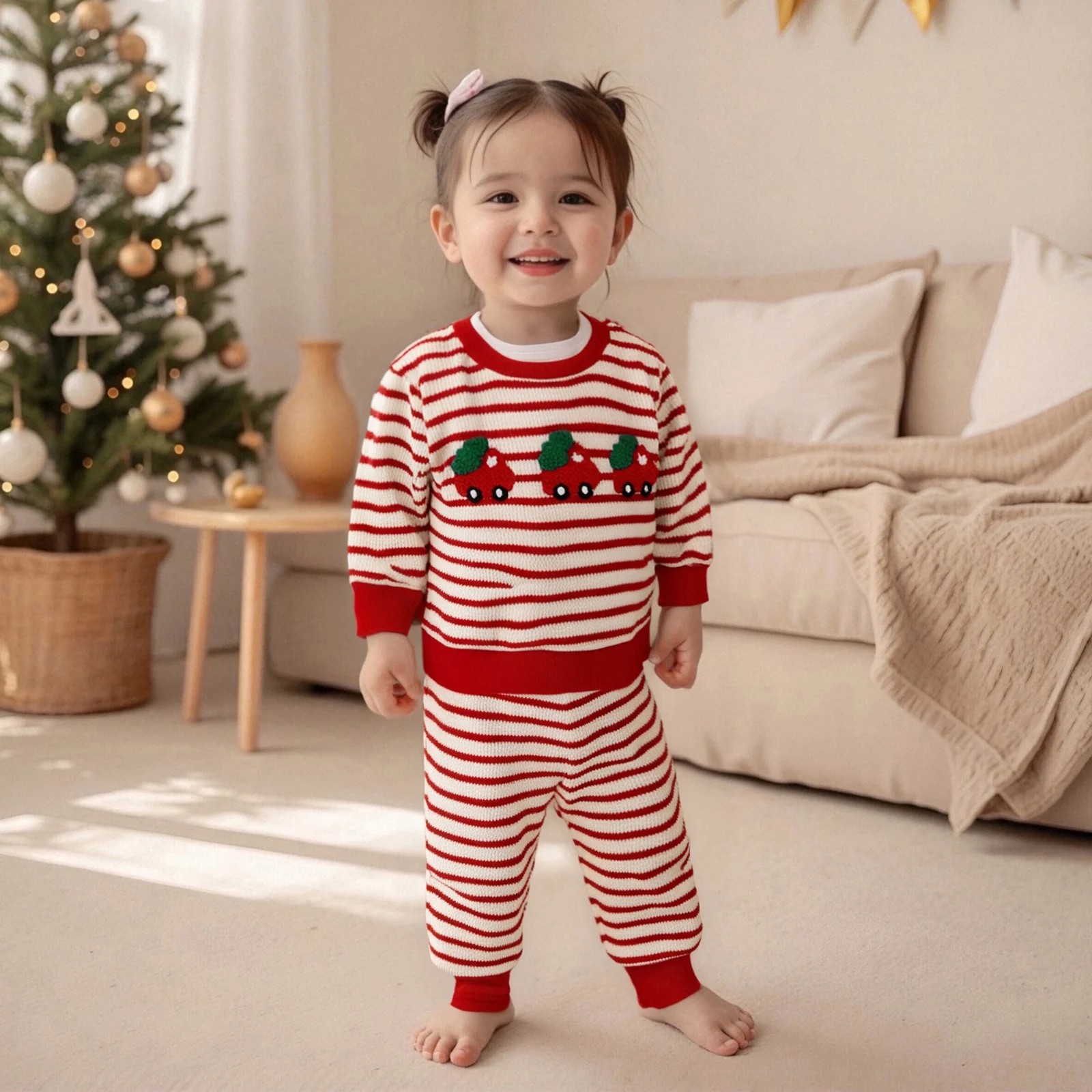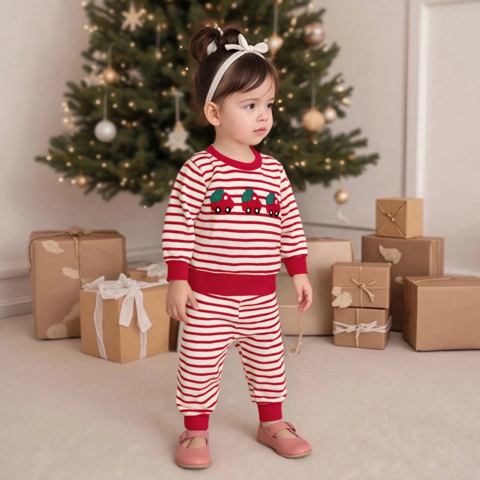 Conjunto de 2 piezas para bebé, suéter y pantalones de manga larga con cuello redondo y rayas bordadas en coche