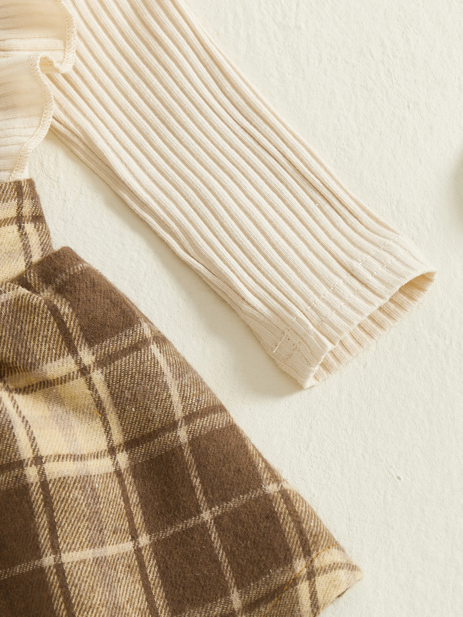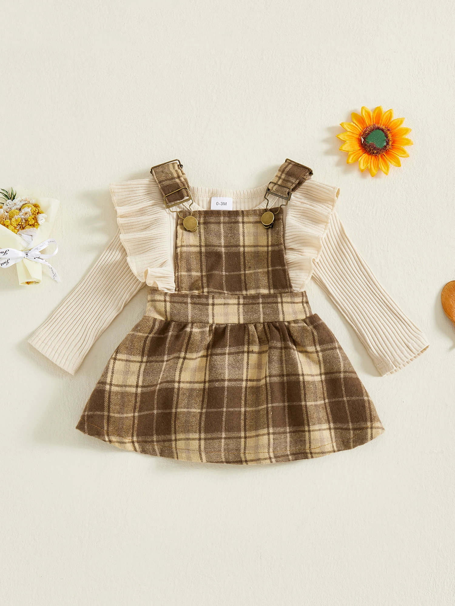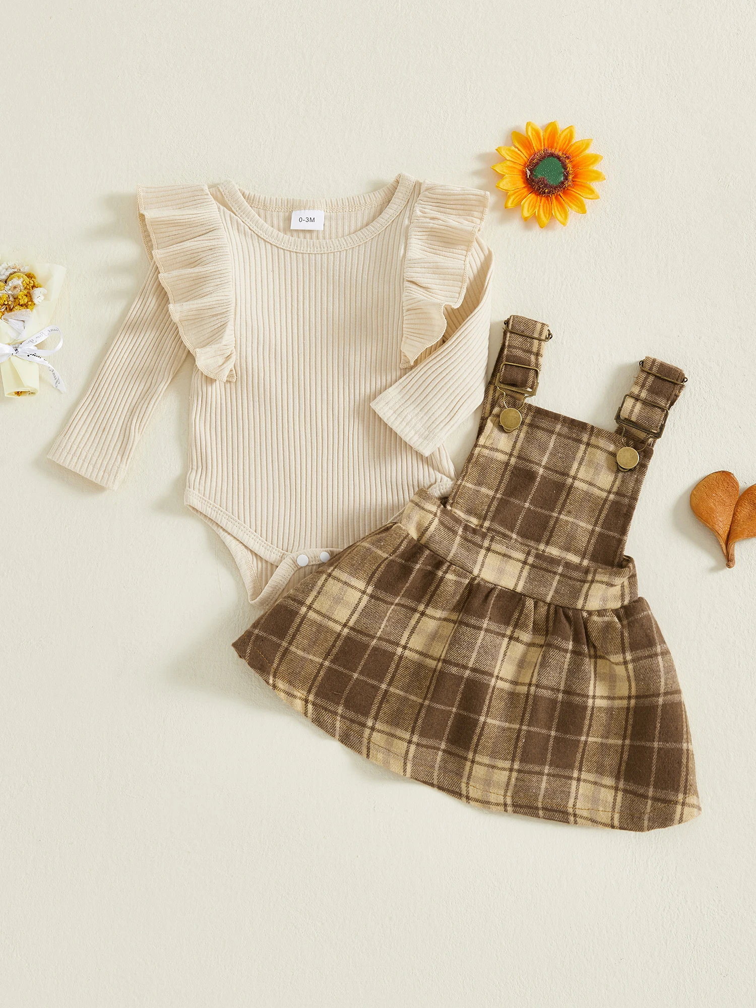 Conjunto de 2 piezas para niñas, mameluco de manga larga con volantes acanalados y vestido con tirantes a cuadros, ropa linda de otoño