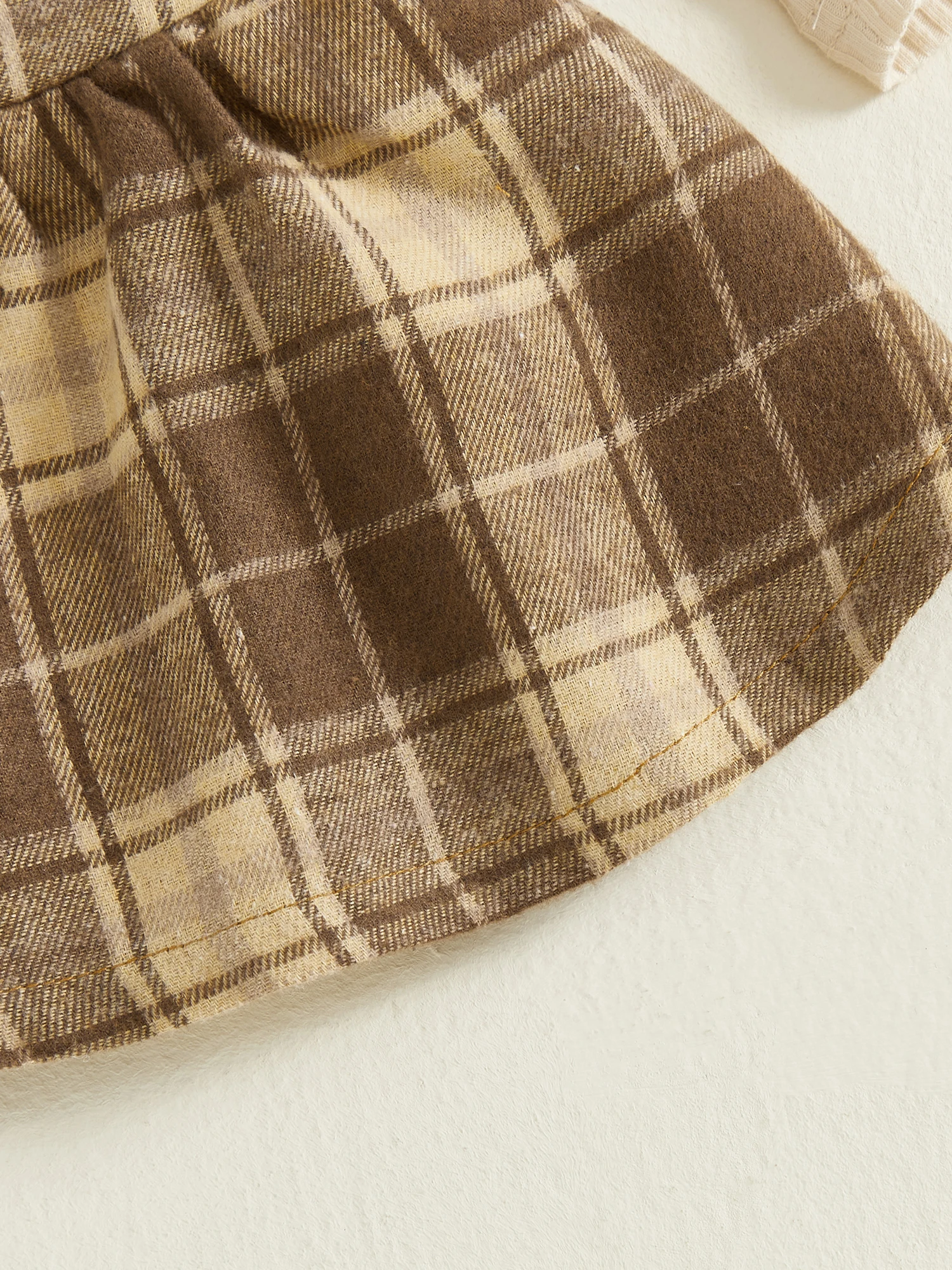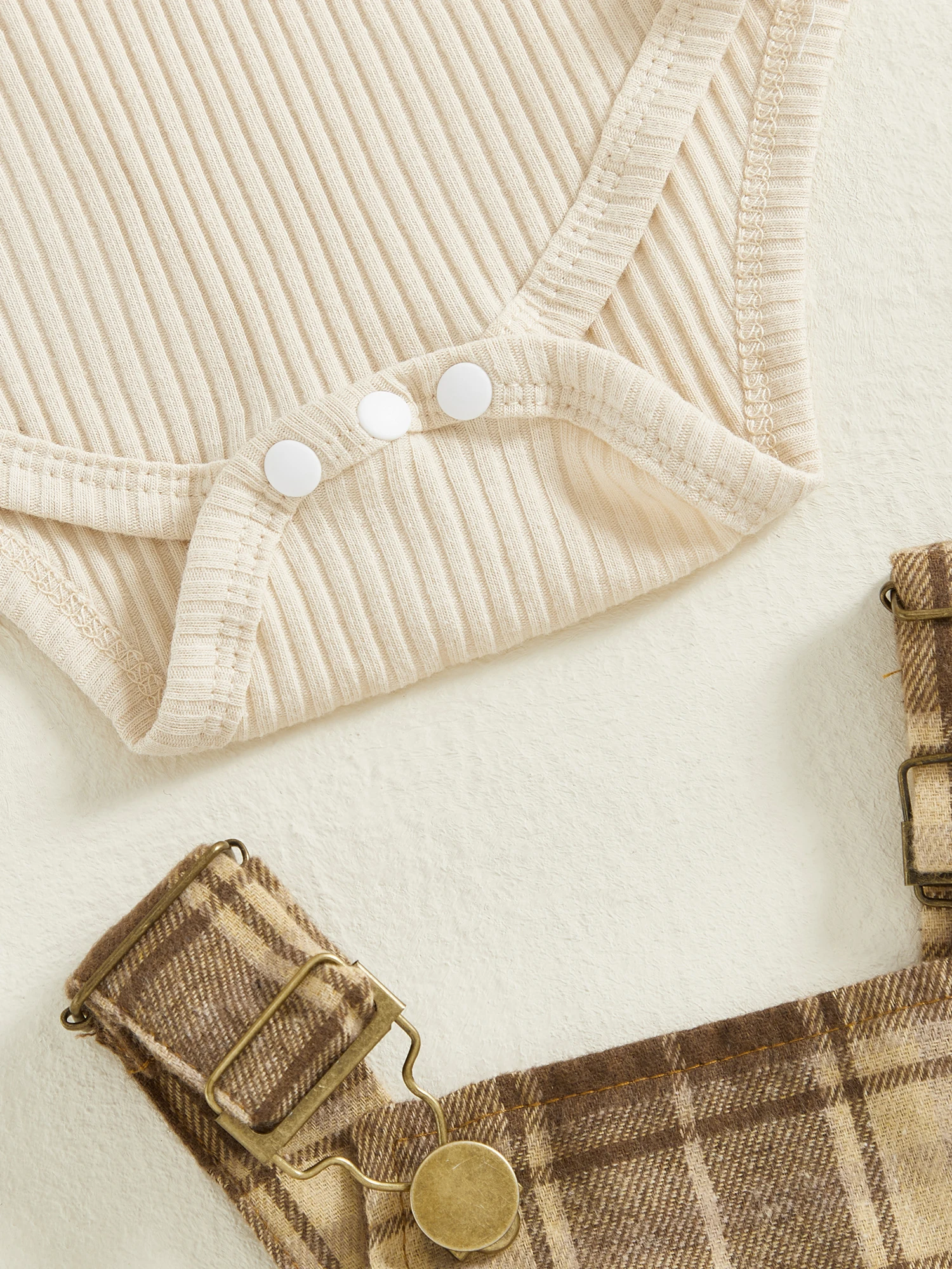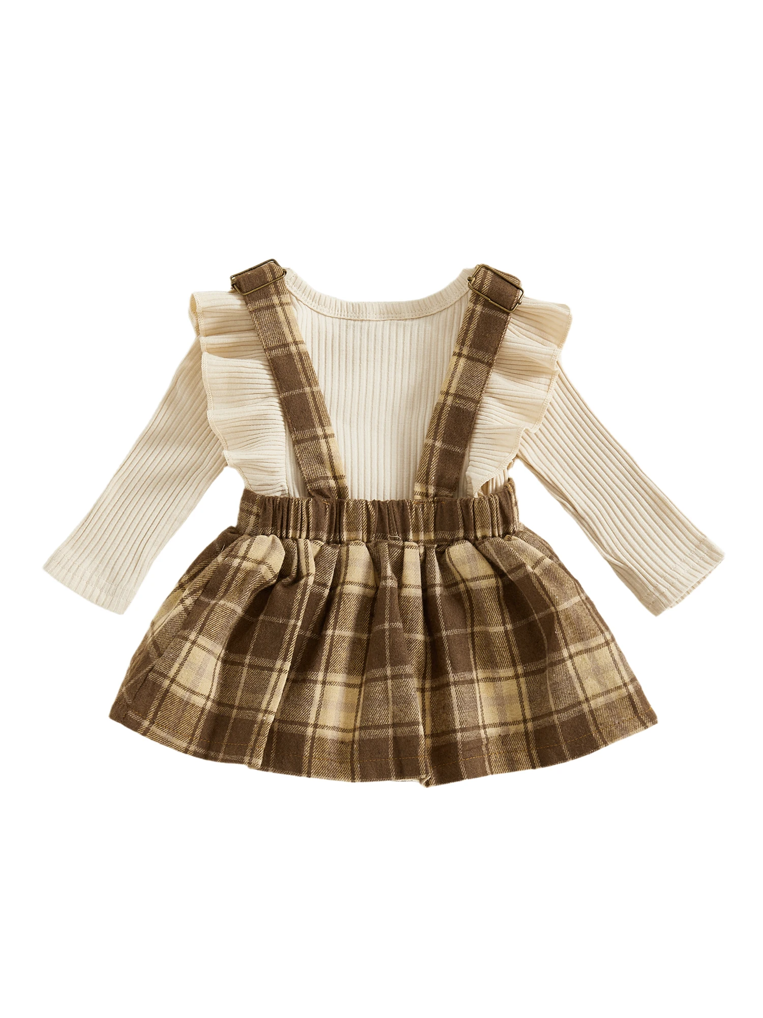Conjunto de 2 piezas para niñas, mameluco de manga larga con volantes acanalados y vestido con tirantes a cuadros, ropa linda de otoño