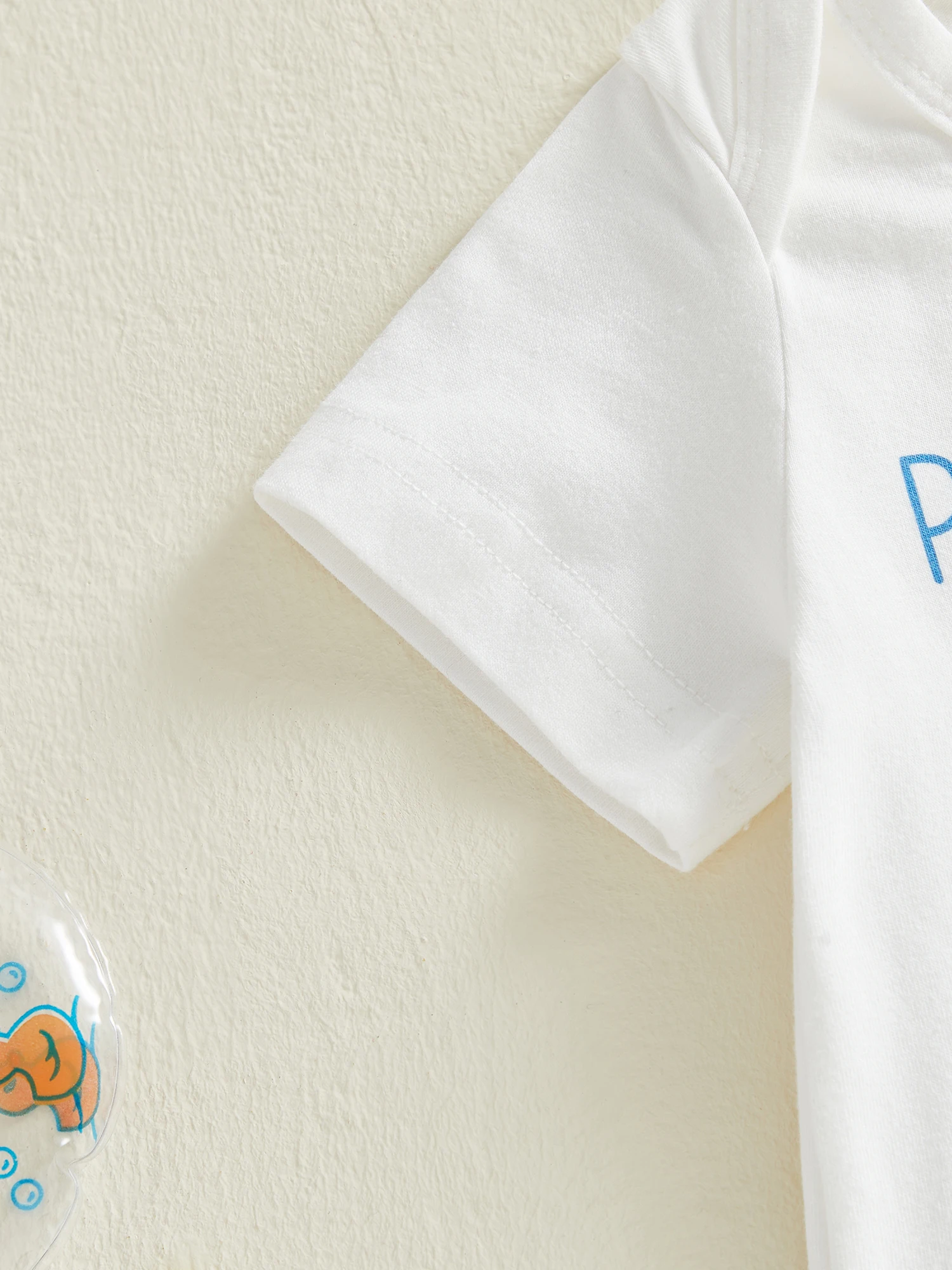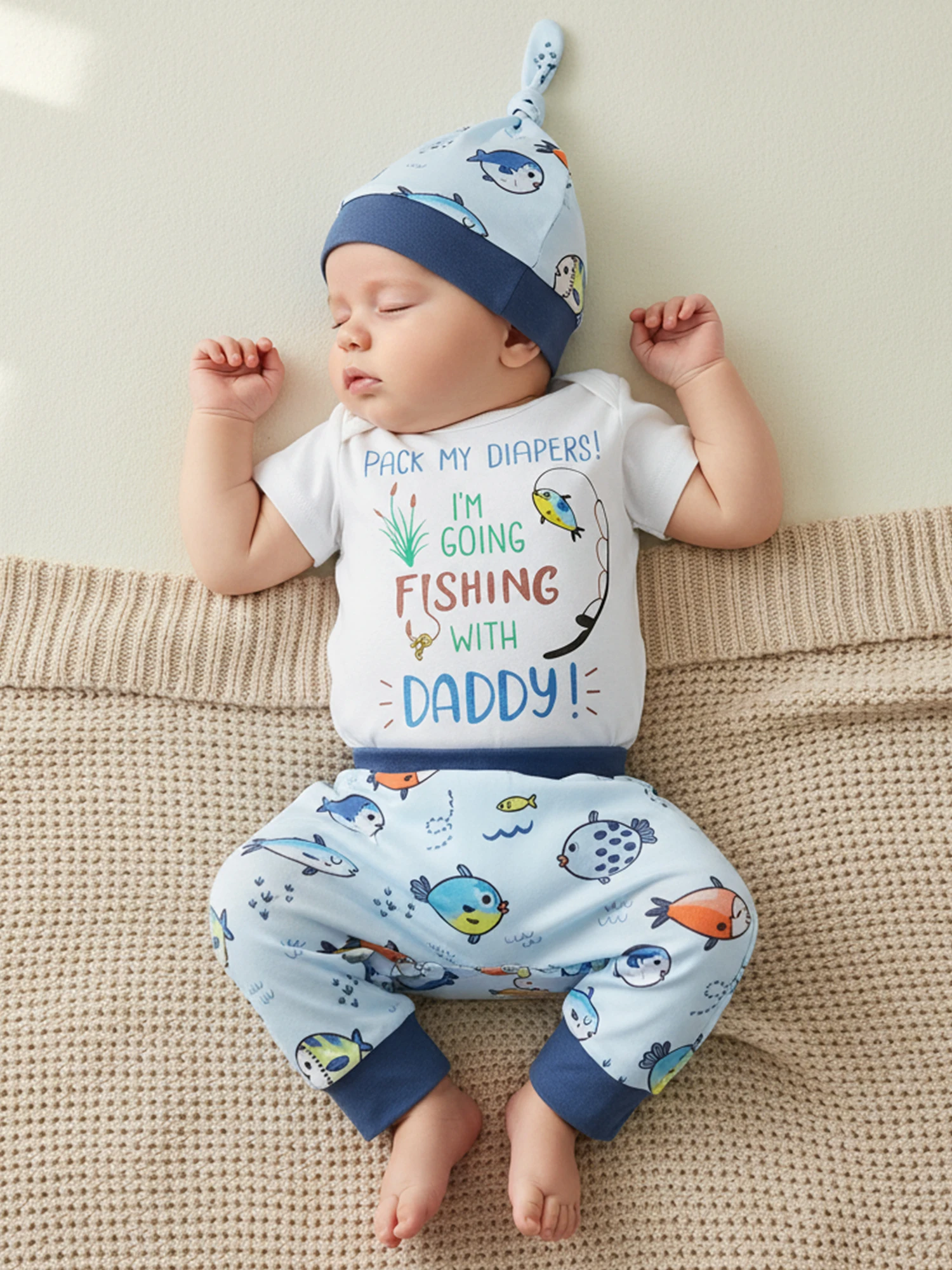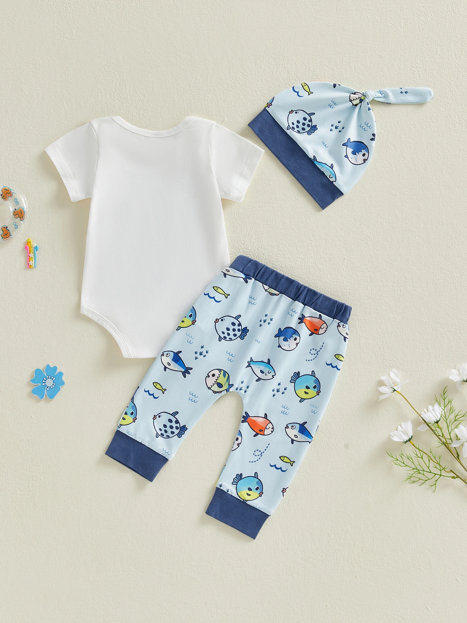Conjunto de 3 piezas de verano para bebé, cuello redondo, manga corta, estampado de letras, mameluco, cintura larga elástica, pantalones y sombrero