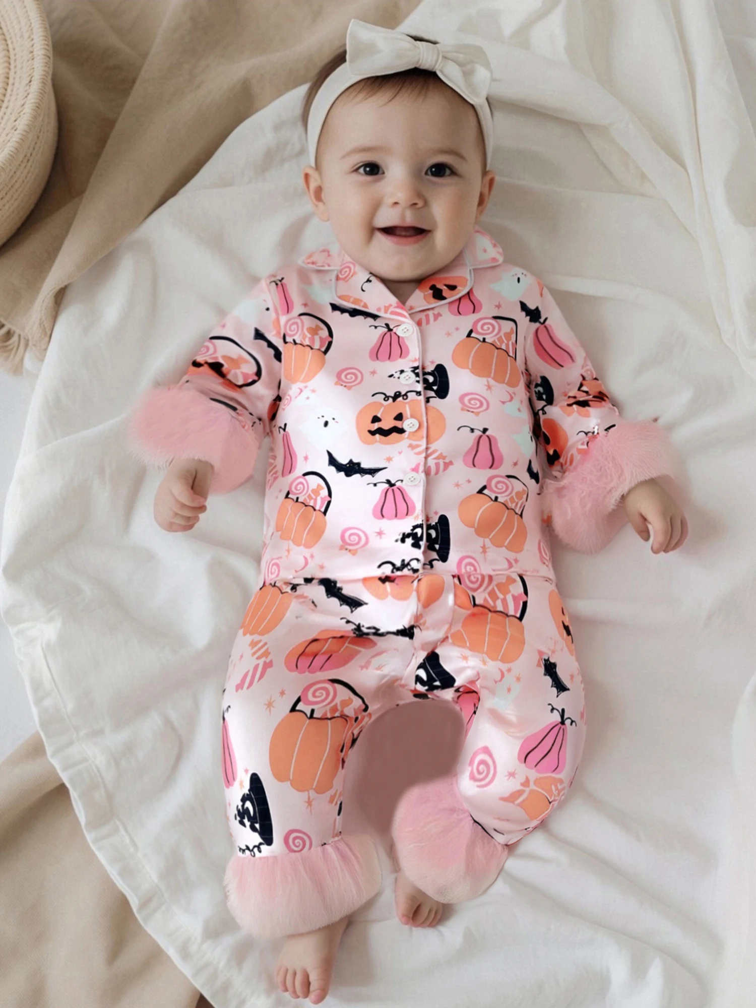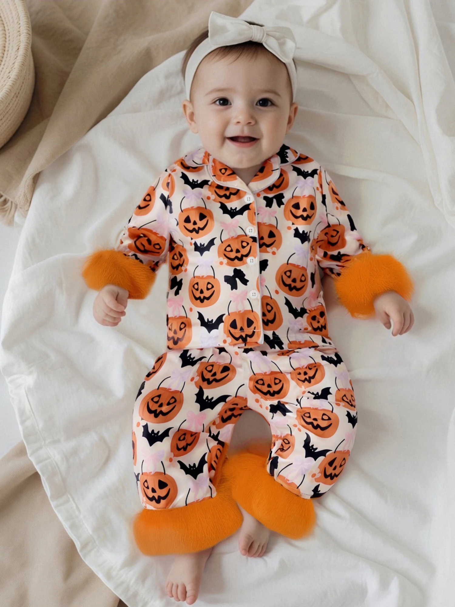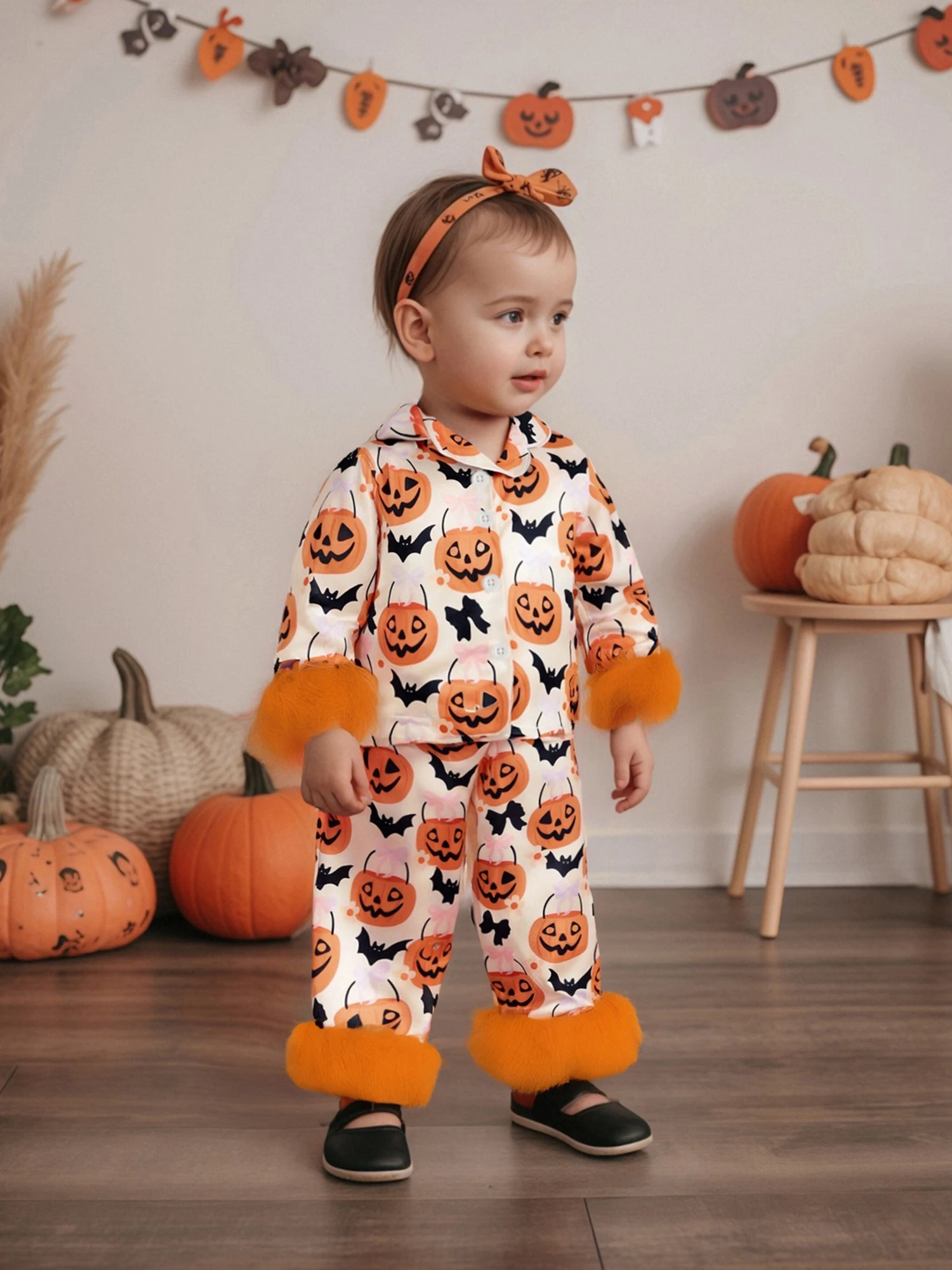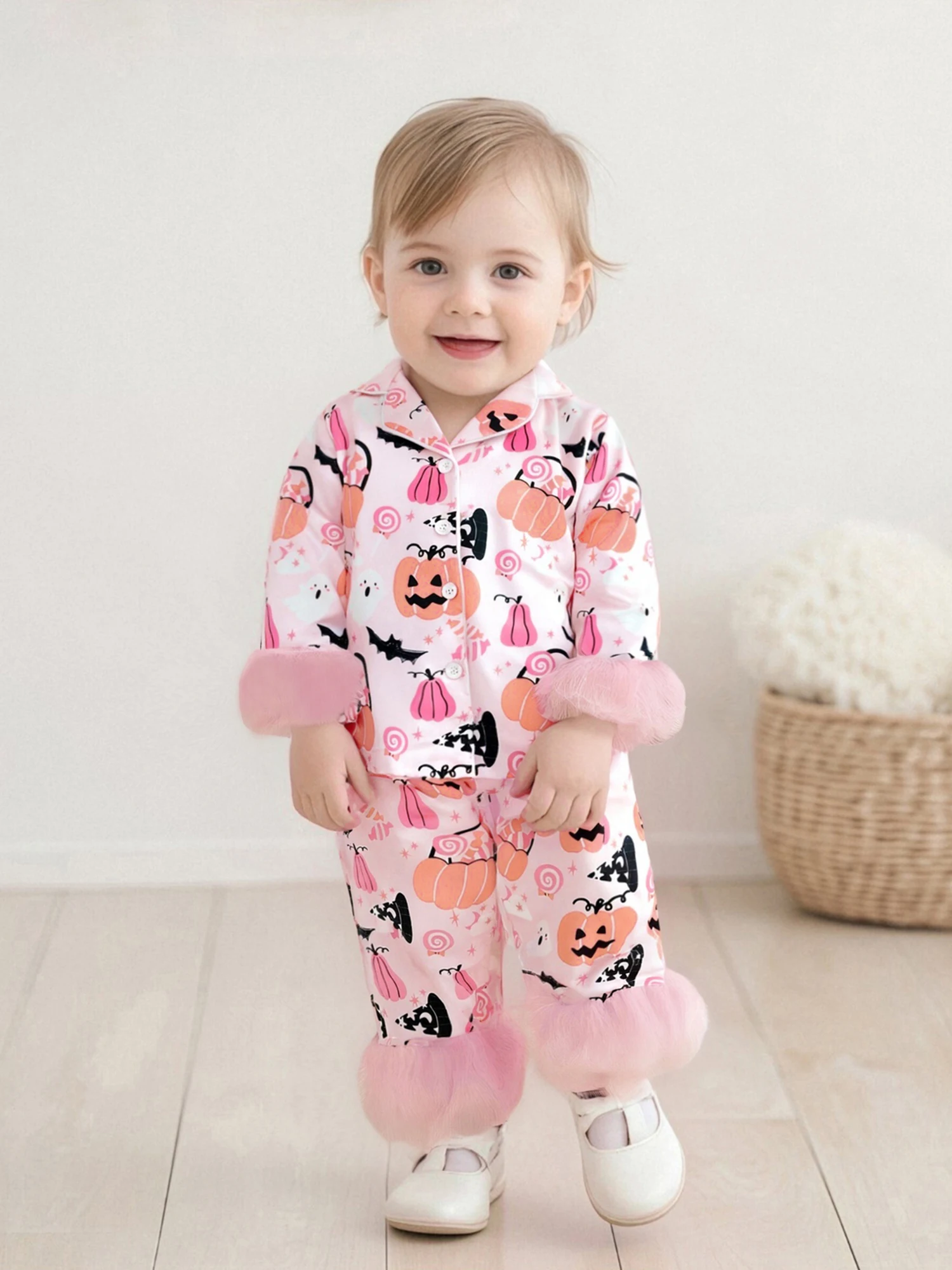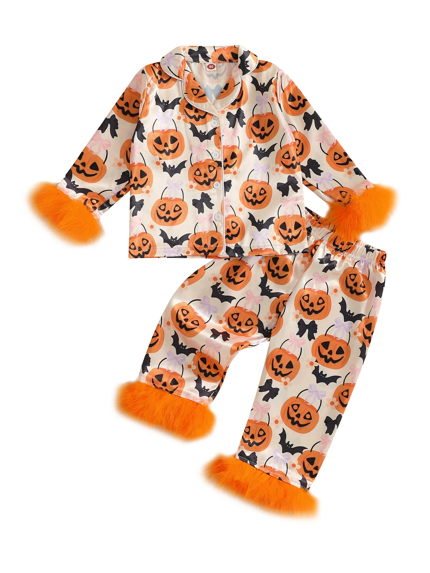 Características Ropa de bebé de Halloween con estampado de calabaza y puños de plumas; Pijama para niña de manga larga, cierre de botón frontal y cuello de solapa; Pantalón de pijama con diseño de cintura elástica, fácil de poner, sencillo y elegante. Adecuado para la hora de dormir, ropa informal, hogar, escuela, camping, contestar la puerta o fiestas de pijamas, deje que sus hijos pasen un momento acogedor en casa.