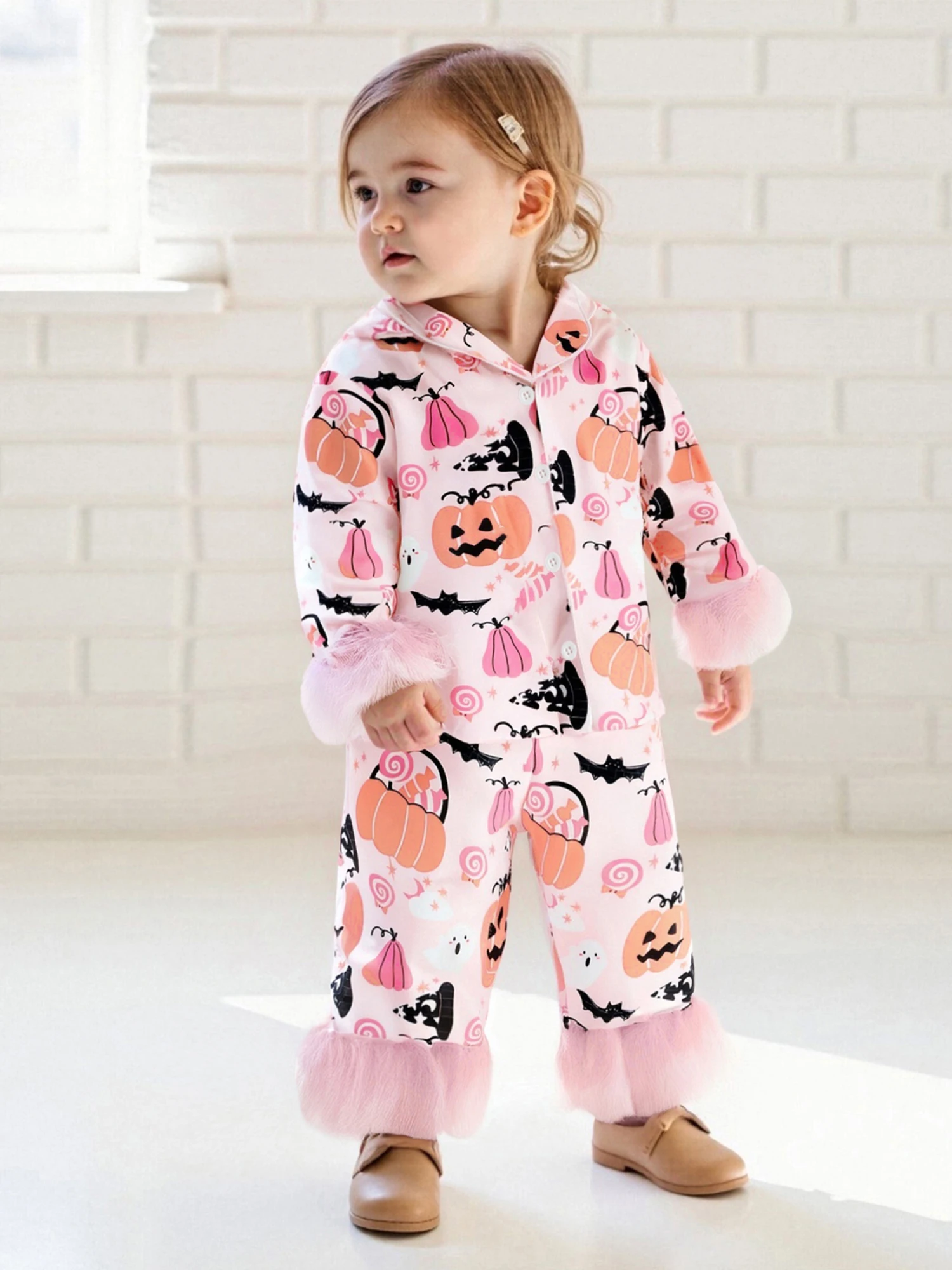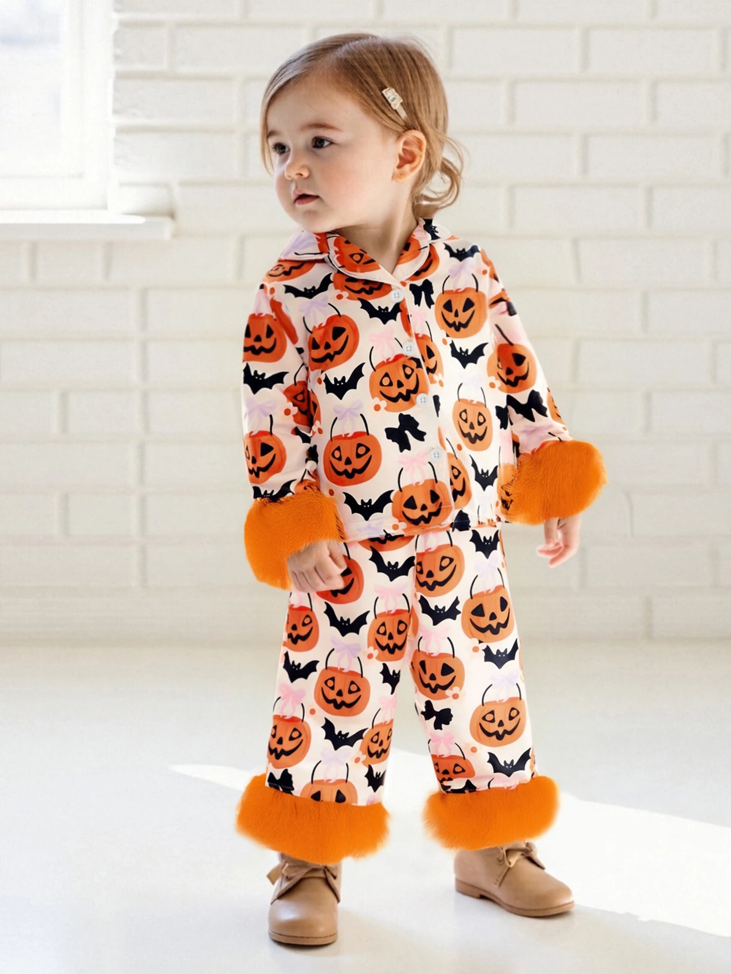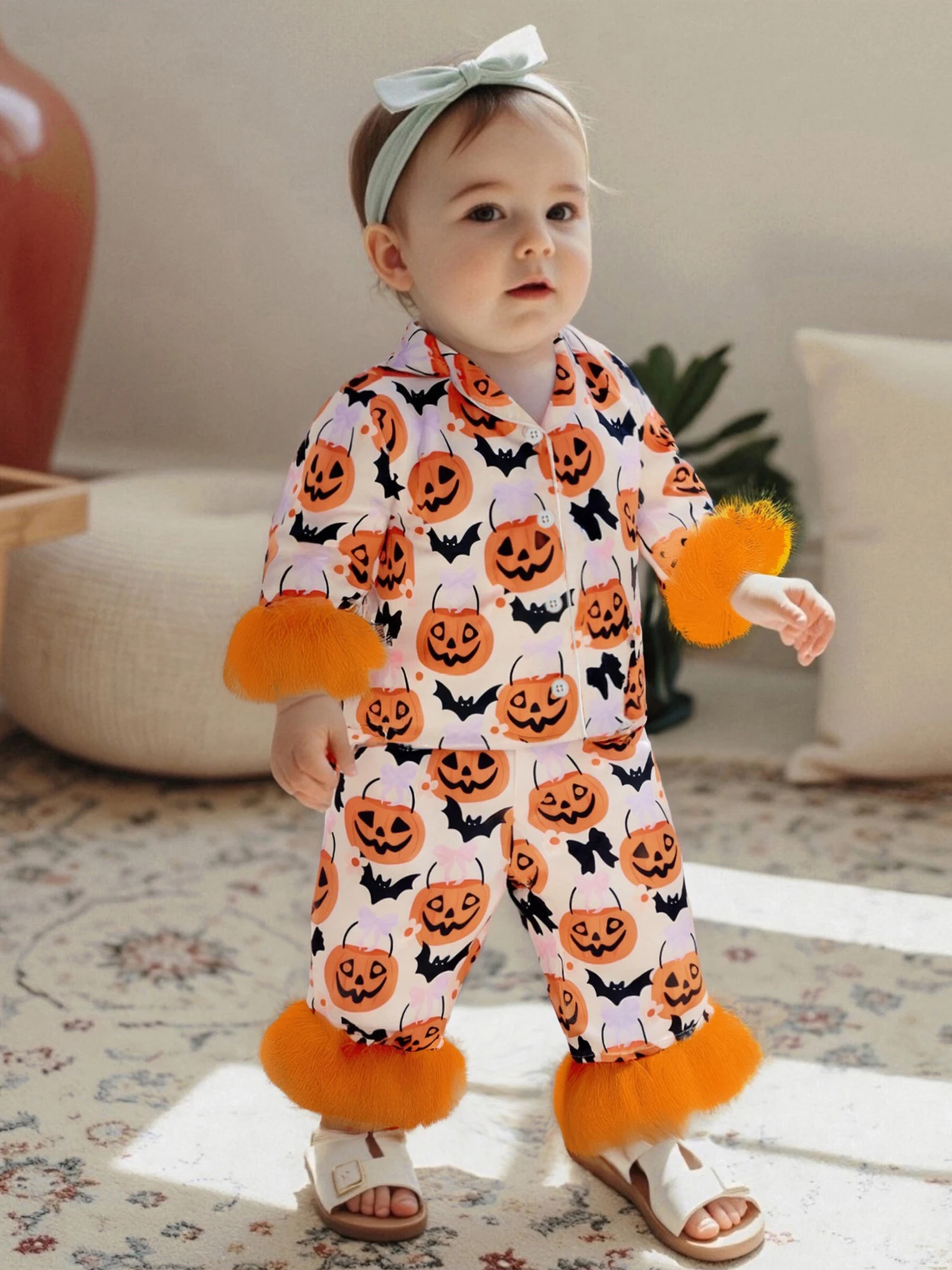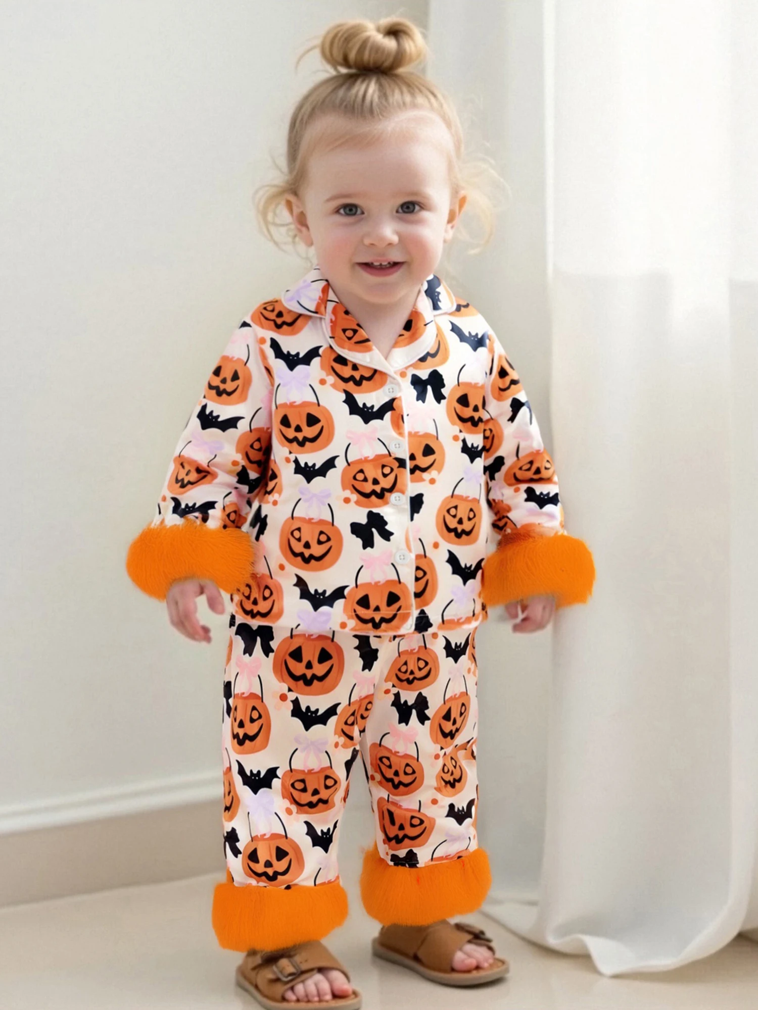 Conjunto de pijamas de Halloween para niñas, puños de plumas, estampado de calabaza, camisa con botones y pantalones elásticos para ropa de descanso