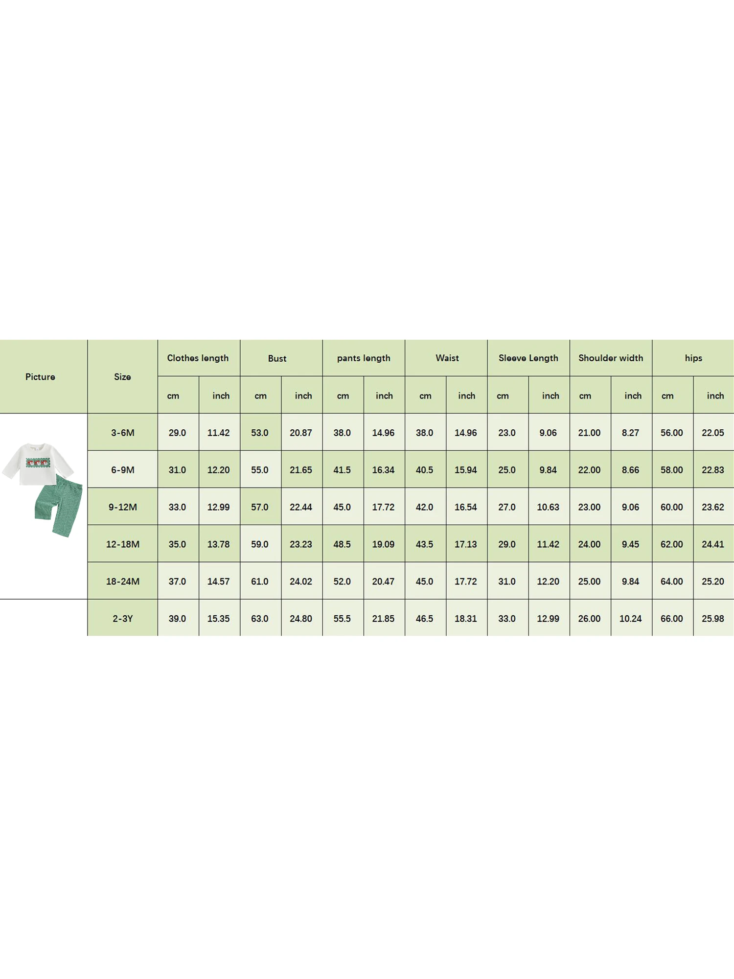 2-3Y Longitud de la camiseta: 39 Busto: 63 Manga: 33 Hombro: 26 Longitud de los pantalones: 55,5 Cintura: 46,5 Cadera: 66 Edad recomendada: 2-3 años