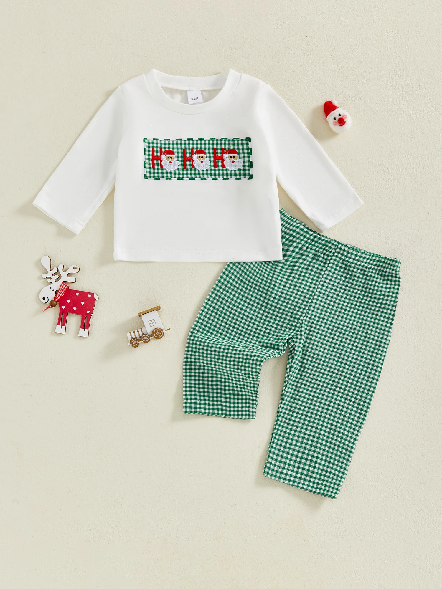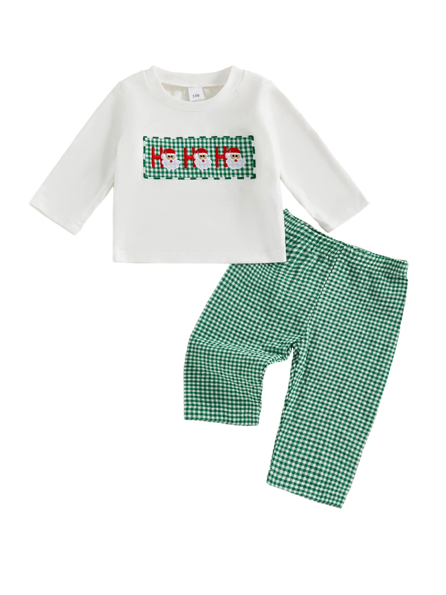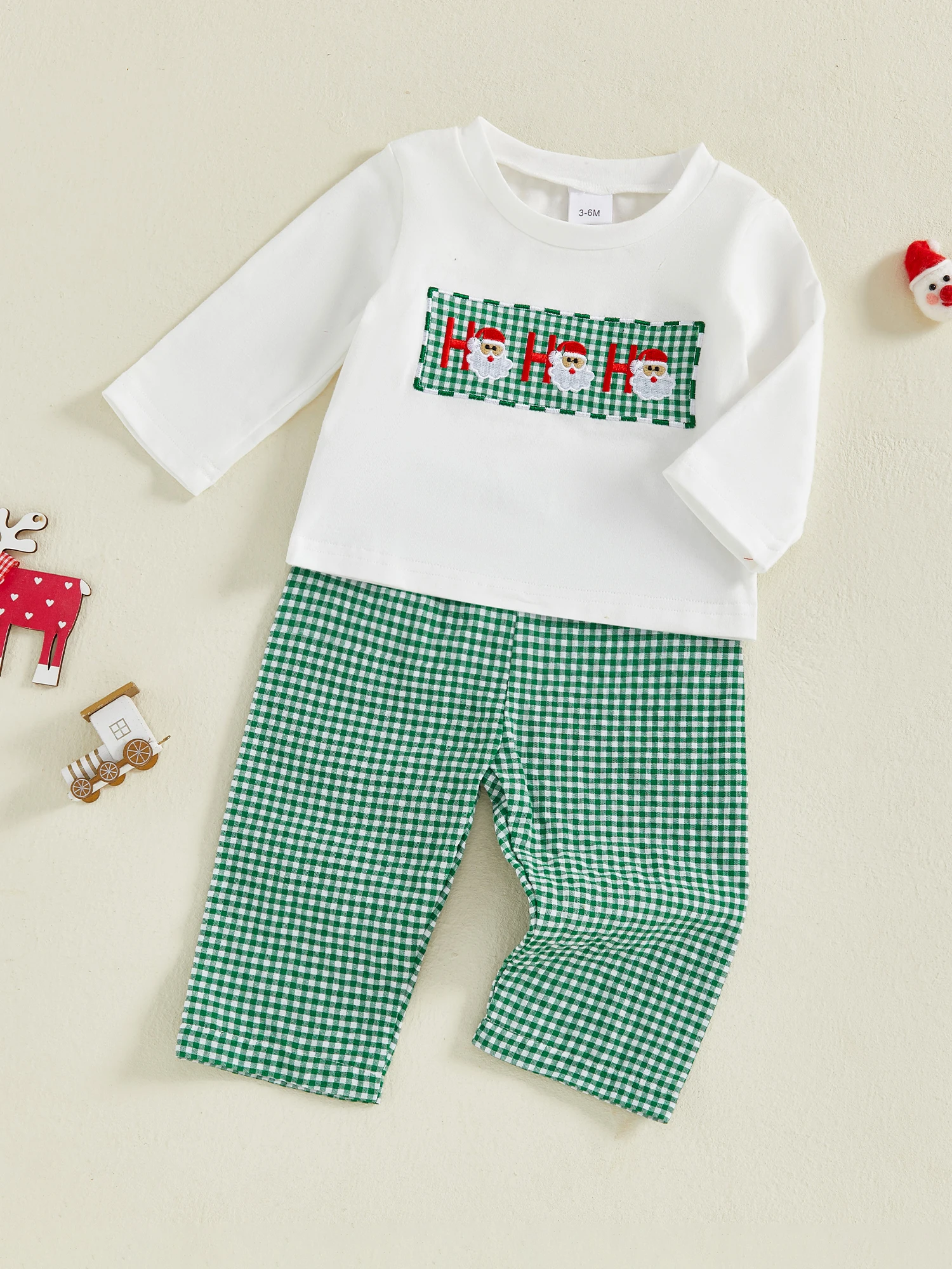 Conjunto de camisa de manga larga con bordado de Papá Noel y pantalones elásticos a cuadros para bebé, ropa de 2 piezas