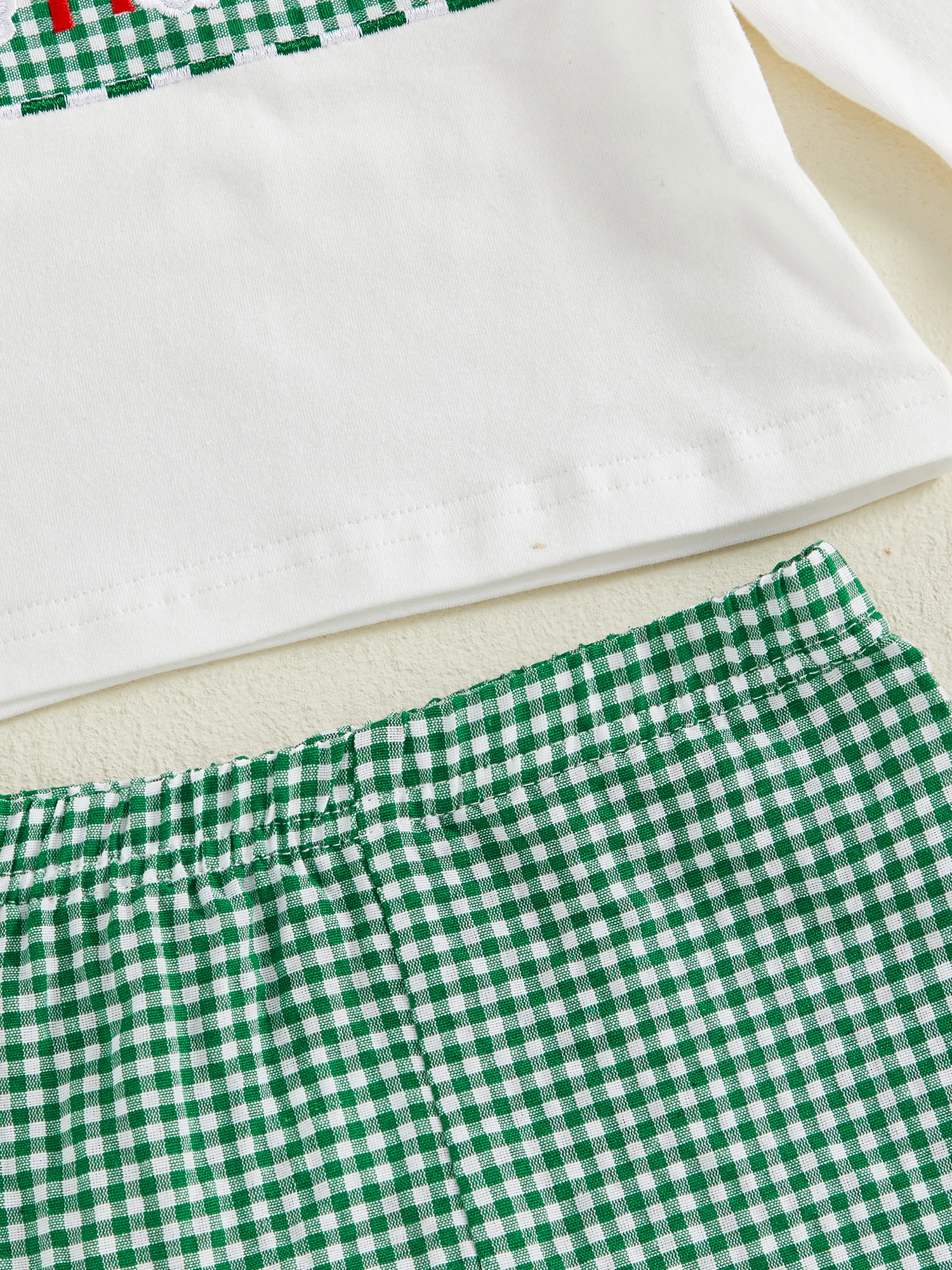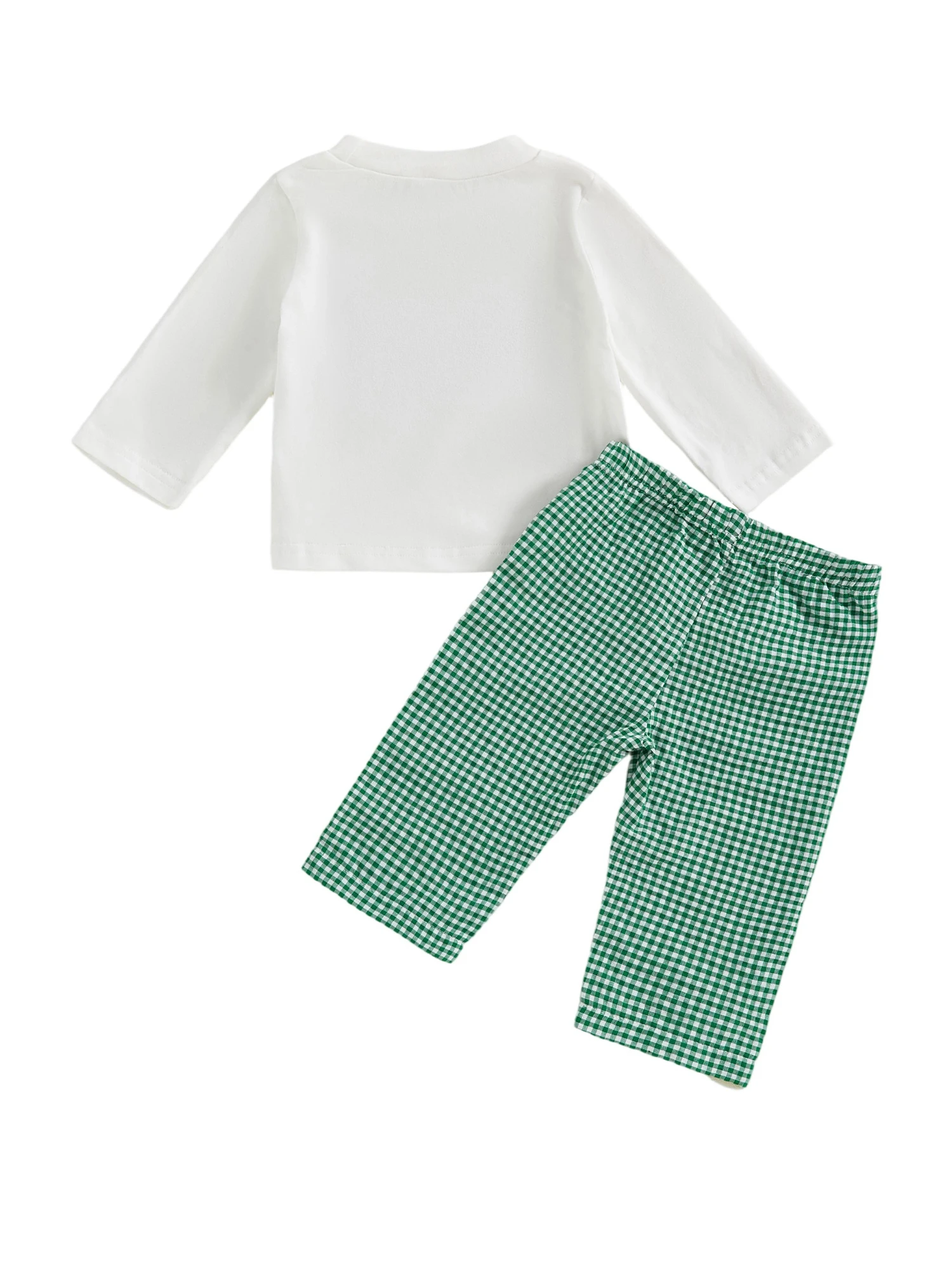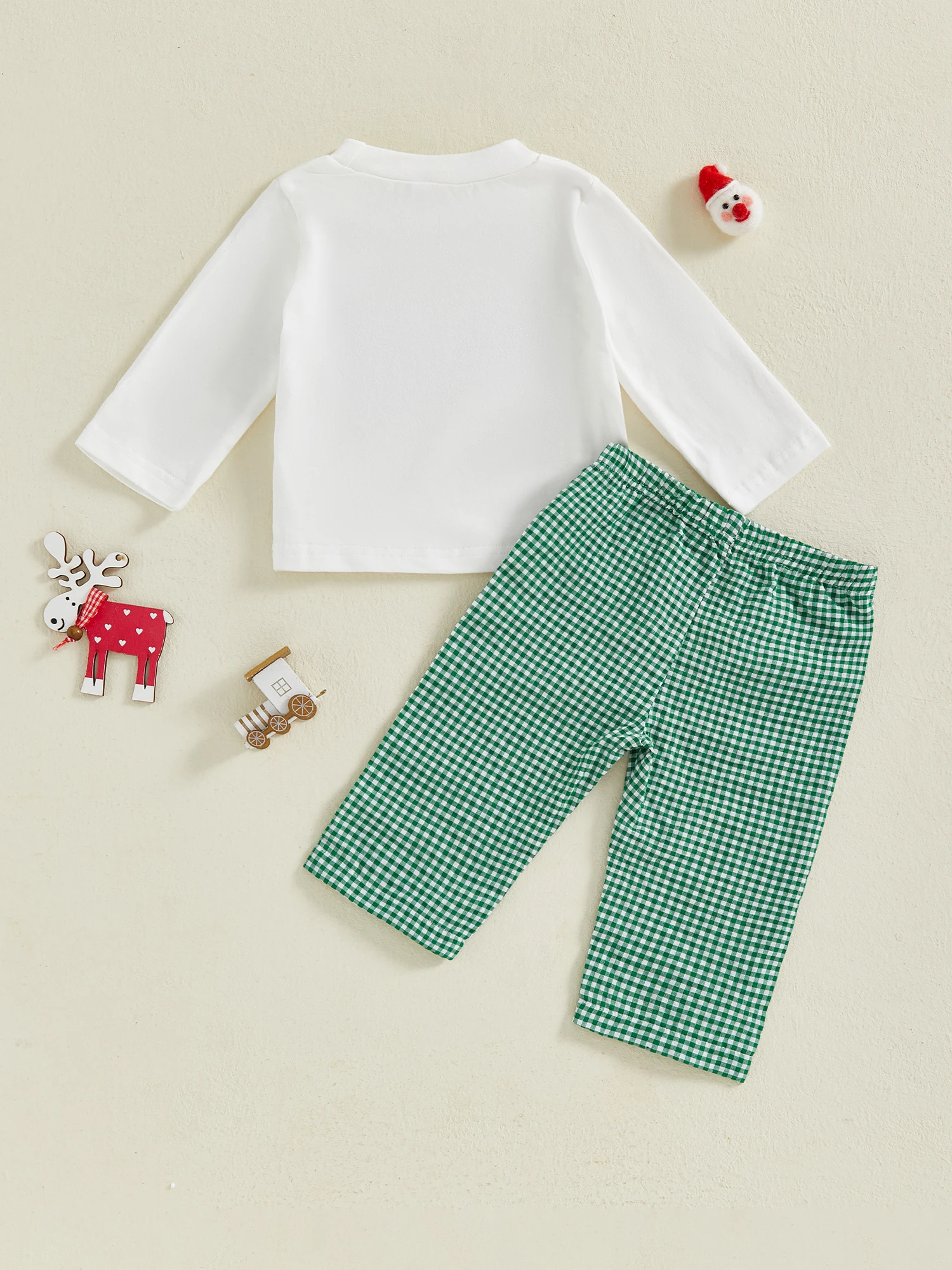 Conjunto de camisa de manga larga con bordado de Papá Noel y pantalones elásticos a cuadros para bebé, ropa de 2 piezas