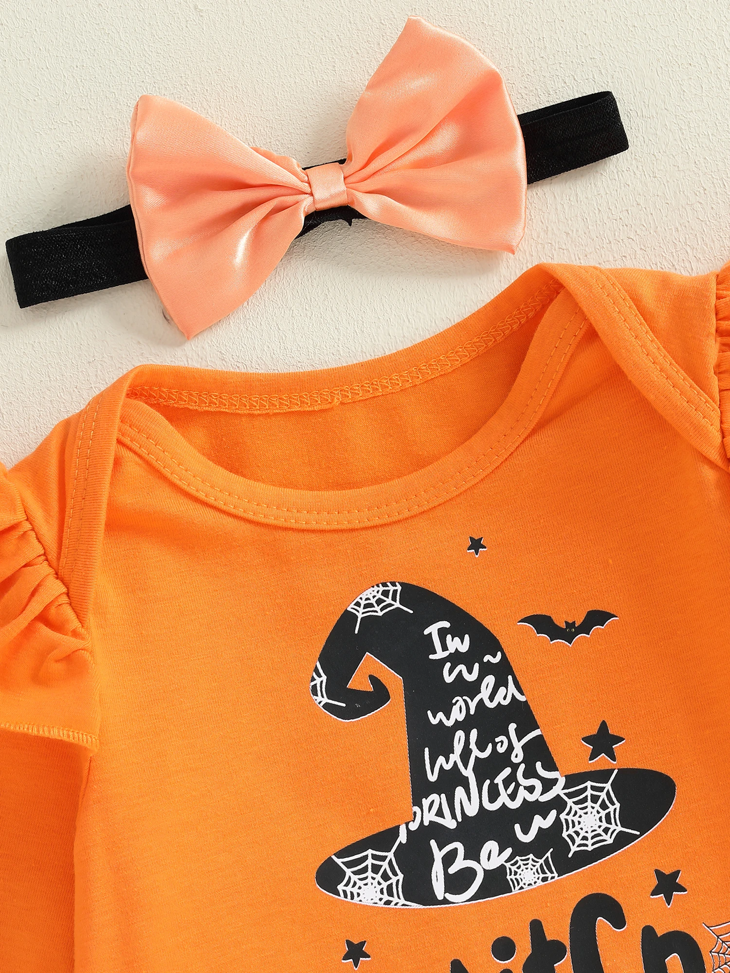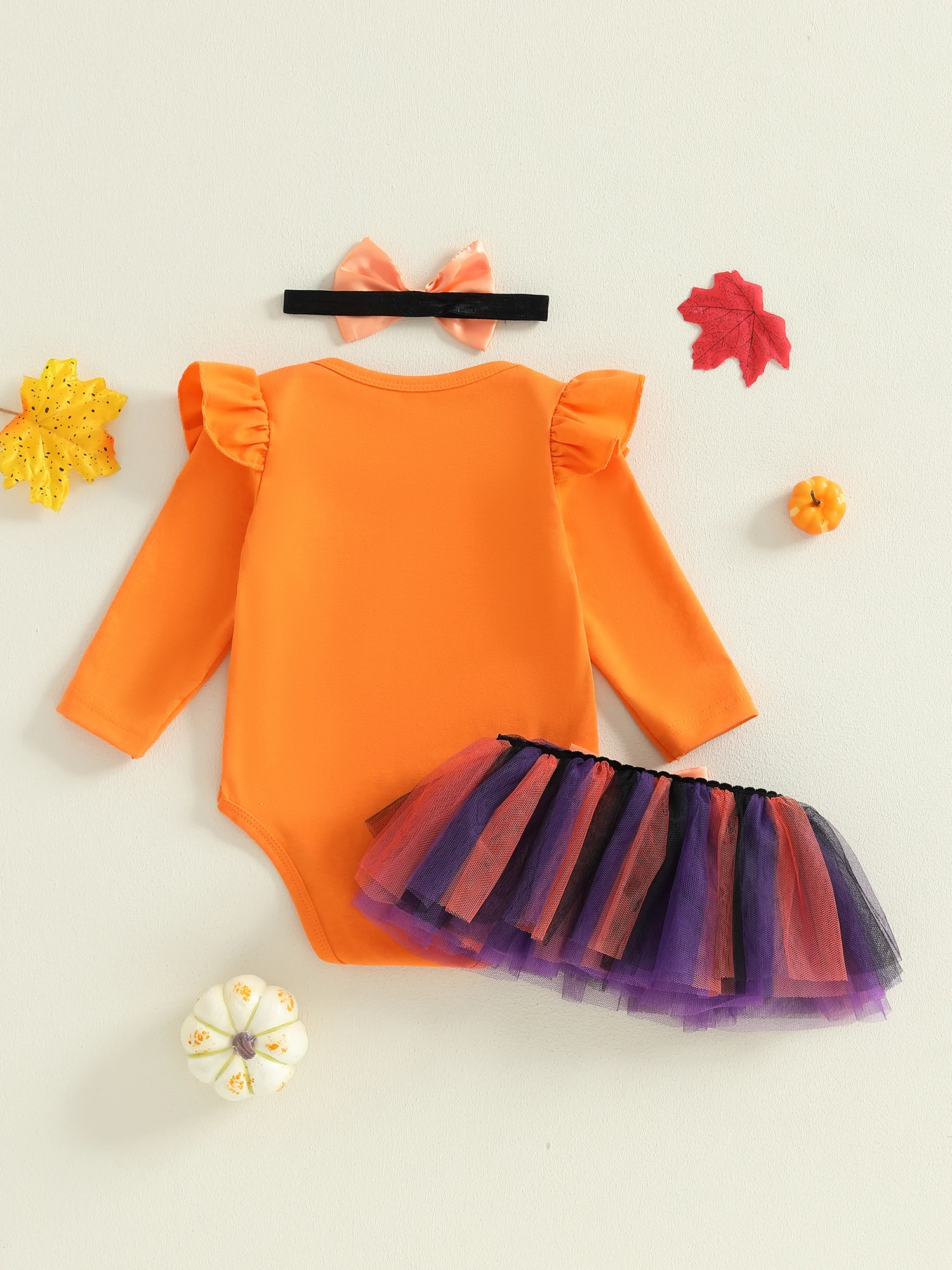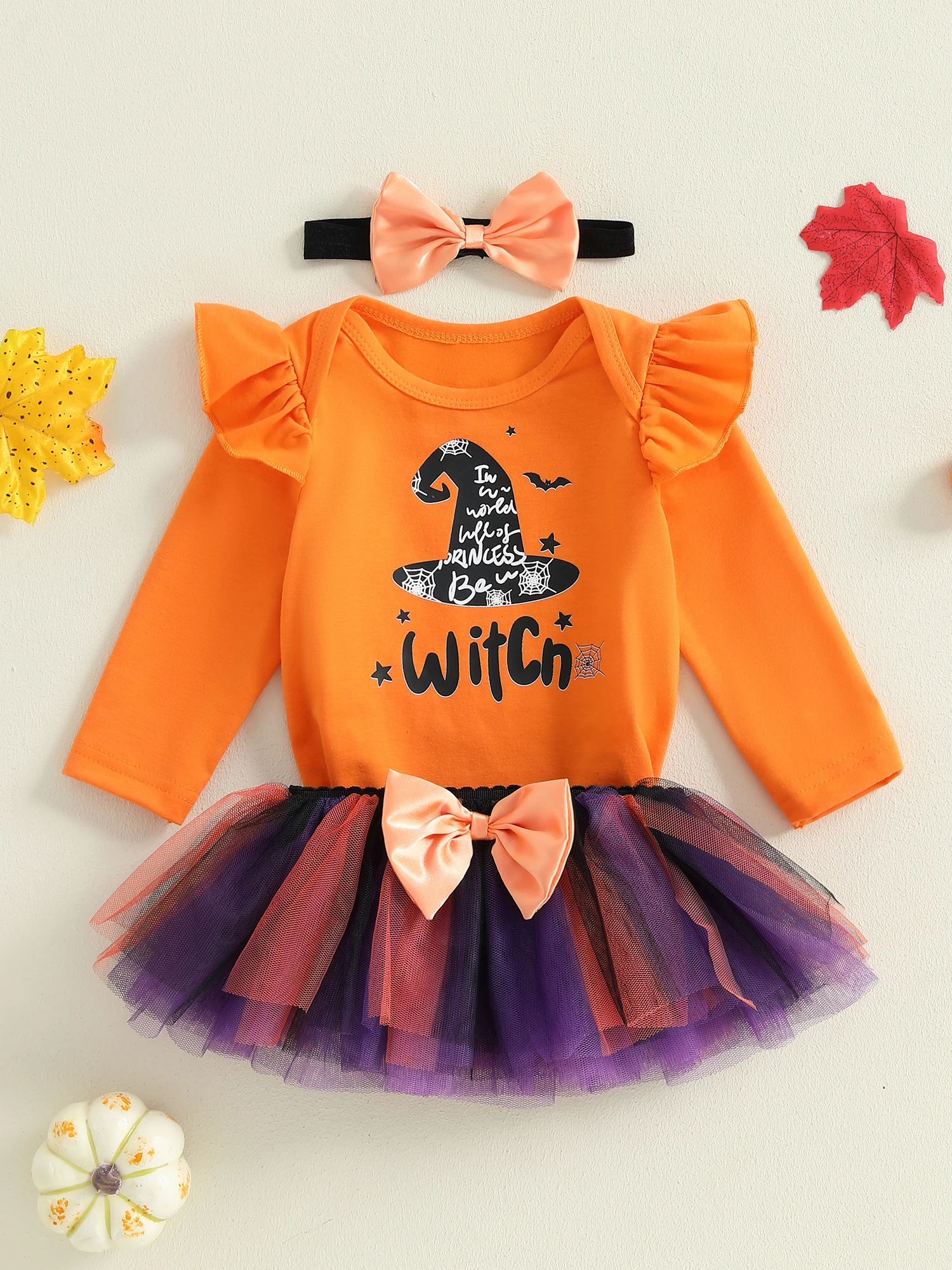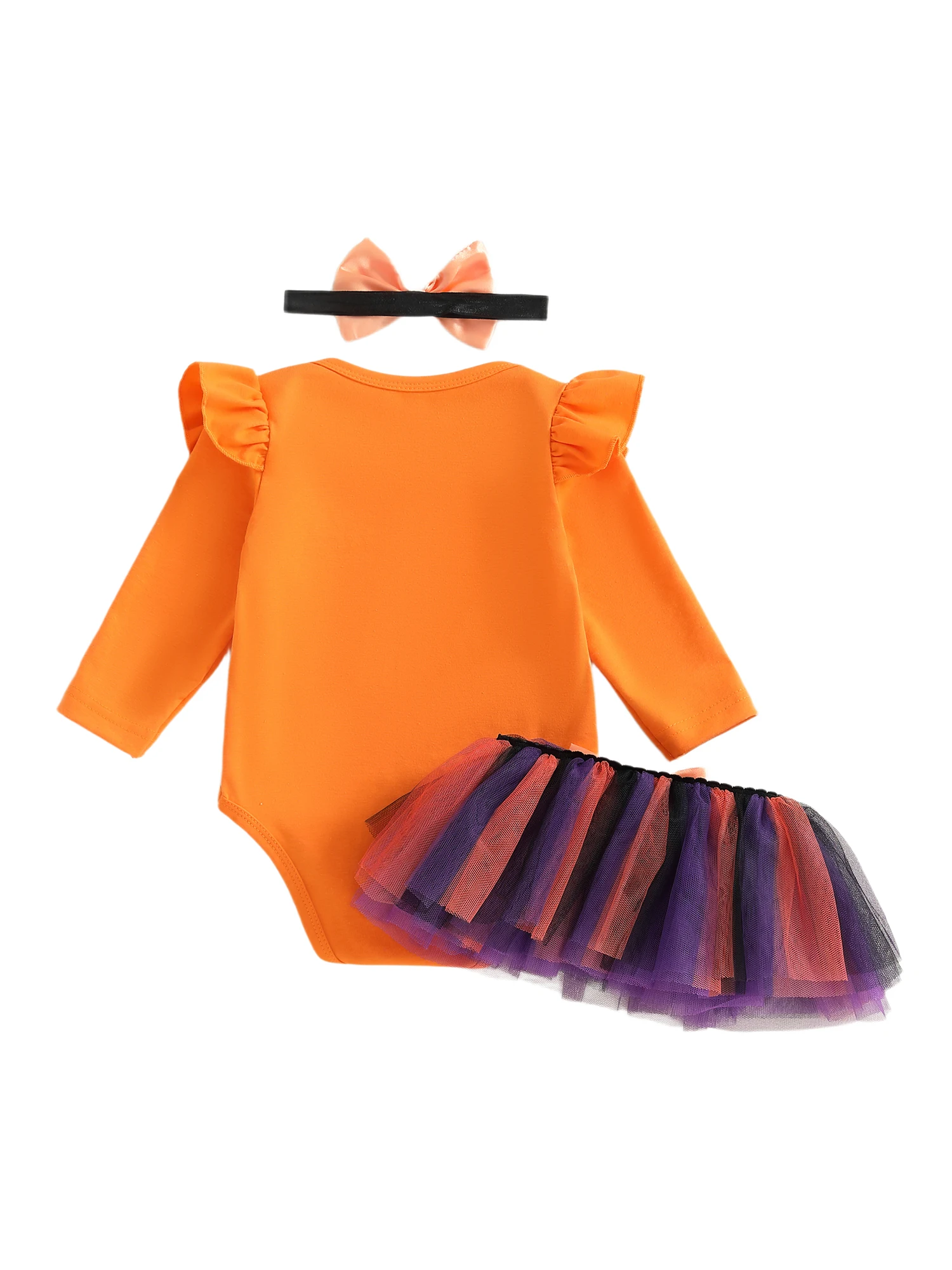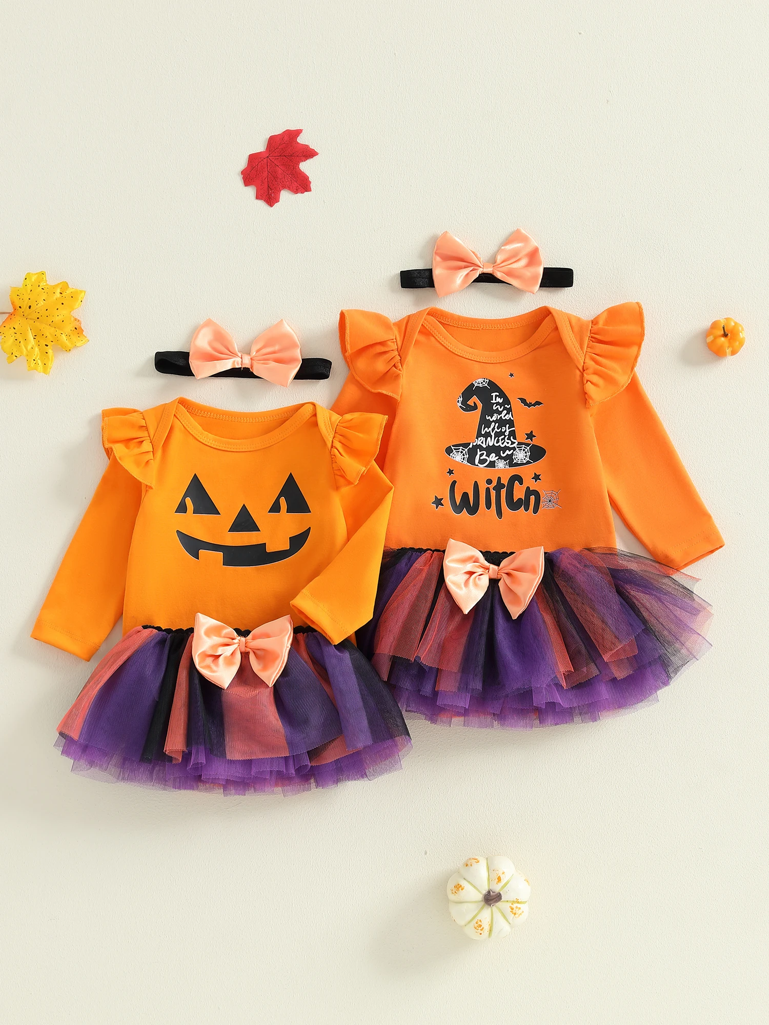 Trajes de Halloween para niña, mameluco estampado de manga larga con cuello redondo y falda de tul y diadema con lazo