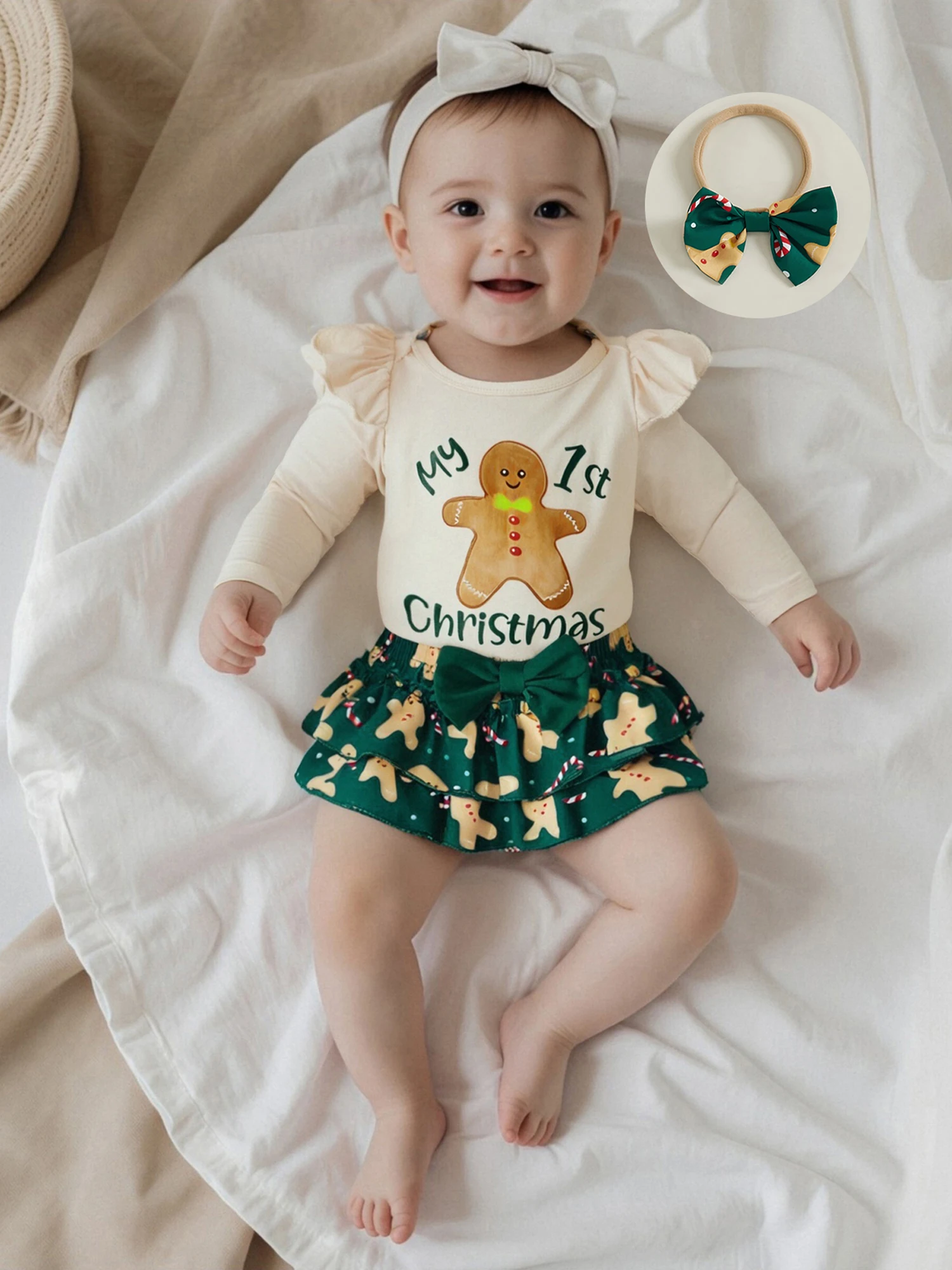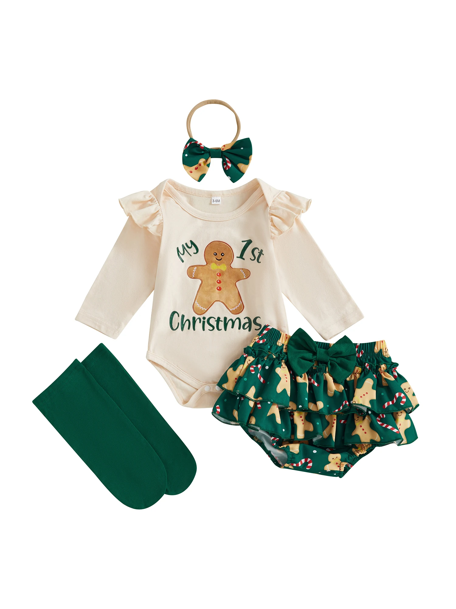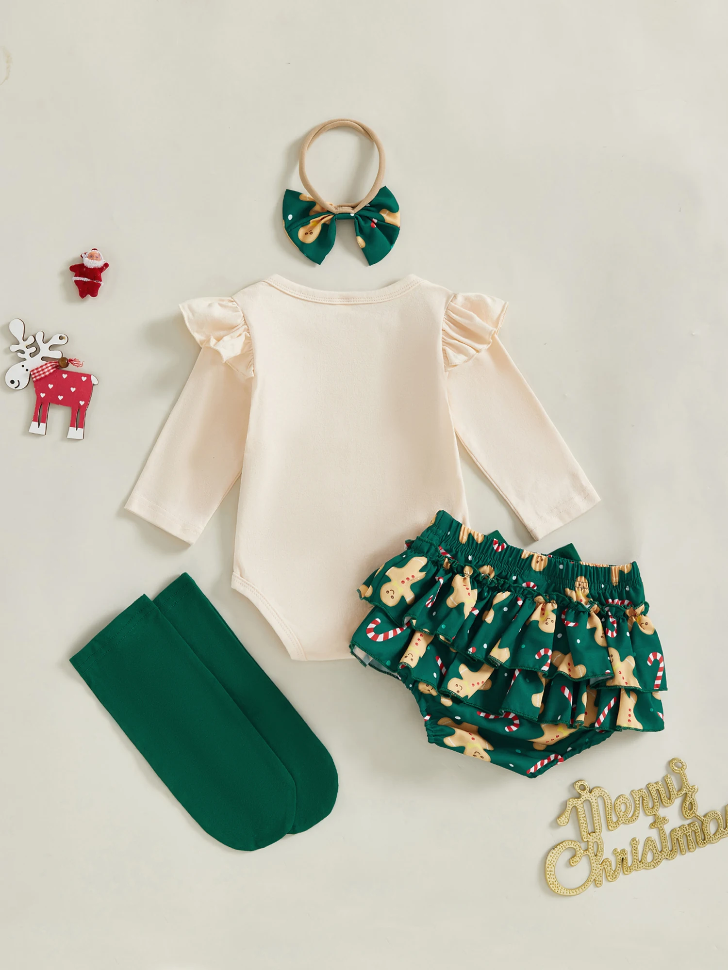 Conjunto de pantalones cortos de Navidad para niñas, mameluco con estampado de Papá Noel/pan de jengibre de manga larga, pantalones cortos de PP escalonados, diadema, calcetines