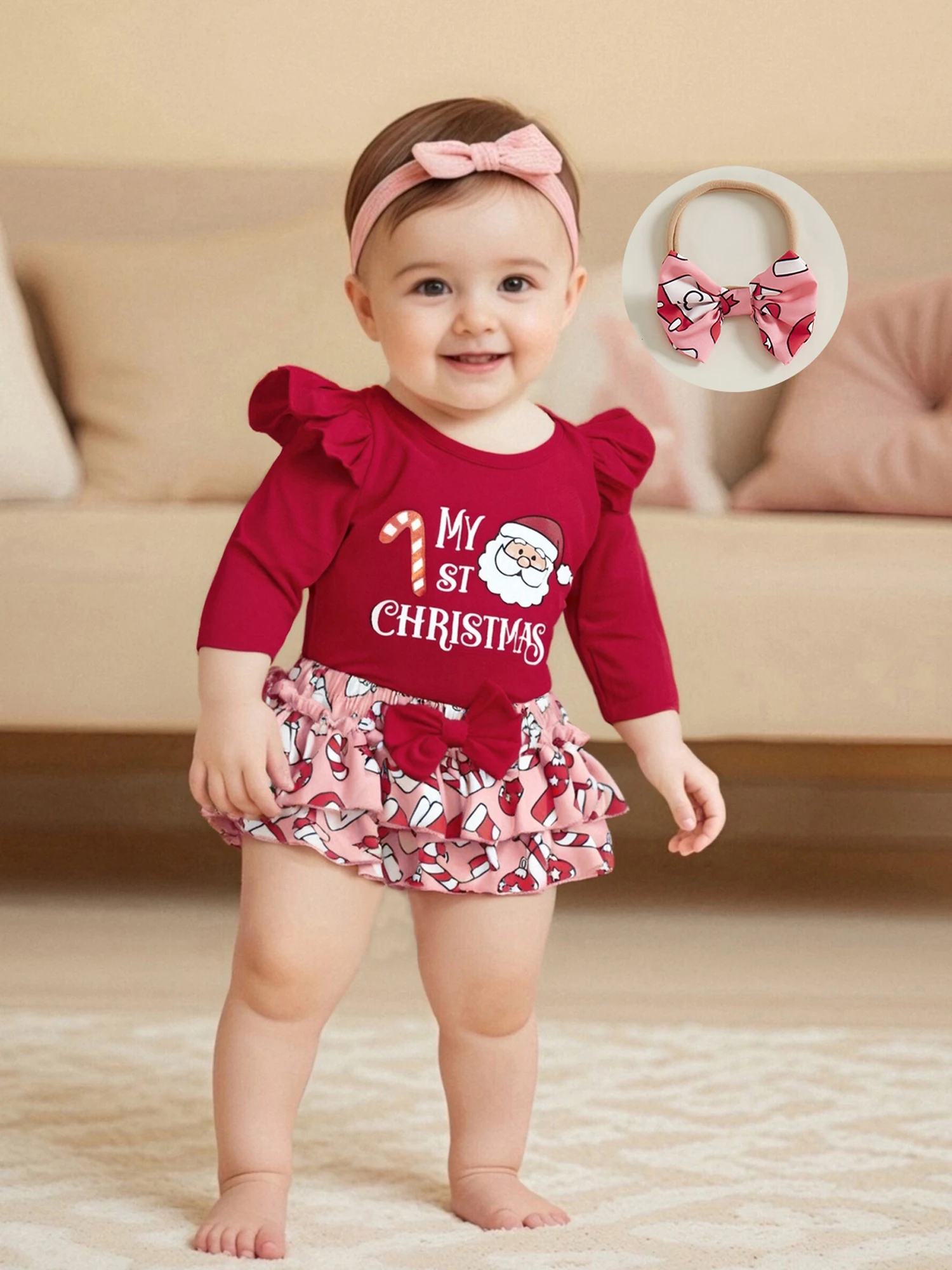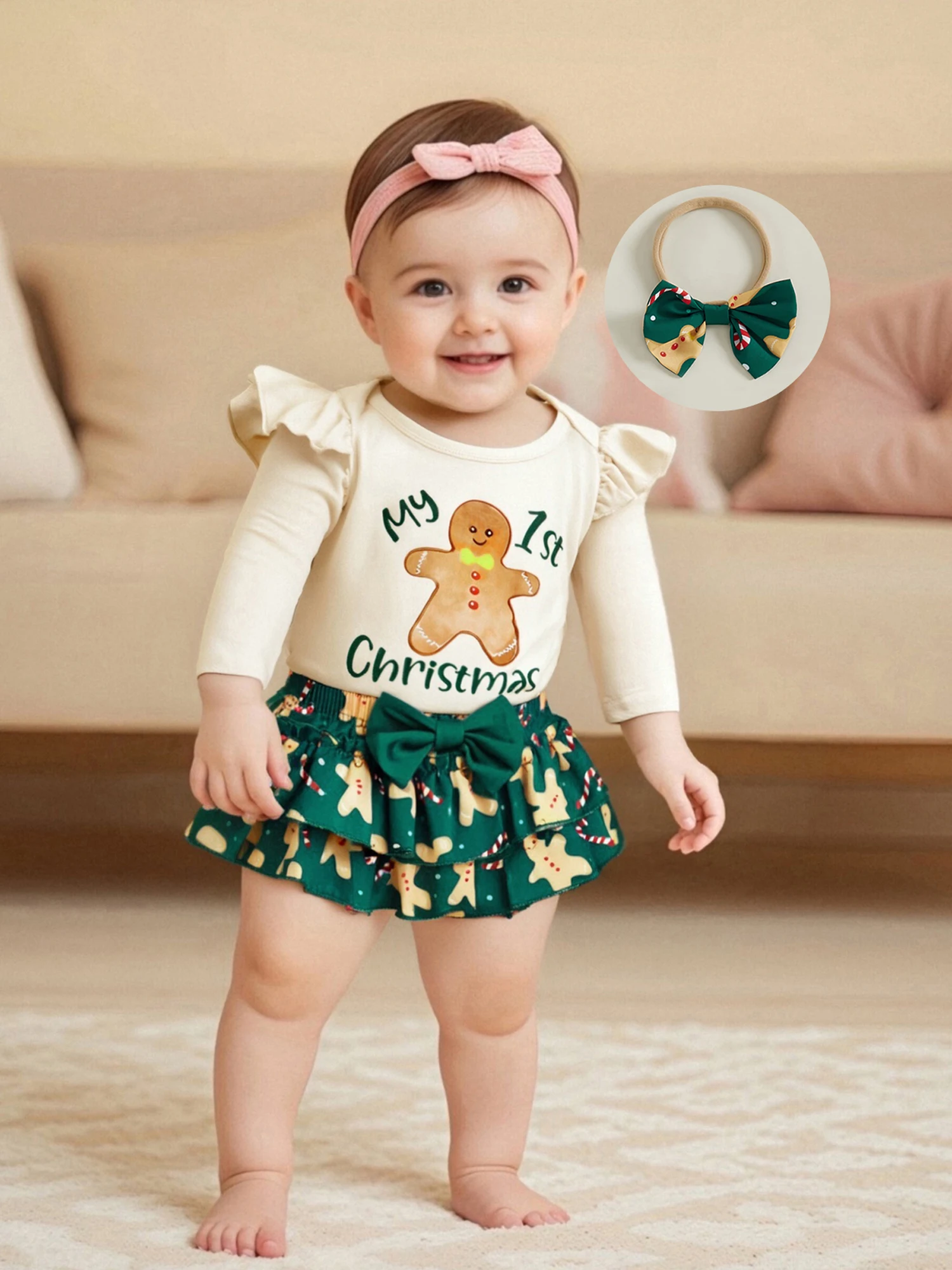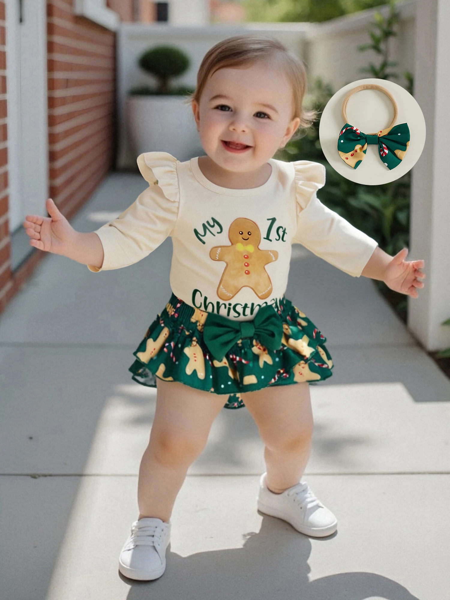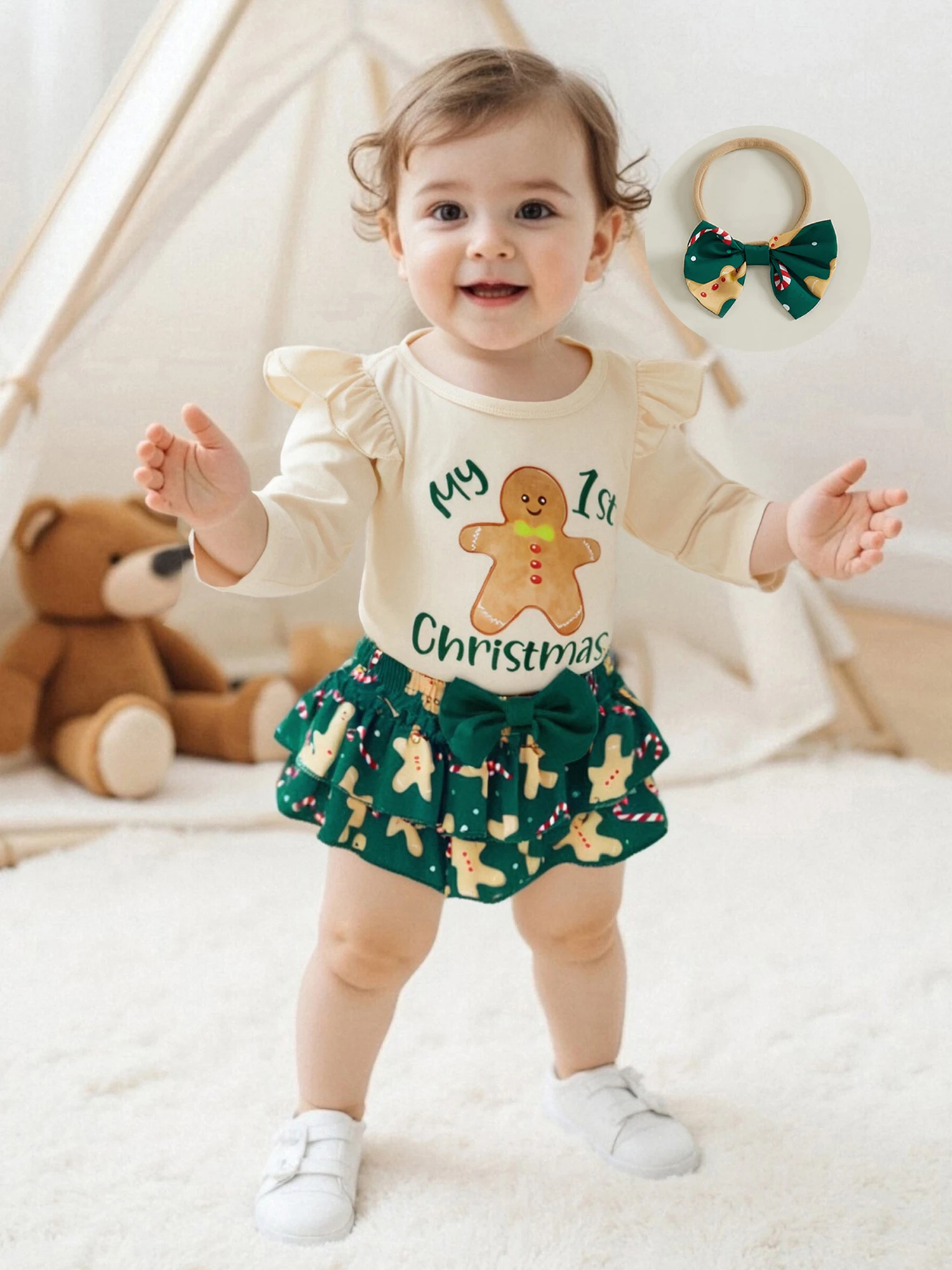 Conjunto de pantalones cortos de Navidad para niñas, mameluco con estampado de Papá Noel/pan de jengibre de manga larga, pantalones cortos de PP escalonados, diadema, calcetines