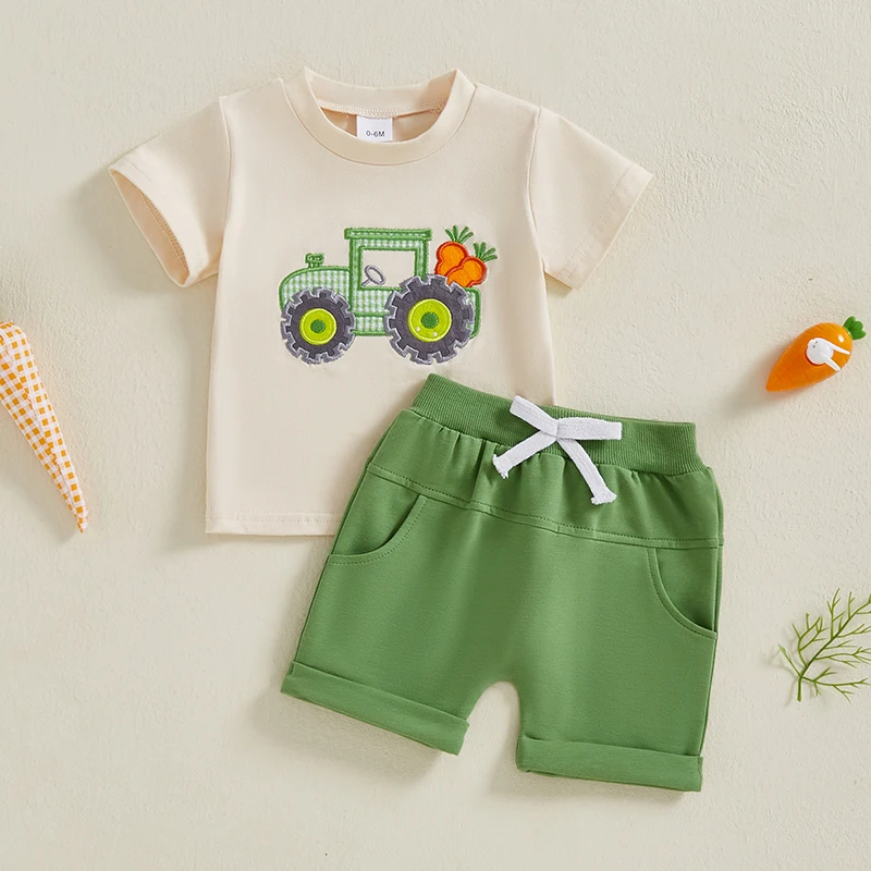 VISgogo Conjuntos de pantalones cortos de verano para bebés, camisetas bordadas de tractor con cuello redondo y manga corta y pantalones cortos de color sólido
