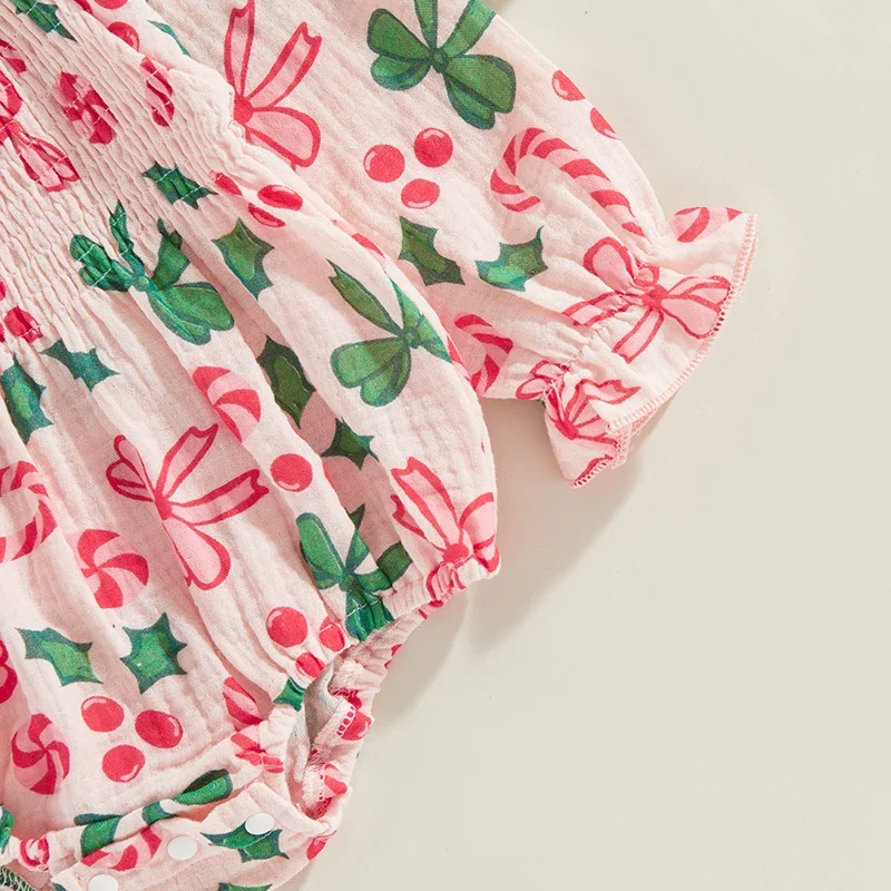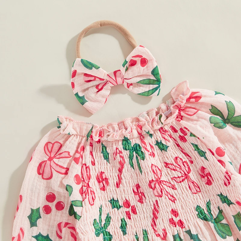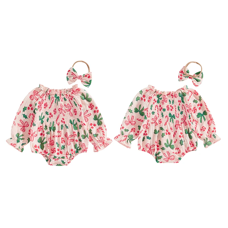 VISgogo Pelele ahumado de Navidad para niña de 0 a 24 meses, mono de burbujas de manga larga con estampado de lazo de bastón de caramelo y diadema con lazo